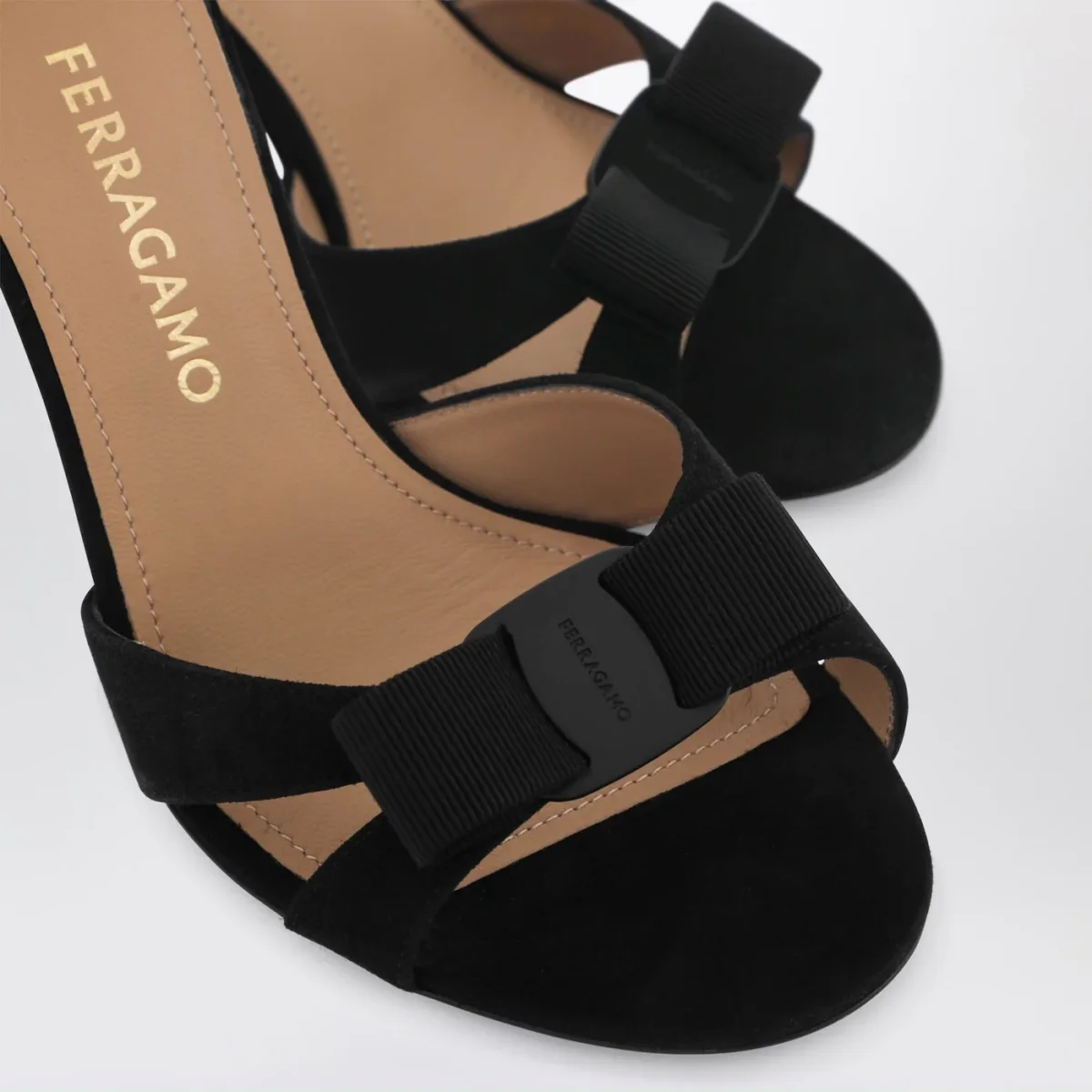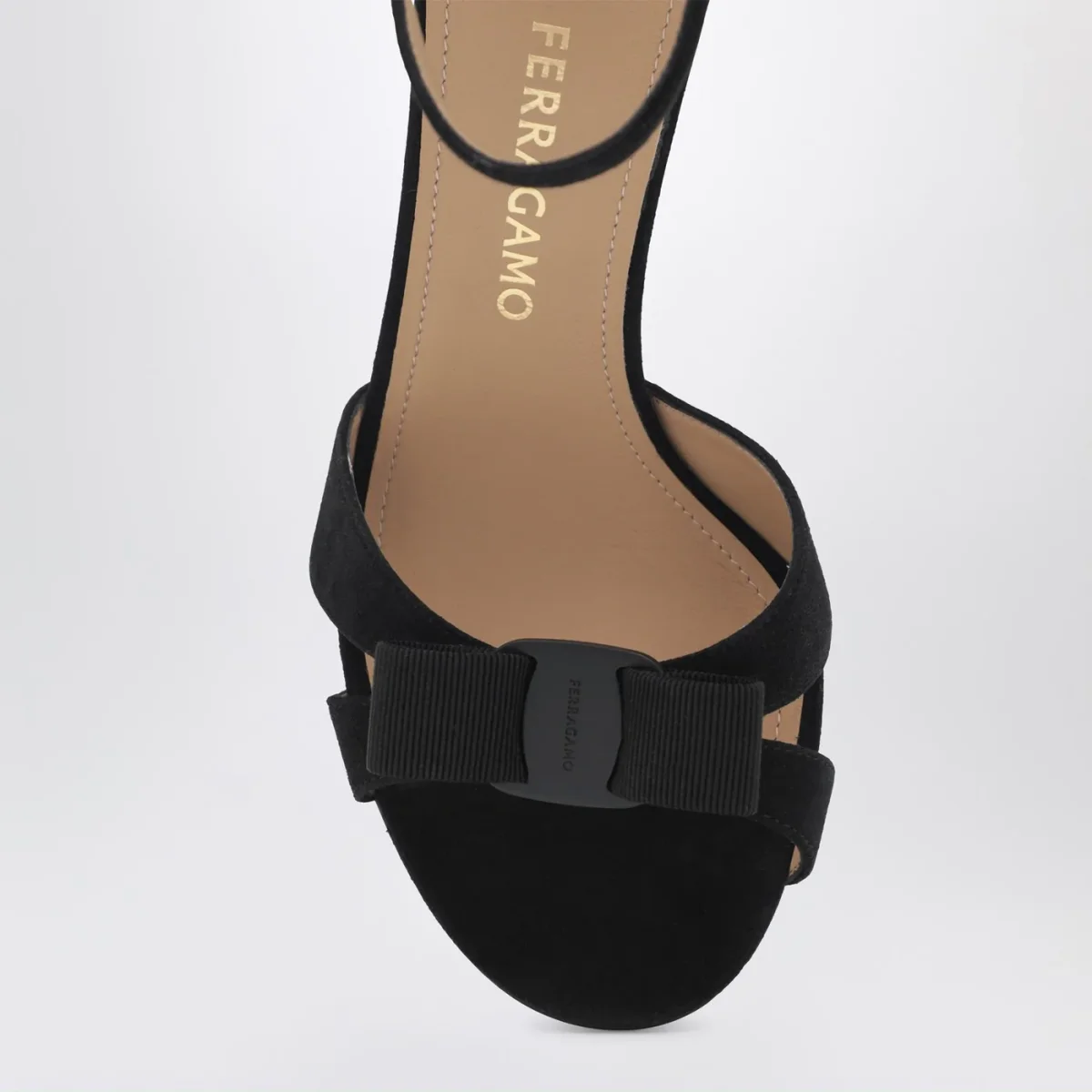 Sandalo di Ferragamo in pelle scamosciata nero• fiocco in tessuto sul davanti• cinturino alla caviglia con fibbia• tacco alto a stiletto• suola in cuoio