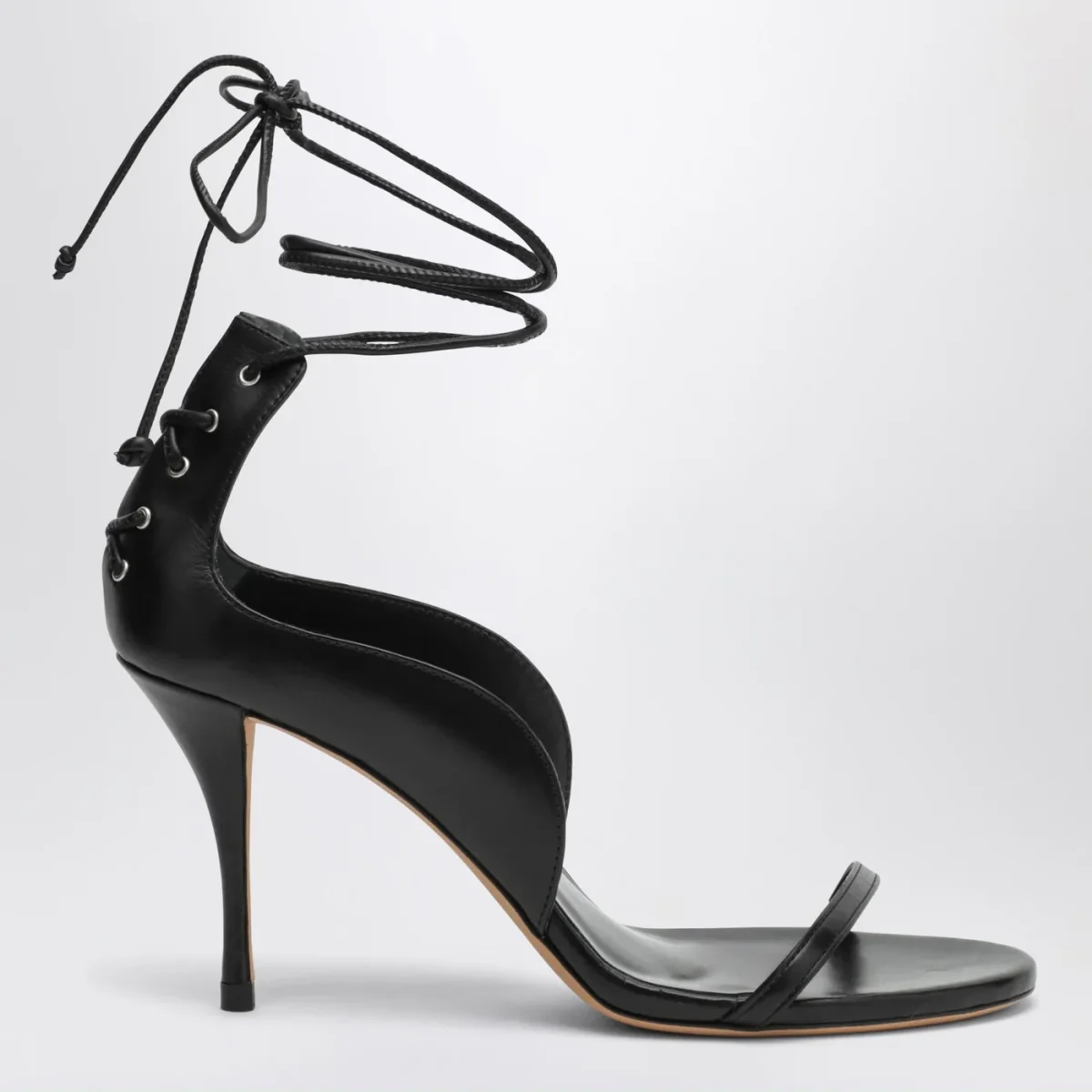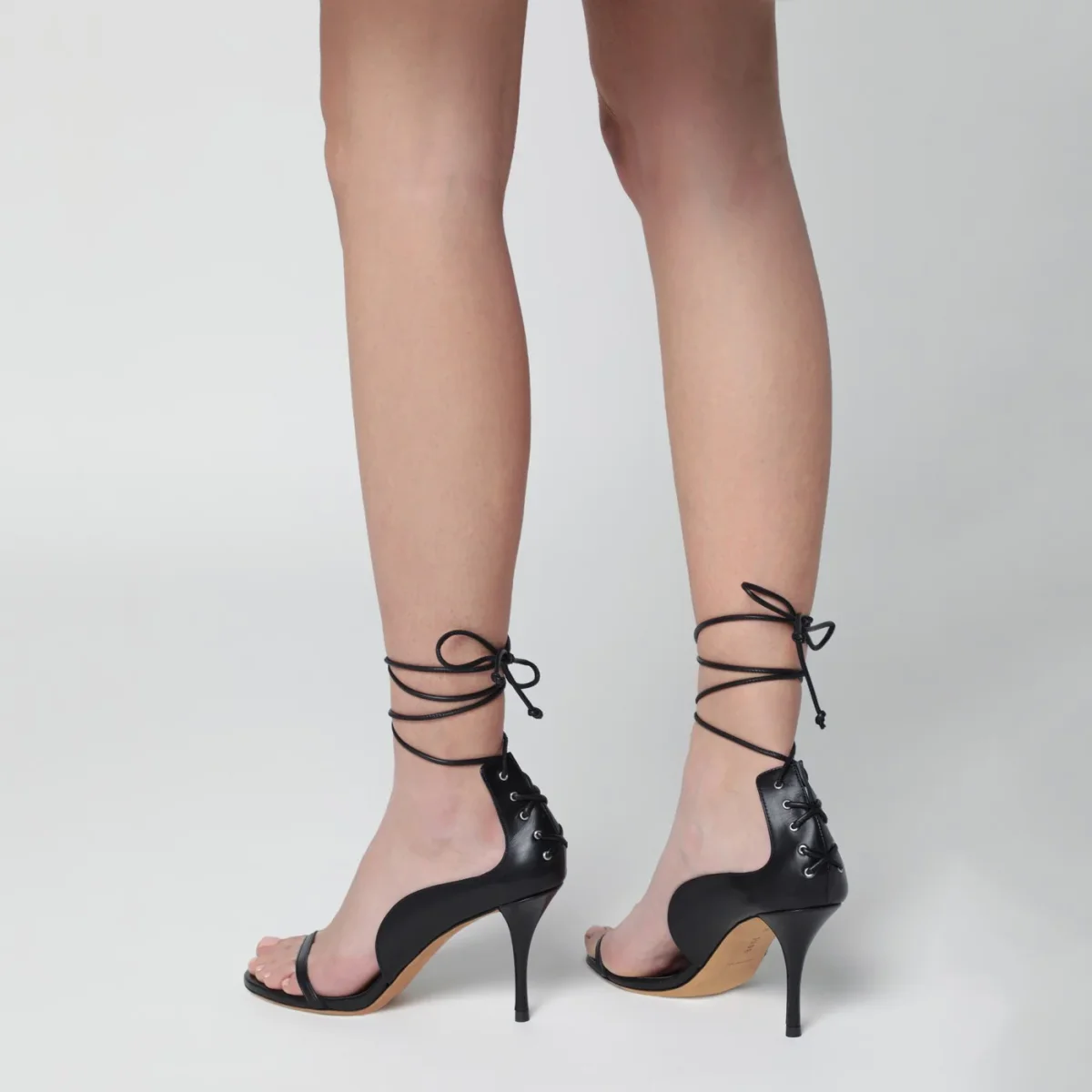 Sandalo di Jude in pelle di vitello nero• tacco a stiletto• tomaia aperta• lacci incrociati sul retro da annodare alla caviglia• suola in cuoio