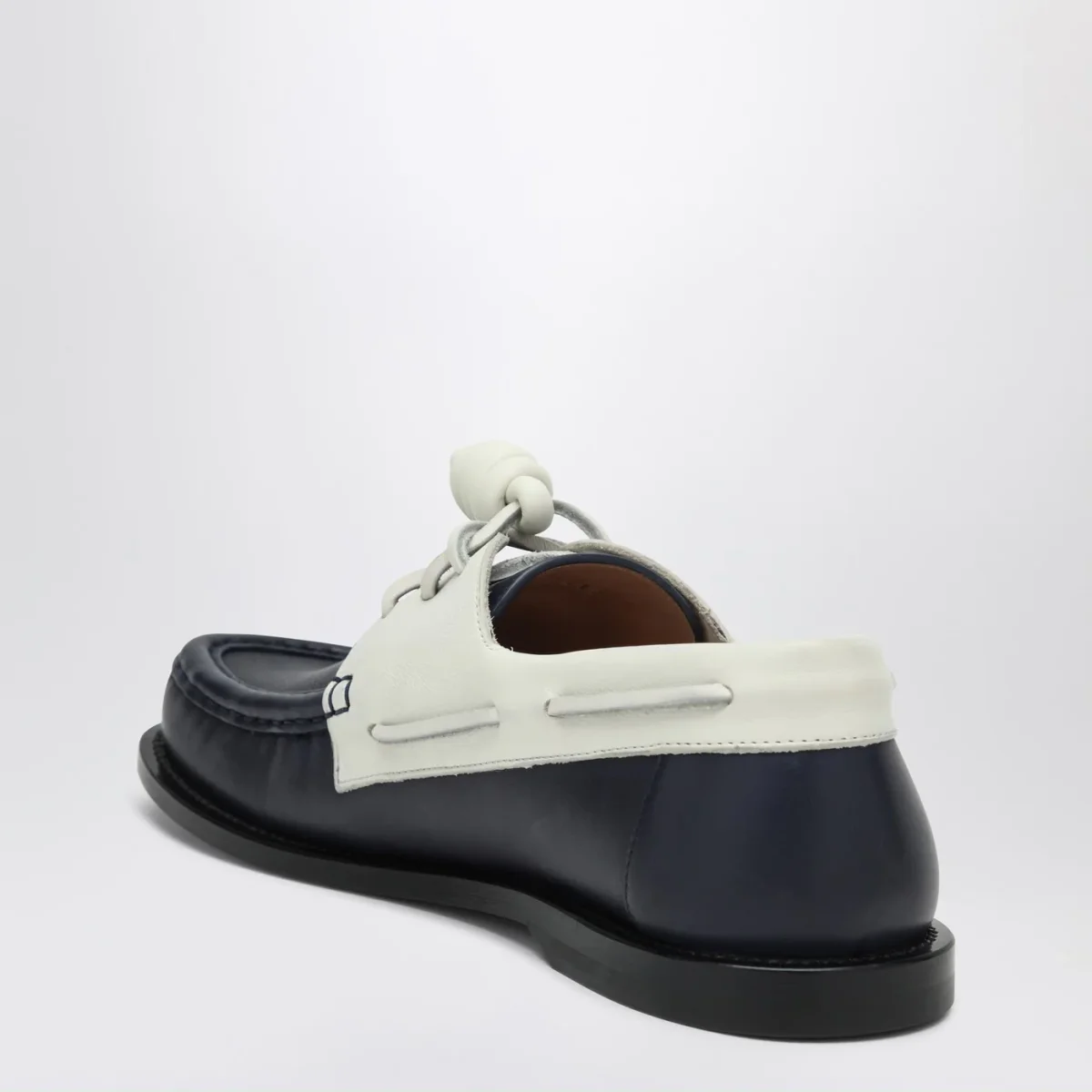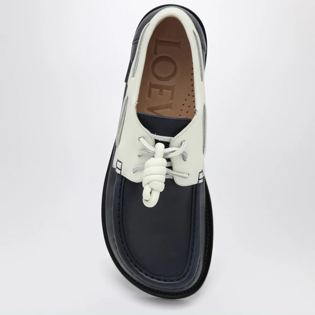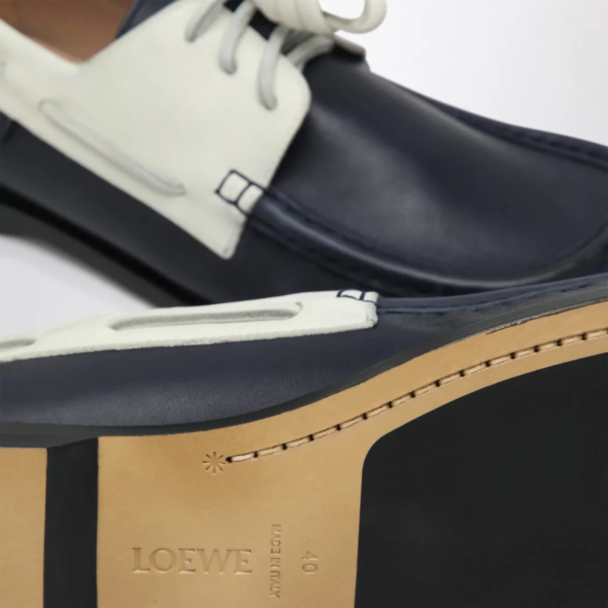 Scarpa da barca di Loewe in pelle di vitello color navy e bianca, caratterizzata da punta tonda a forma di petalo, chiusura con lacci quadrati in pelle, piccola etichetta logo sul lato, soletta flessibile imbottita e suola in cuoio.