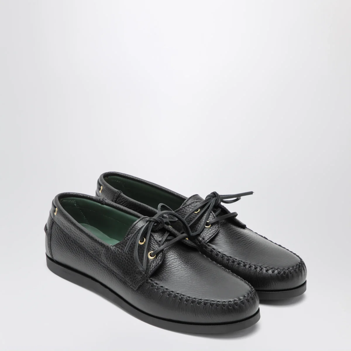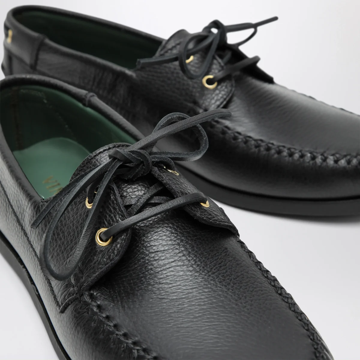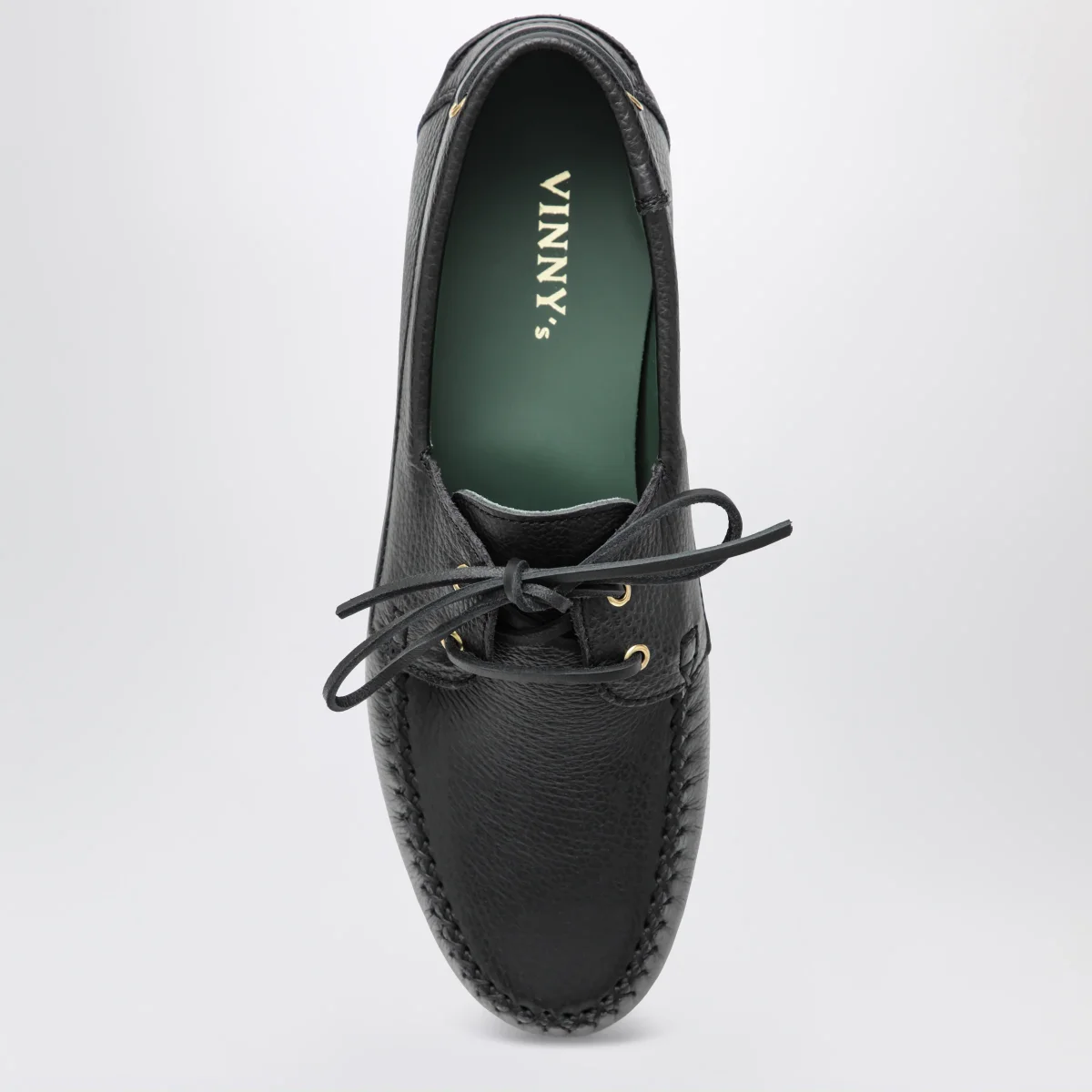 Scarpa da barca di Vinny’s in pelle• Colore: Nero• Occhielli• Suola in gomma Vibram• Cuciture incrociate a mano• Punta tonda• Chiusura con stringhe