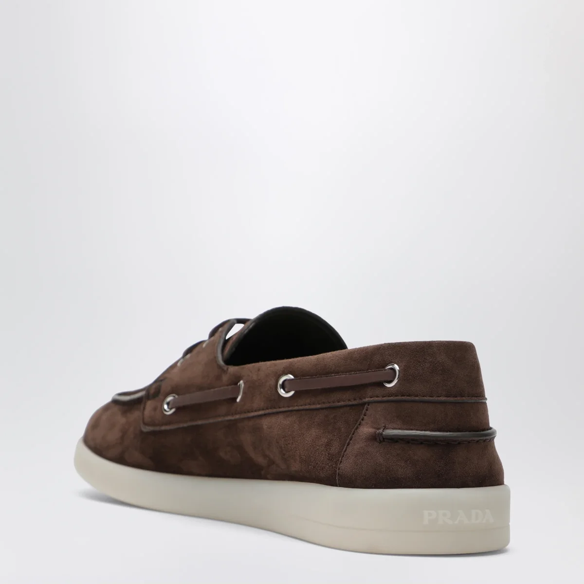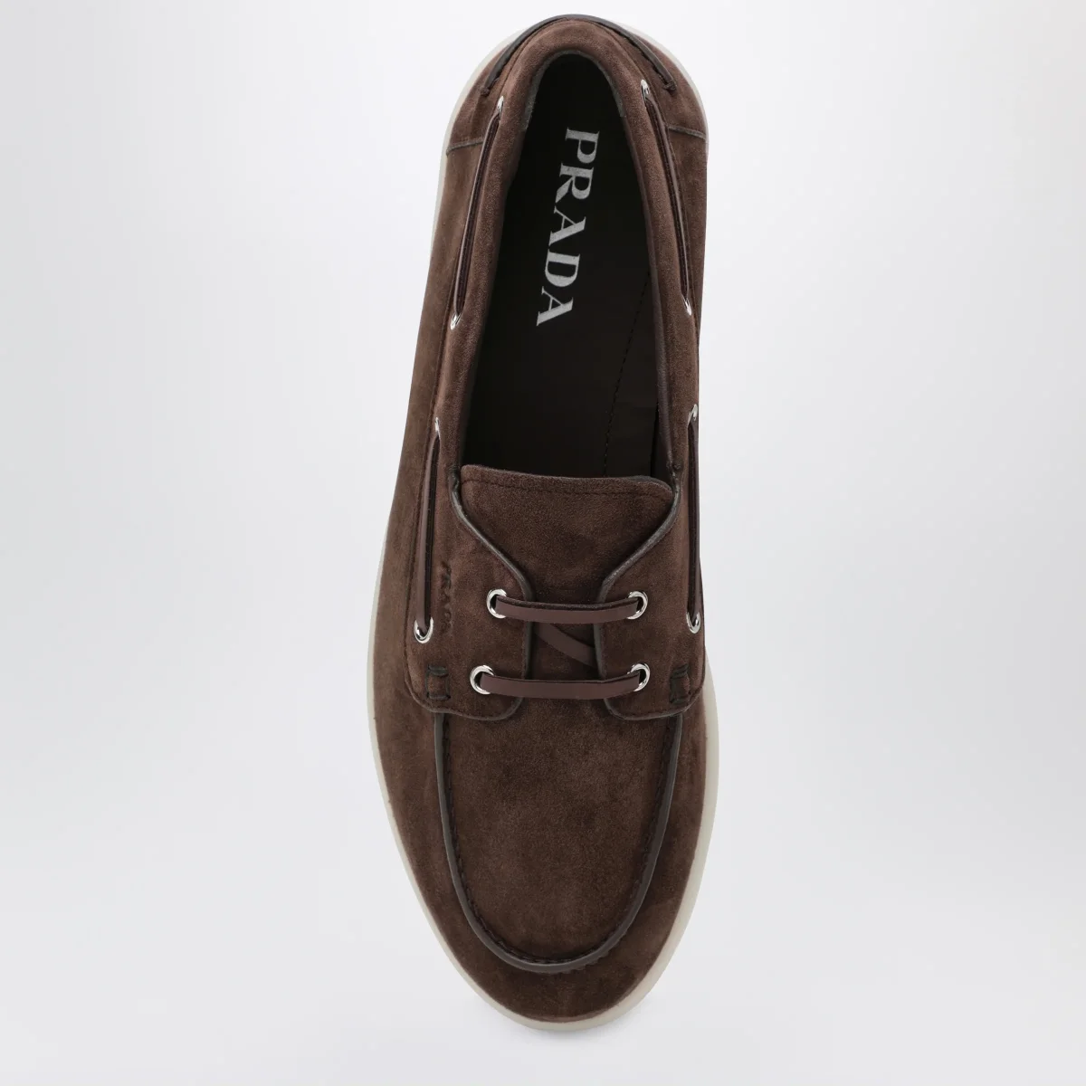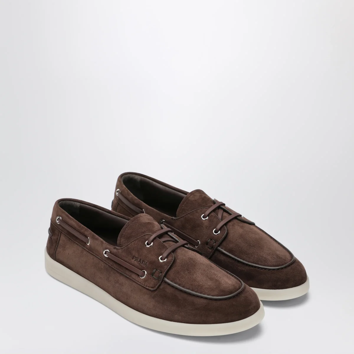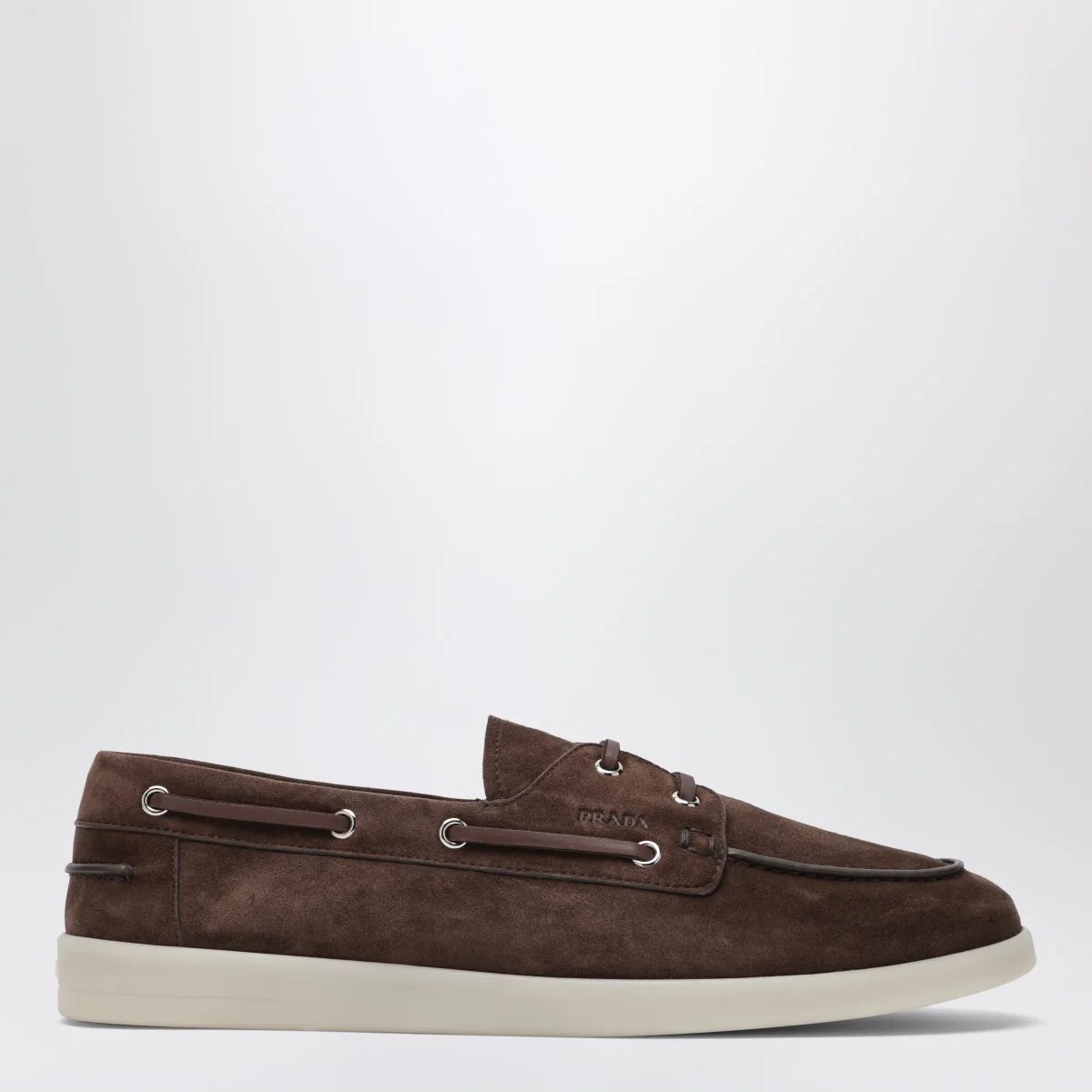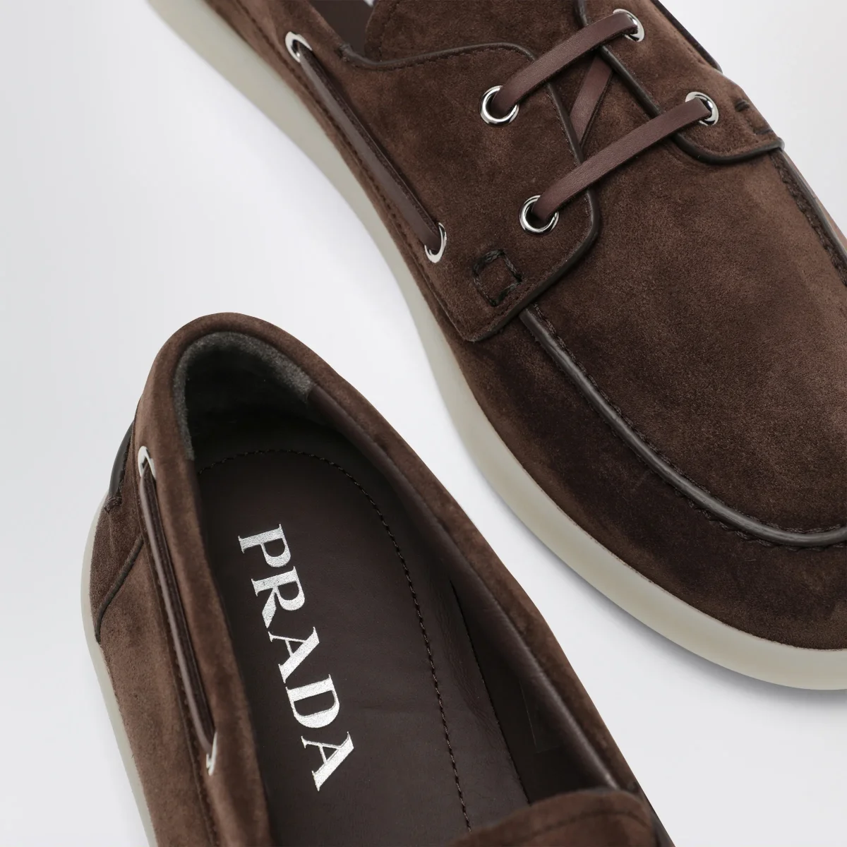 Scarpe da barca in pelle scamosciata di Prada• Colore: Marrone• Modello slip-on con allacciatura frontale regolabile a due occhielli• Punta a mandorla• Tomaia in suede con vaschetta cucita e logo impresso sul lato• Lacci in pelle ed occhielli in metallo• Suola in gomma con logo in rilievo sul retro