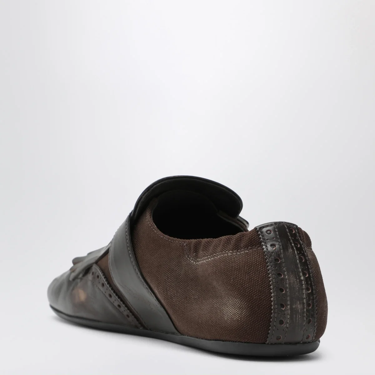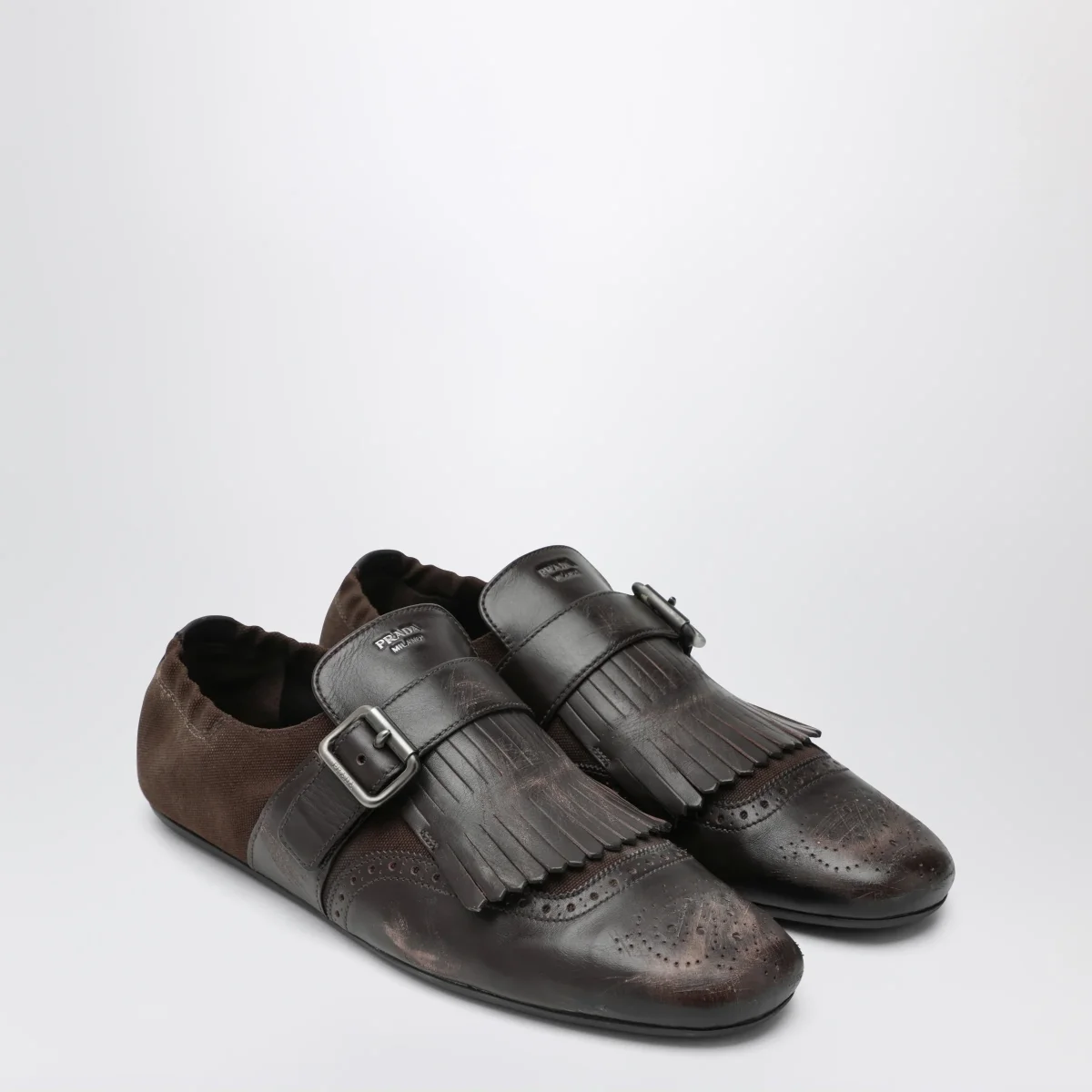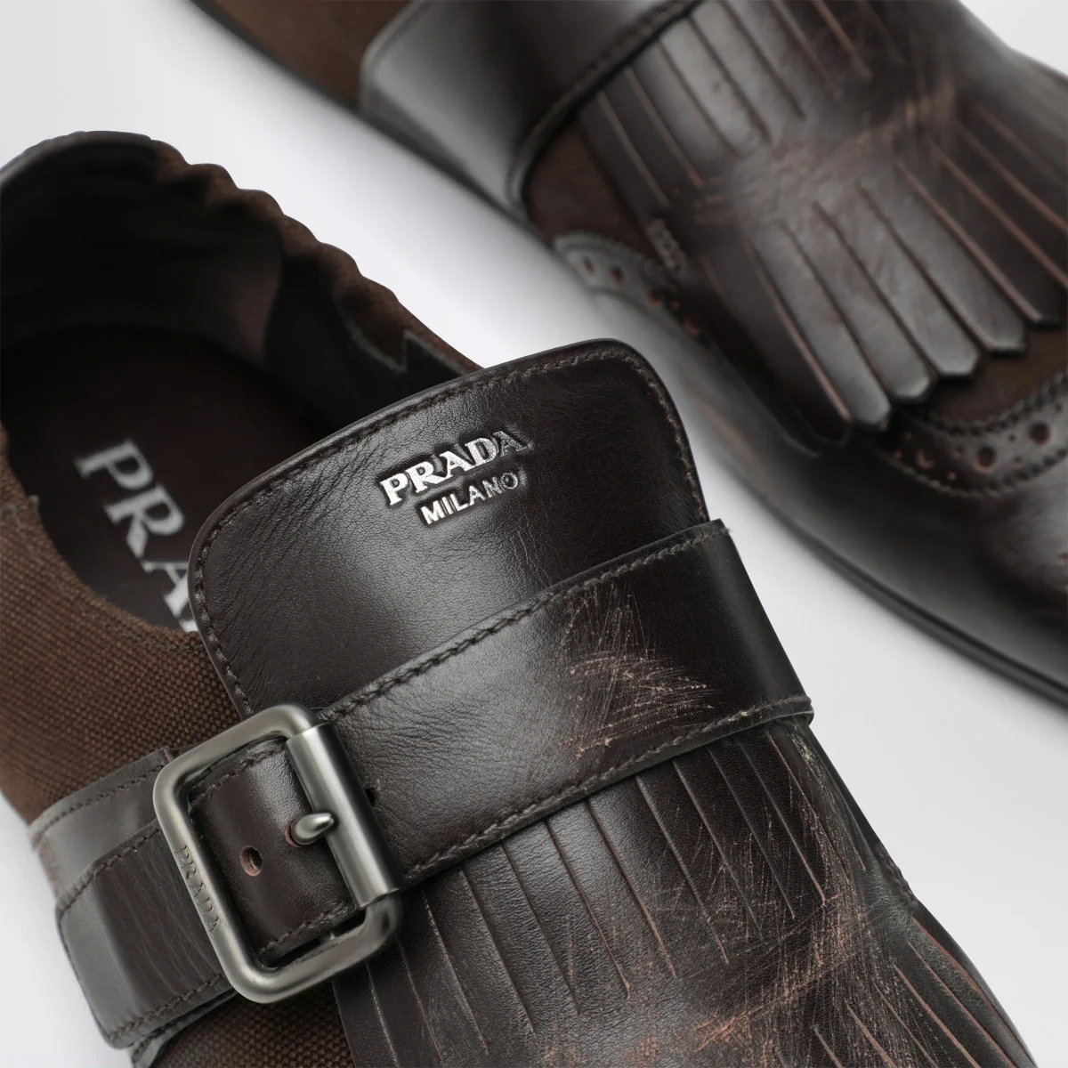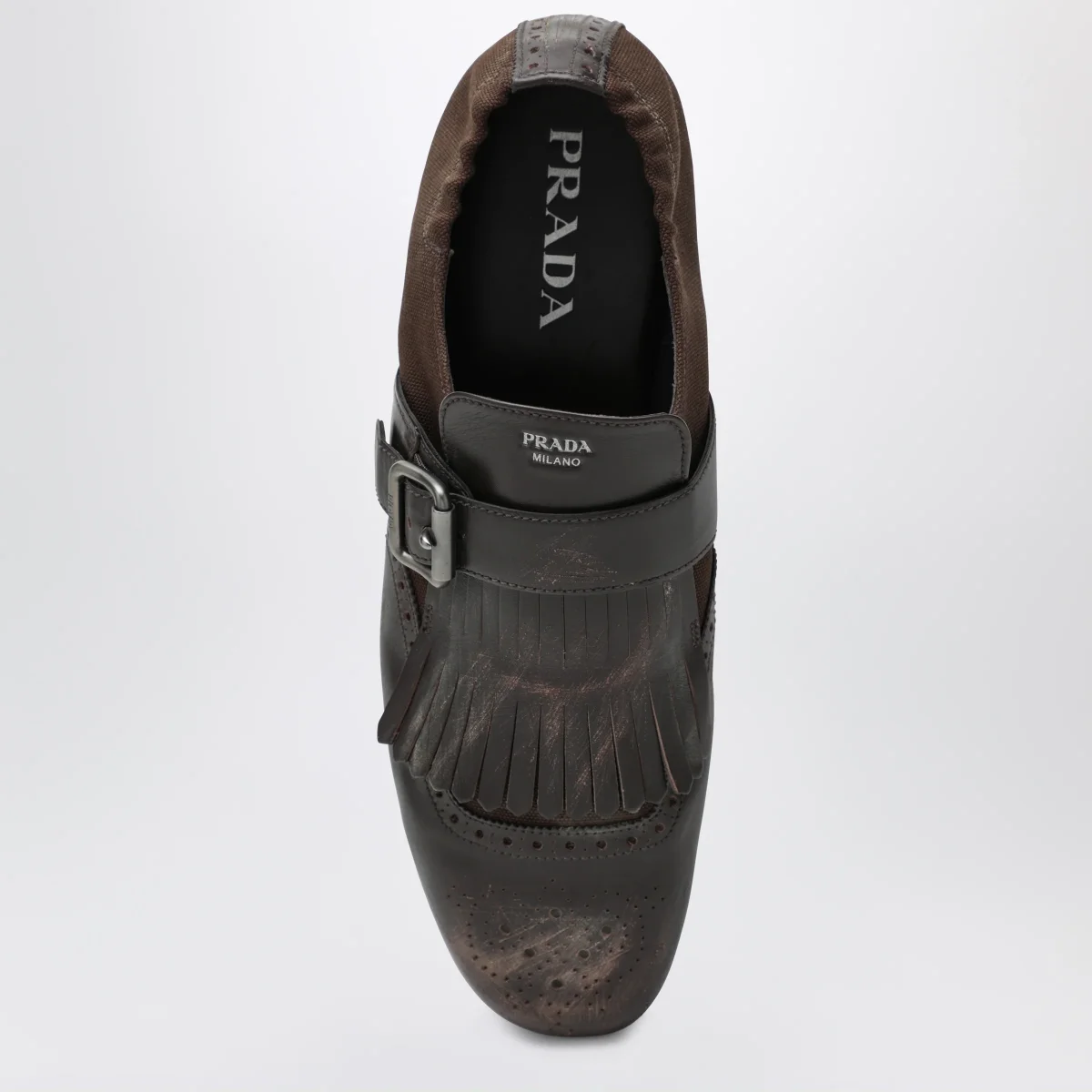 Scarpe di Prada realizzate in pelle con un finish vintage• Colore: Moro• Stringate e arricchite frange e da un classico motivo traforato Brogue• Con fibbia• Tomaia con forature e lavorazione invecchiata• Suola sottile in gomma• Sottopiede estraibile rivestito di pelle