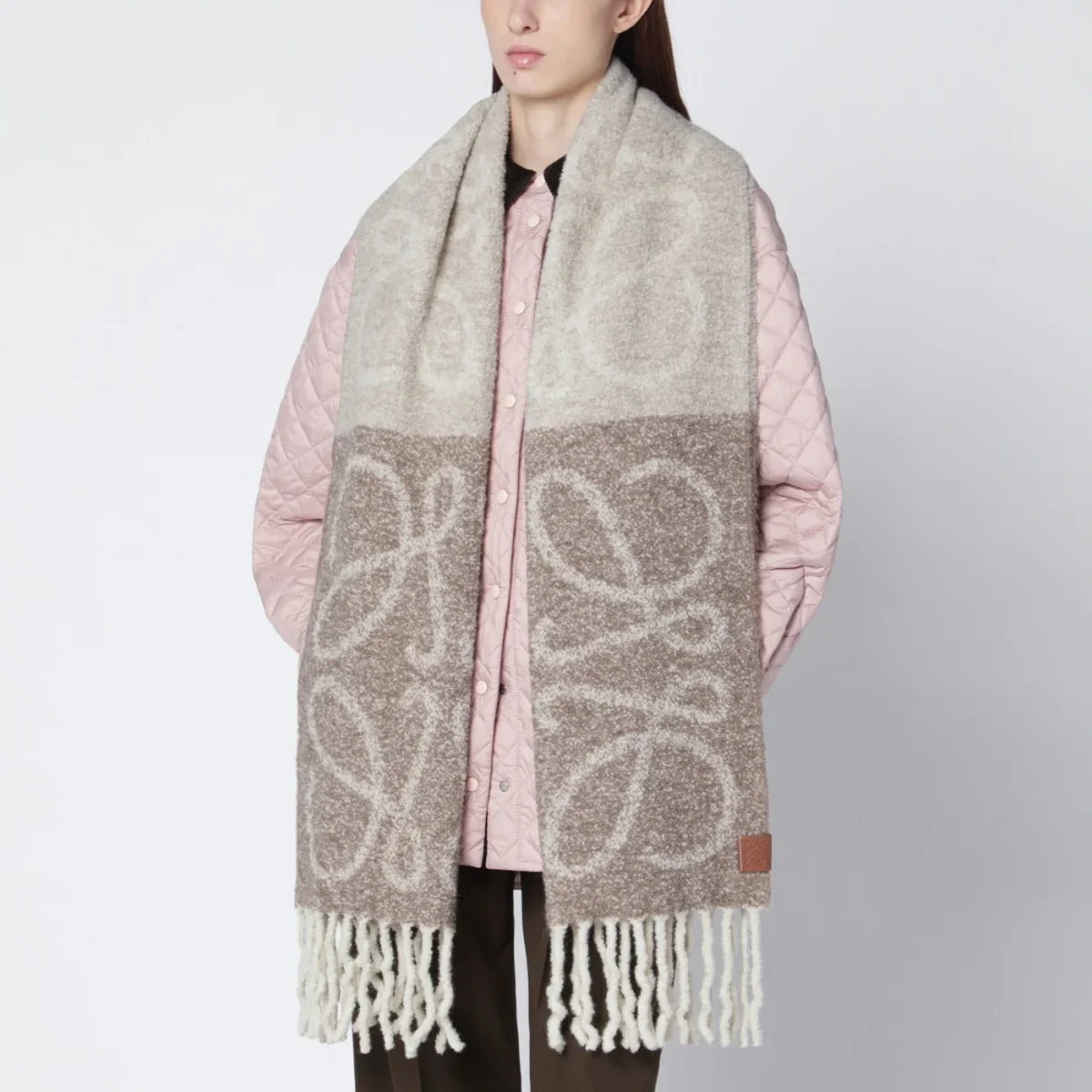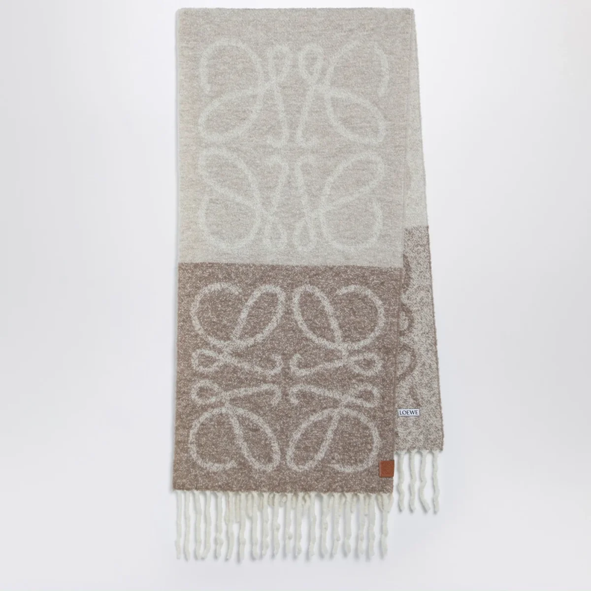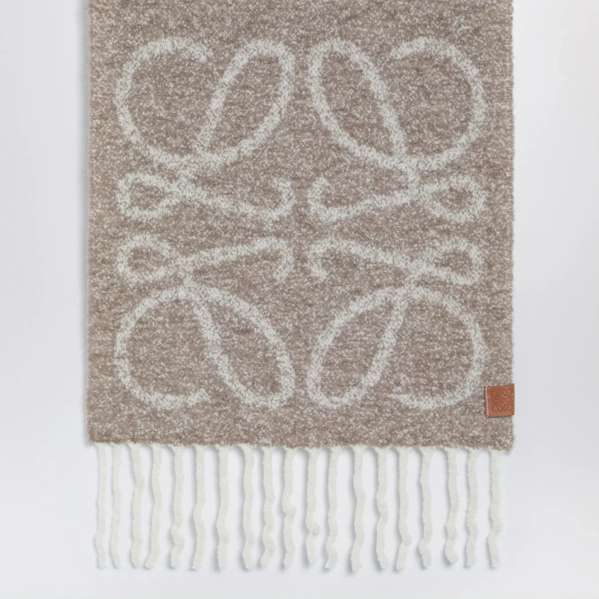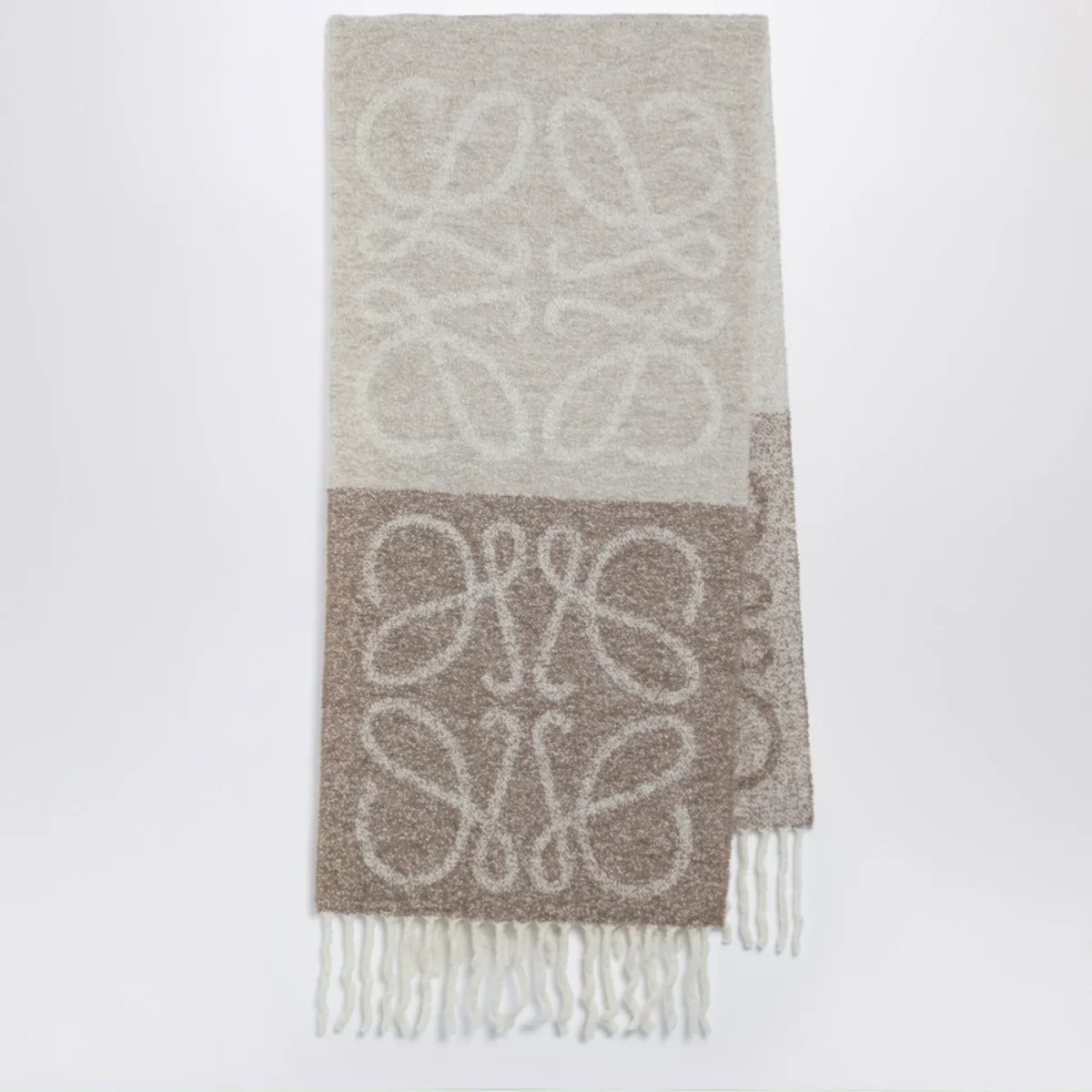 Sciarpa di Loewe in alpaca e lana beige e bianca• motivo Anagram all over• design double face• bordi con frange• linguetta in pelle logata
