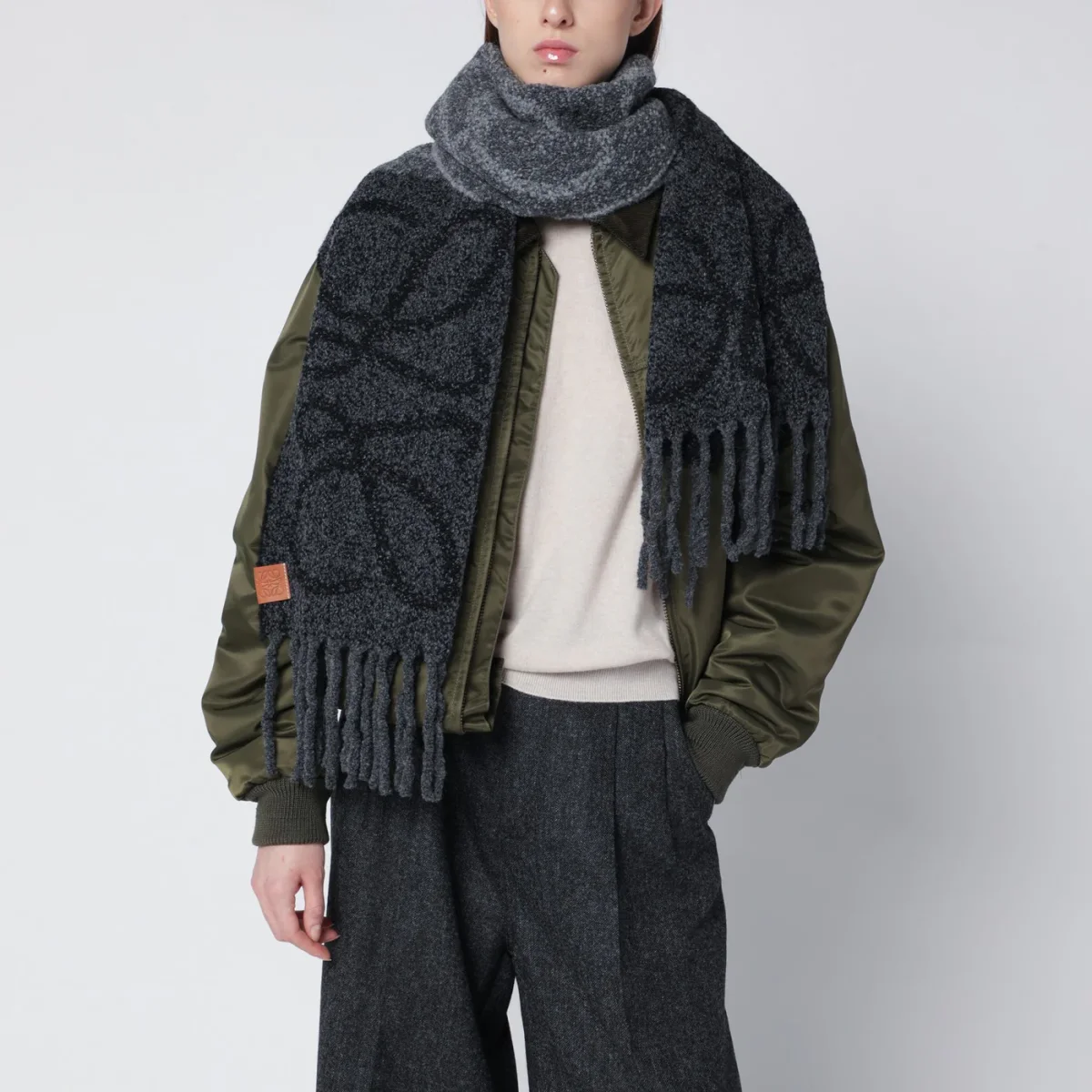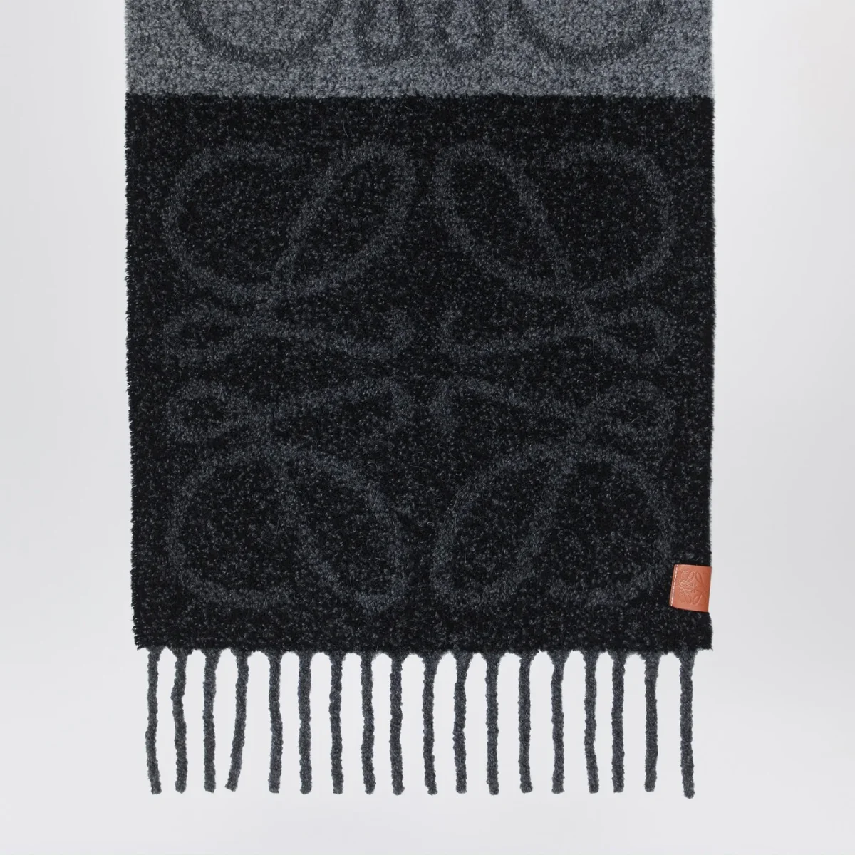 Sciarpa di Loewe in alpaca e lana grigia scura e nera• motivo Anagram all over• design double face• bordi con frange• linguetta in pelle logata
