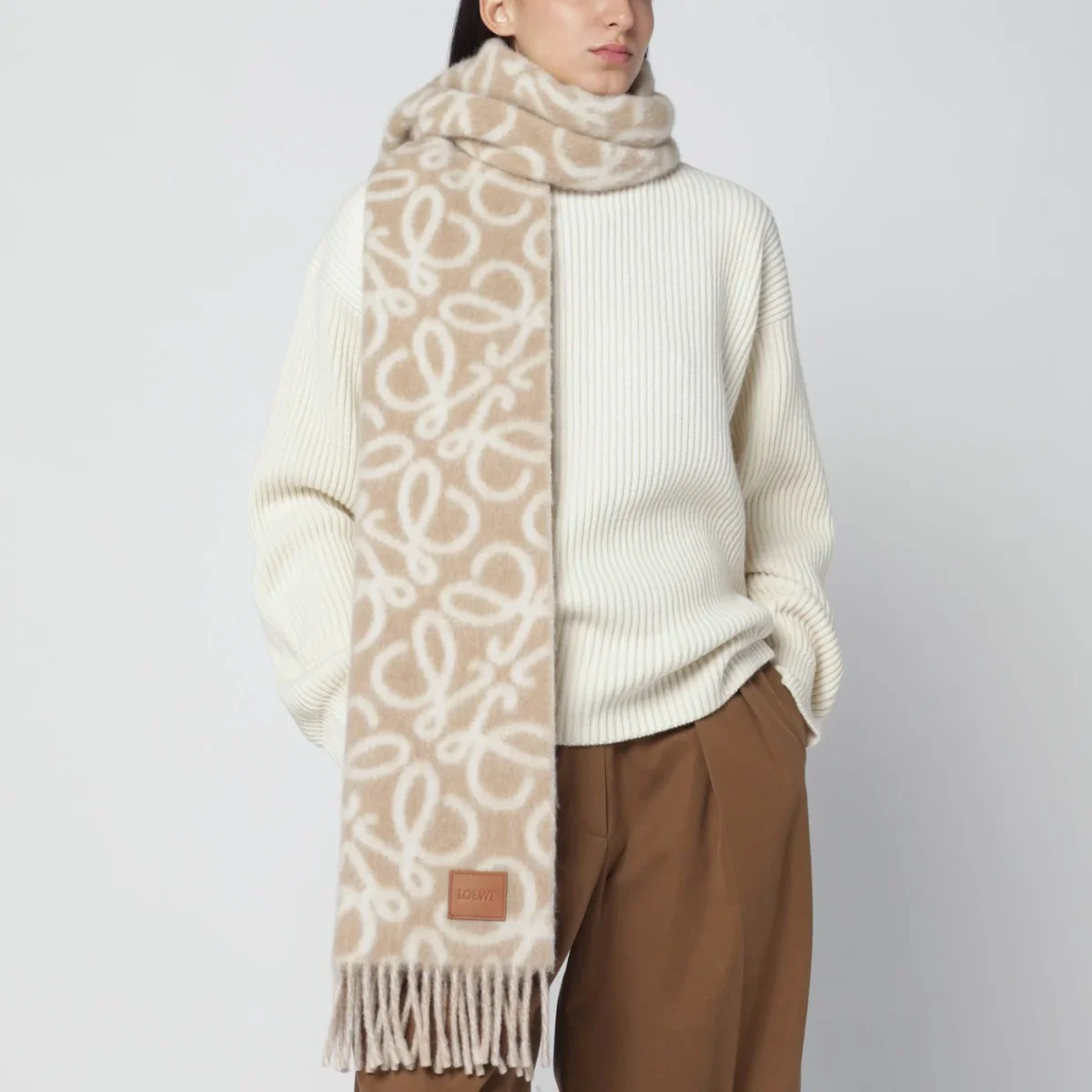 Sciarpa di Loewe in misto alpaca e lana beige e bianca• motivo Anagram all over• frange decorative alle estremità• patch con logo lettering impresso tono su tono in pelle