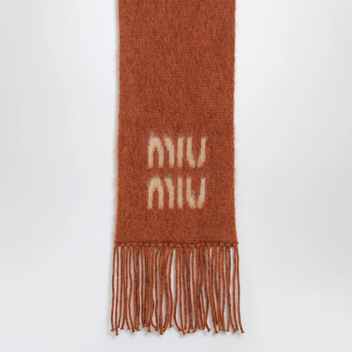 Sciarpa di Miu Miu in misto mohair e lana color ruggine, caratterizzata da intarsio con logo lettering a contrasto e brodi con frange.