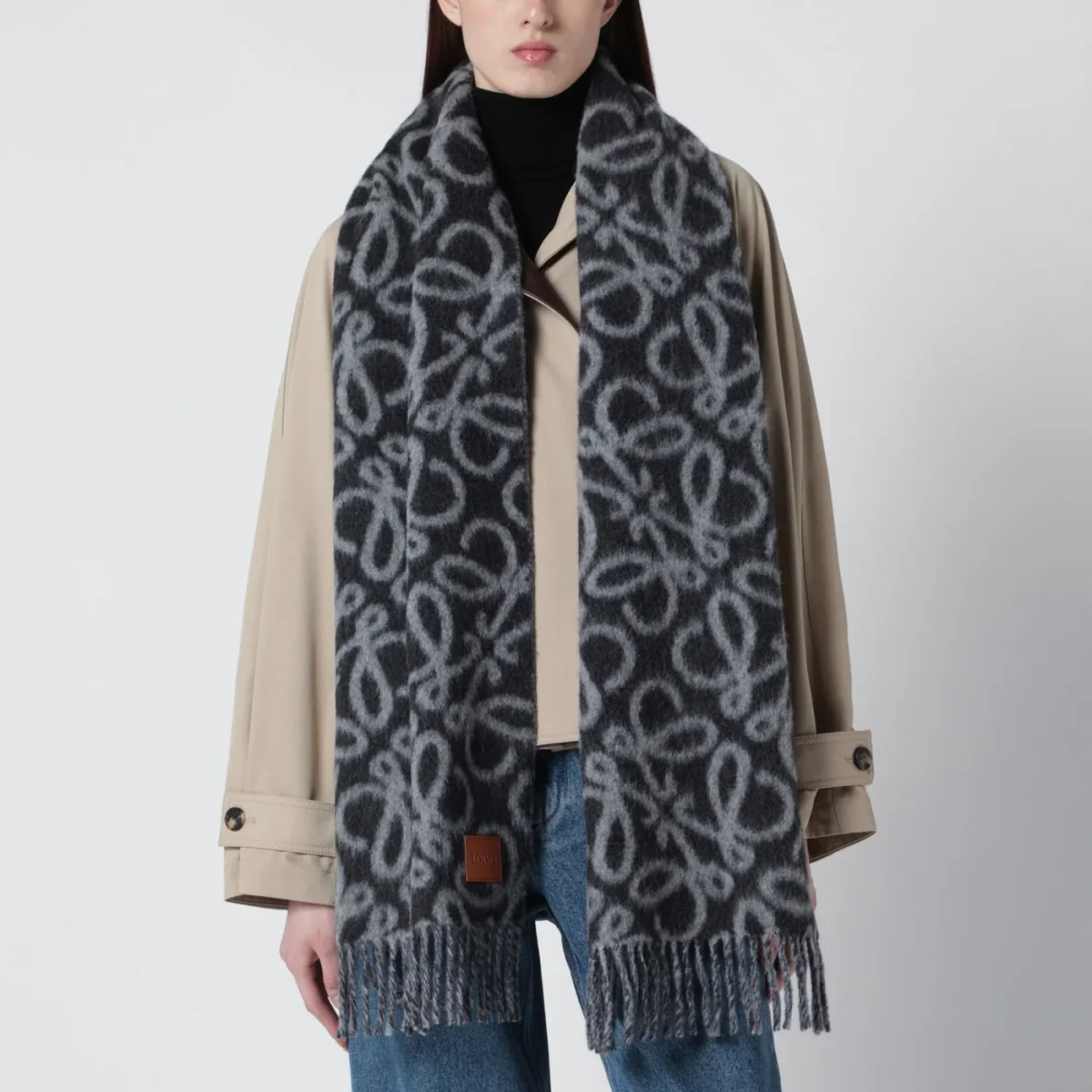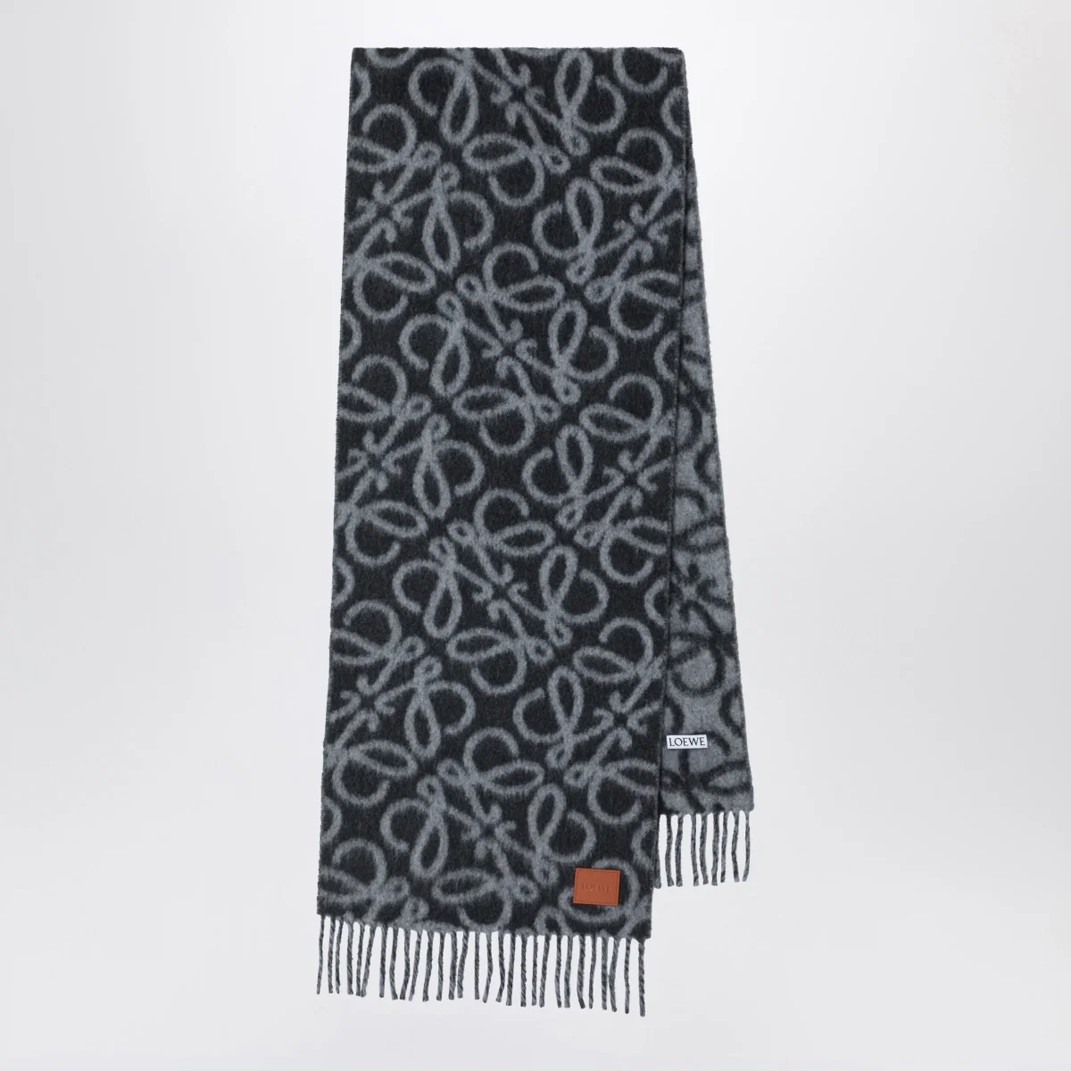 Sciarpa di Loewe in misto alpaca• Lana nera• Grigia con motivo Anagram all over• Frange decorative alle estremità• Patch con logo lettering impresso tono su tono in pelle