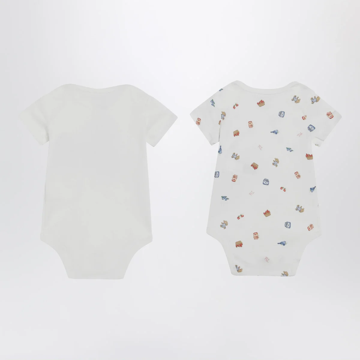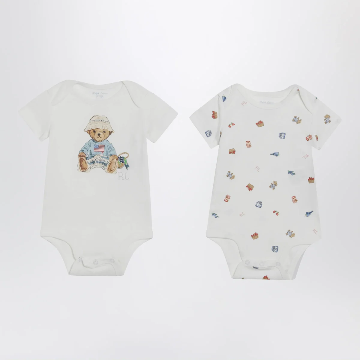Set composto da due body girocollo di Polo Ralph Lauren in cotone• Colore: Bianco• Maniche corte• Uno con stampa Polo Bear sul davanti e uno con stampa Polo Bear all over• Bottoncini automatici sul cavallo