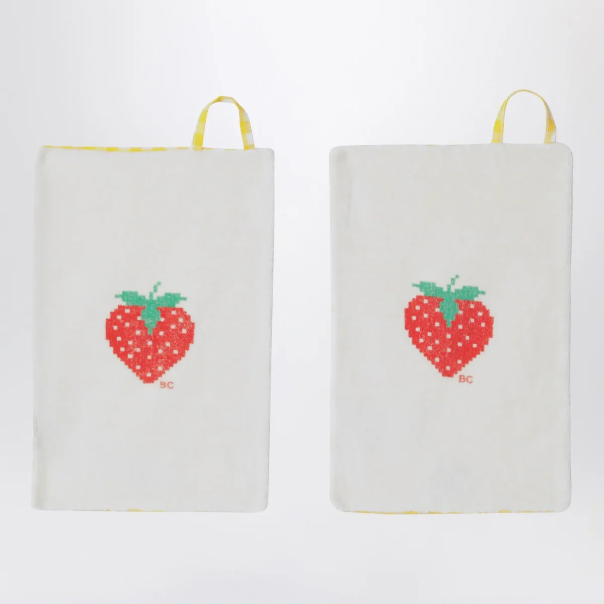 Set di Bobo Choses composto da due lavette in cotone con motivo check giallo/bianco• Patch logo da un lato• Fragola con ricamo logo dall’altro• Gancio in tessuto sul lato
