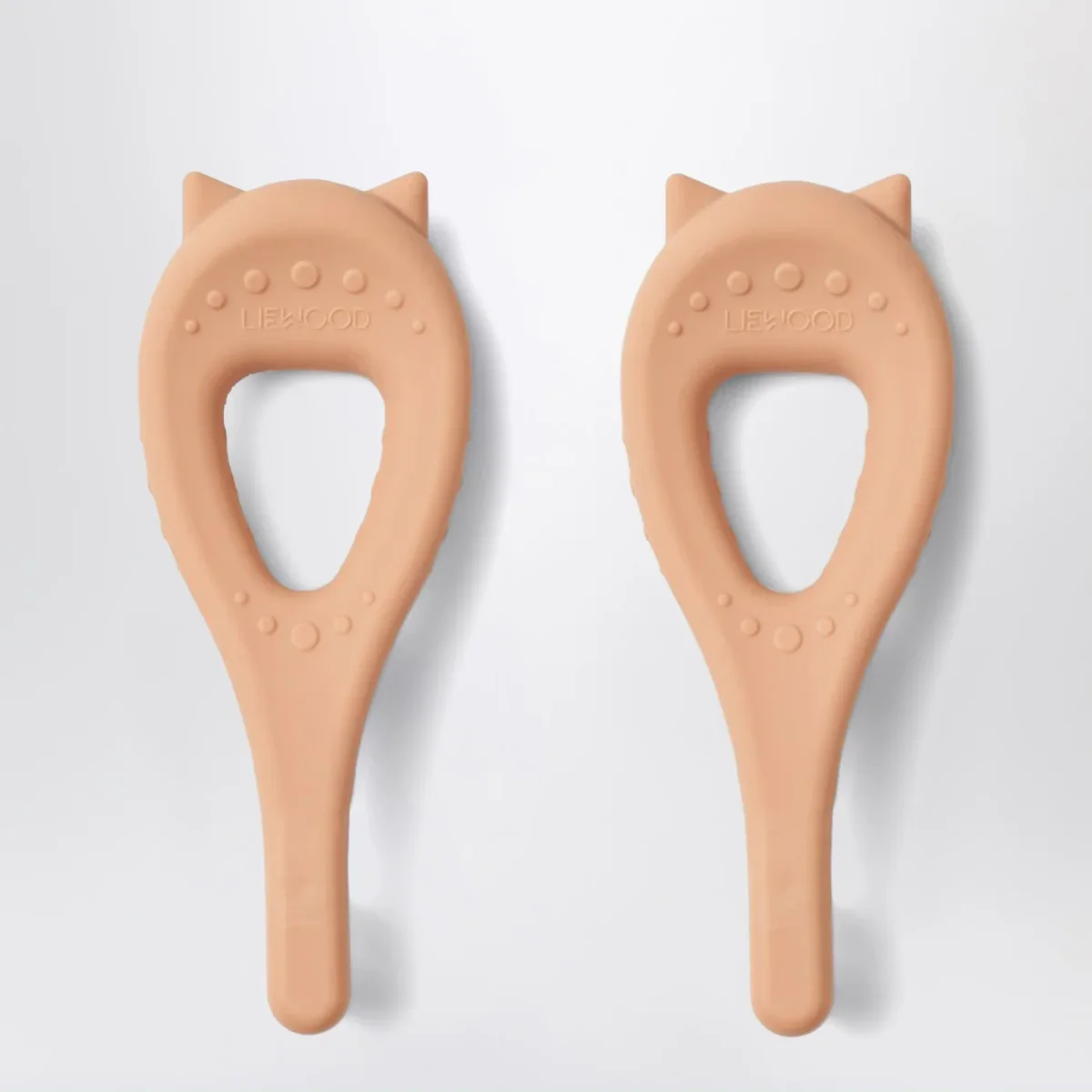 Set di Liewood composto da due spazzolini da denti in morbido silicone rosa, caratterizzati da dettagli forma di gatto, un manico con funzione anche di massaggiagengive e setole morbide in nylon.
