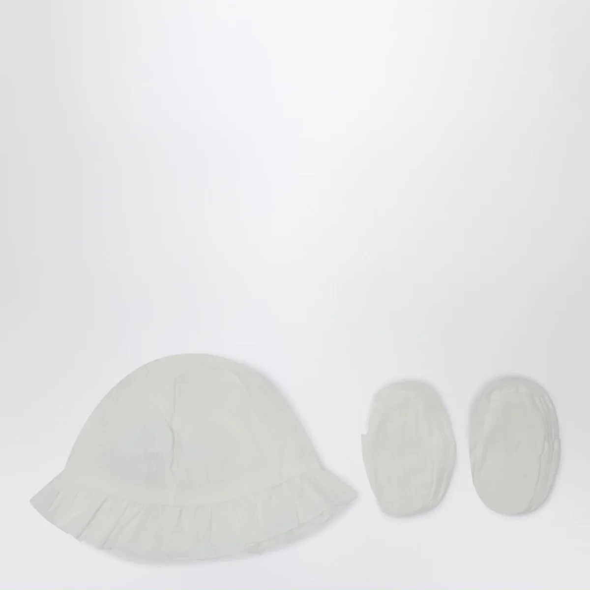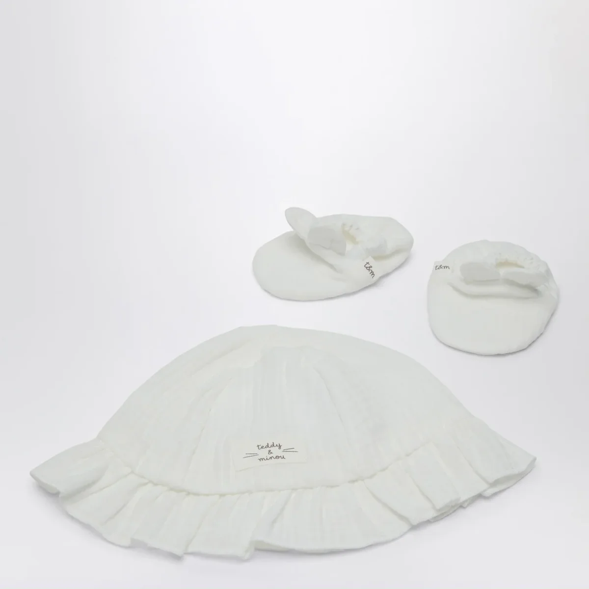 Set due pezzi di Teddy & Minou in garza di cotone bianco, composto da cappellino con tesa volant e patch logo e scarpine con finitura elastica e orecchie da coniglietto.