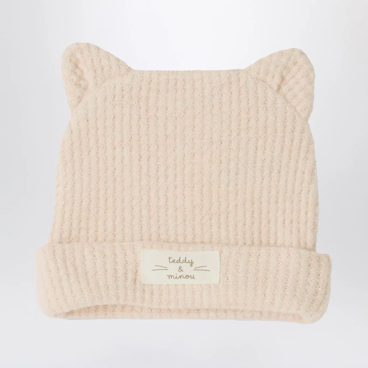 Set di Teddy & Minou in misto viscosa con texture waffle rosa chiaro, composto da un berrettino con orecchie da gatto e risvolto con patch logo e scarpine a calza.