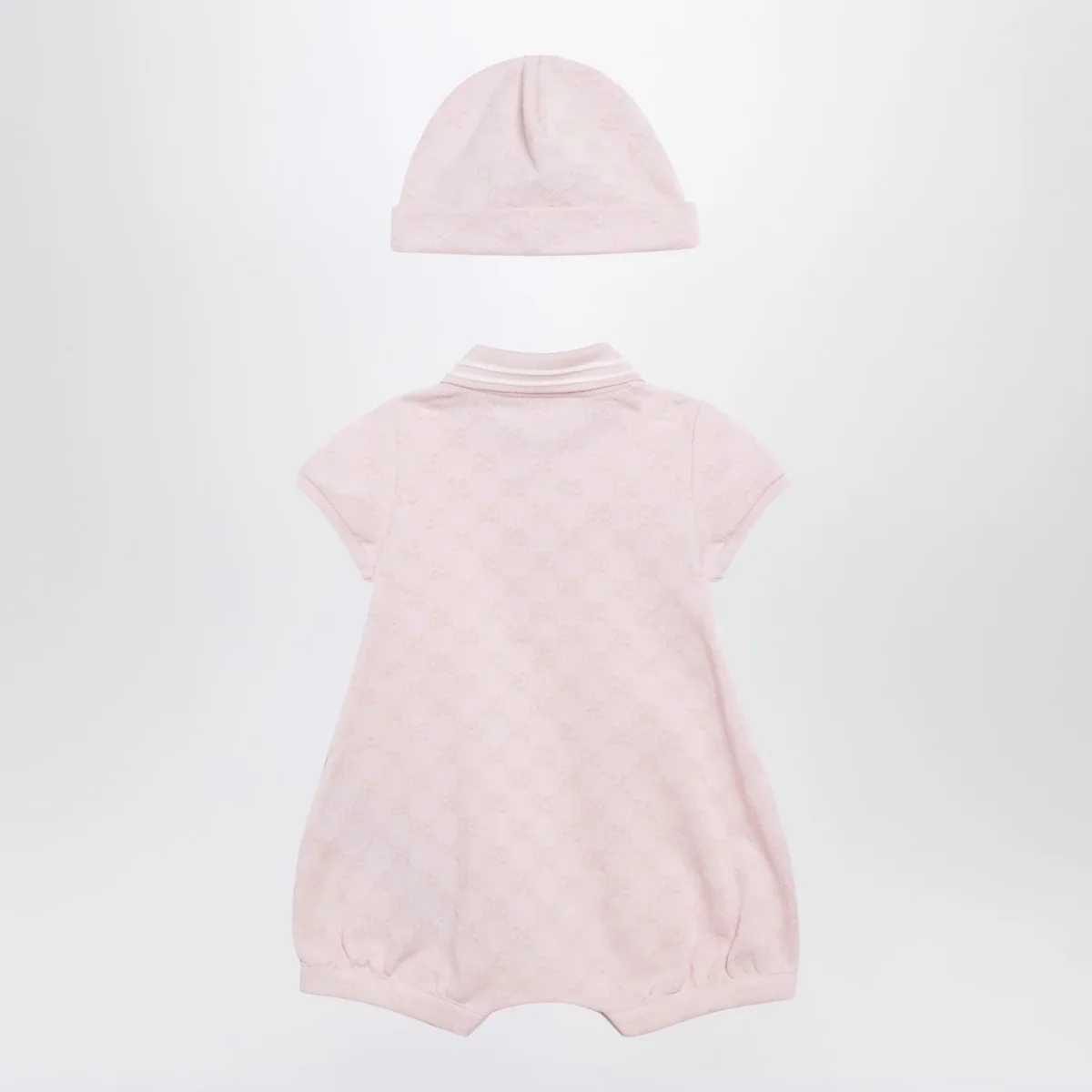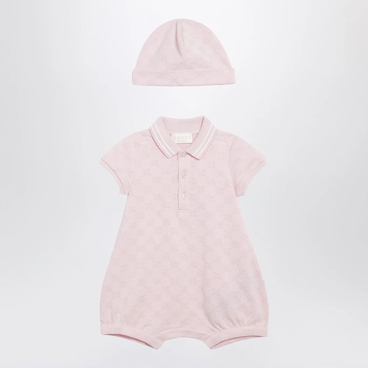 Set due pezzi di Gucci in cotone piquet GG rosa chiaro• Composto da tutina con colletto modello polo a righe• Maniche corte• Orli elasticizzati• Finiture a coste• Chiusura con bottoni automatici nascosti• Cappellino coordinato