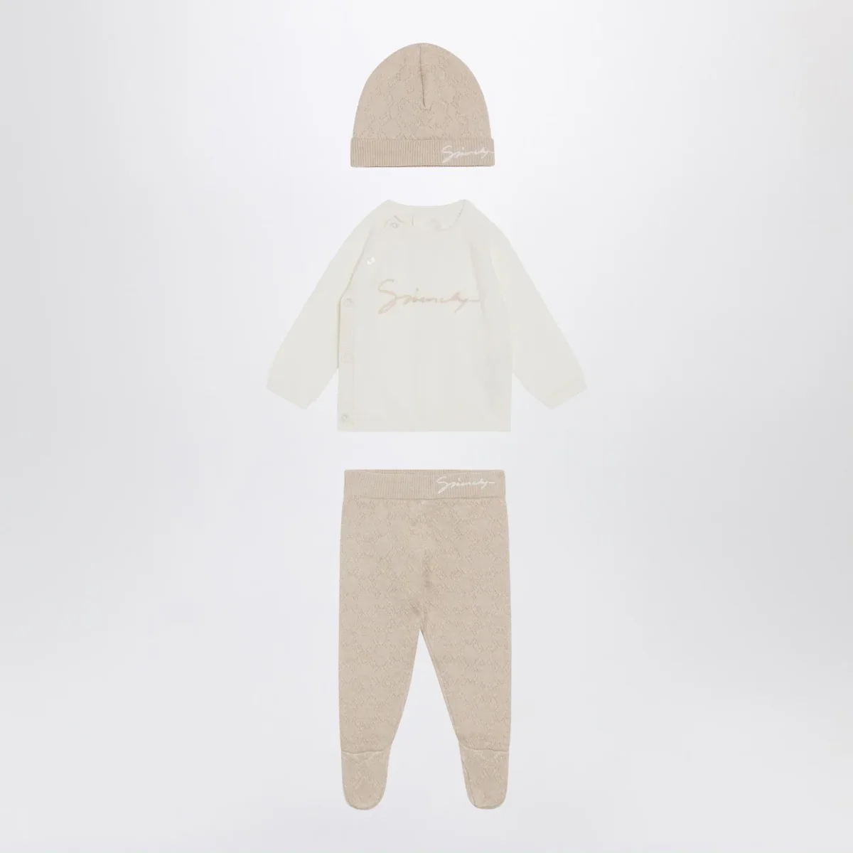 Set tre pezzi per neonato di Givenchy in cotone e cashmere composto da berretto beige con risvolto a costine e logo lettering, leggings beige con vita elasticizzata a costine con logo lettering e maglione girocollo con maniche lunghe, bottoncini sul davanti, bordi a costine e ricamo logo lettering sul petto.