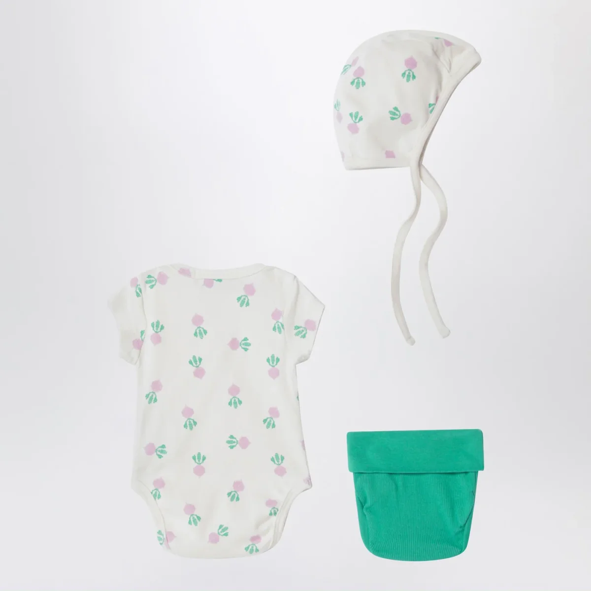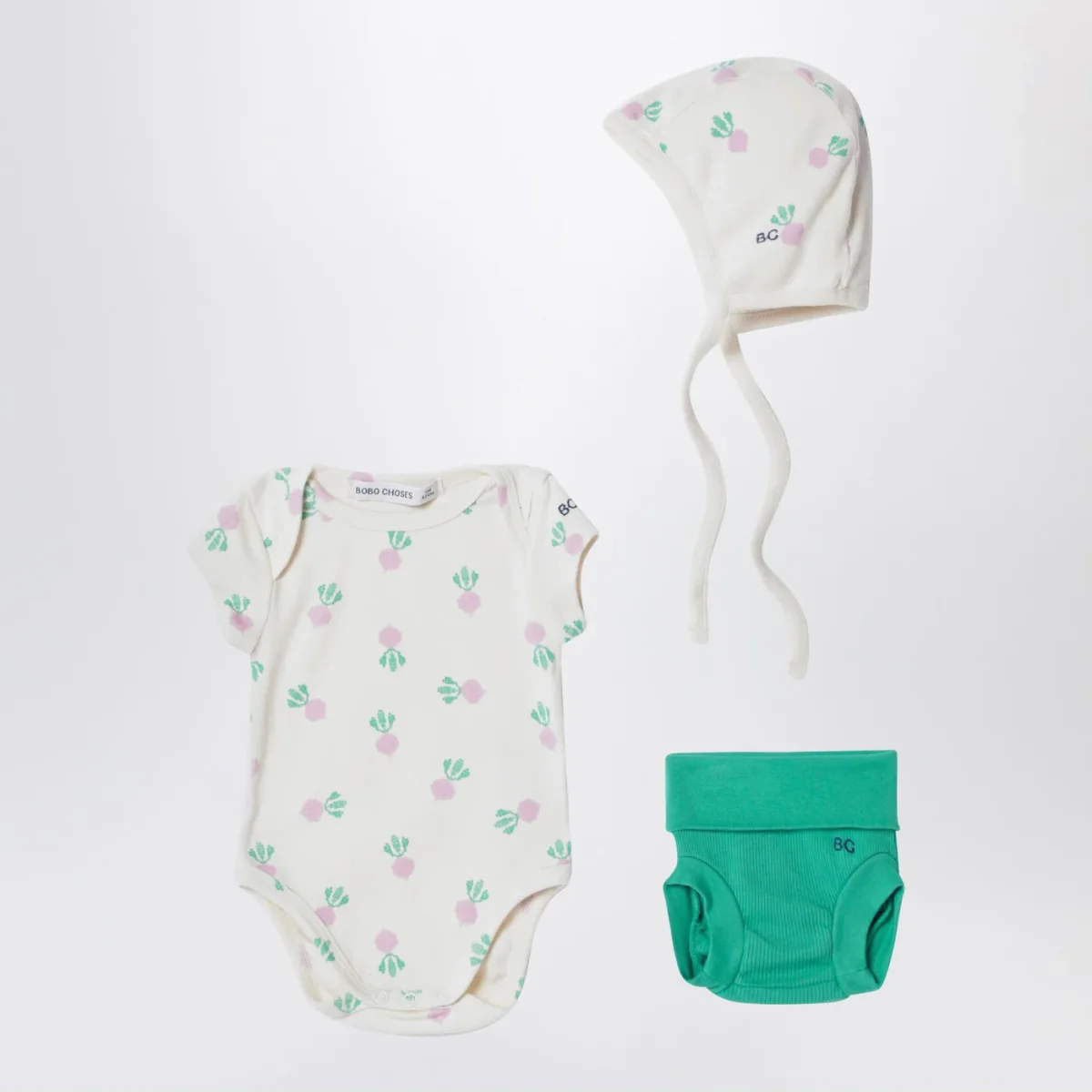 Set di Bobo Choses in cotone organico• Composto da body girocollo a maniche corte bianco con ravanelli all over• Bottoncini sul cavallo• Berretto bianco con lacci da annodare sotto al mento• Calzoncini a costine verdi con ricamo logo