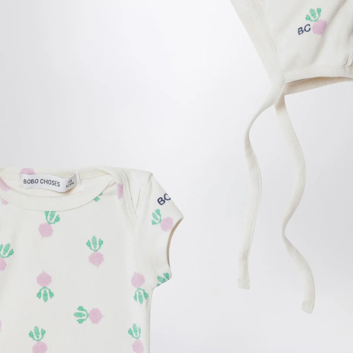 • Composto da body girocollo a maniche corte bianco con ravanelli all over