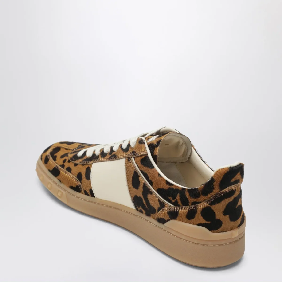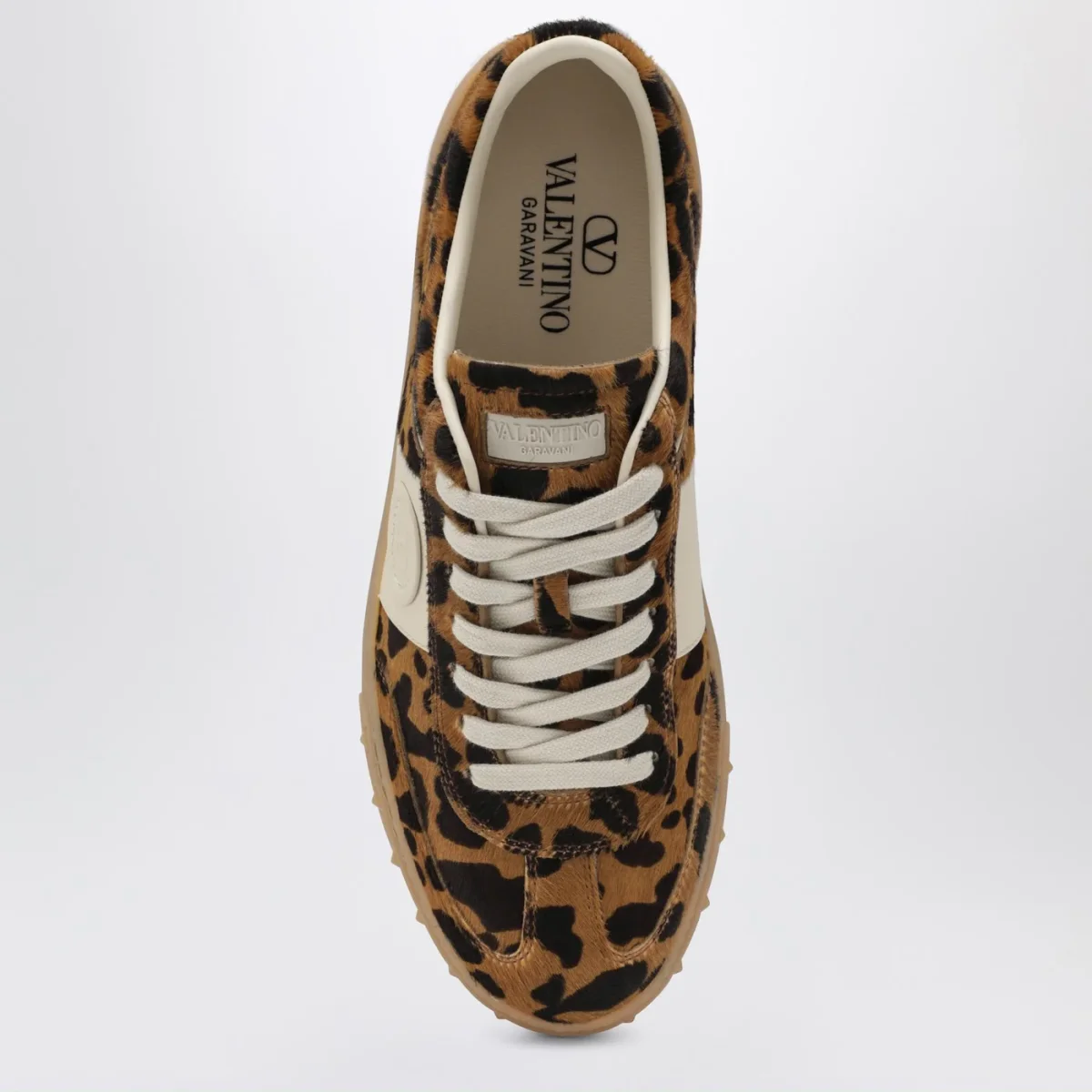 Sneaker di Valentino Garavani in vitello effetto cavallino con stampa animalier marrone e color miele, caratterizzata da banda laterale in vitello nappato avorio, patch in pelle con dettaglio VLogo Signature, logo lettering serigrafato su linguetta, punta tonda e suola in gomma con dettaglio borchie