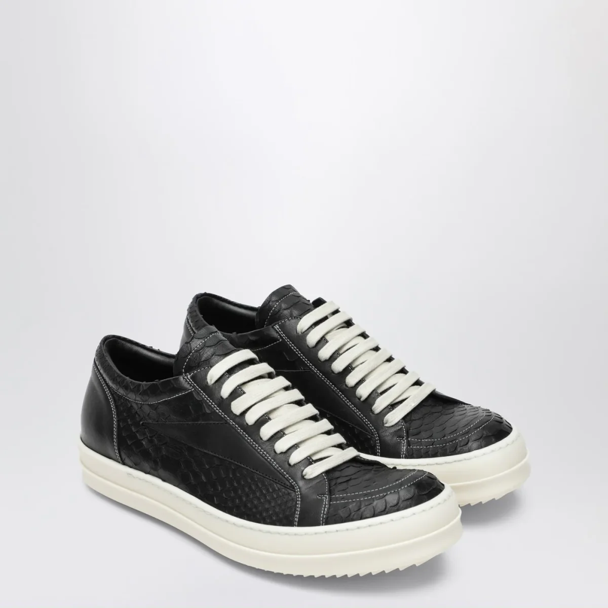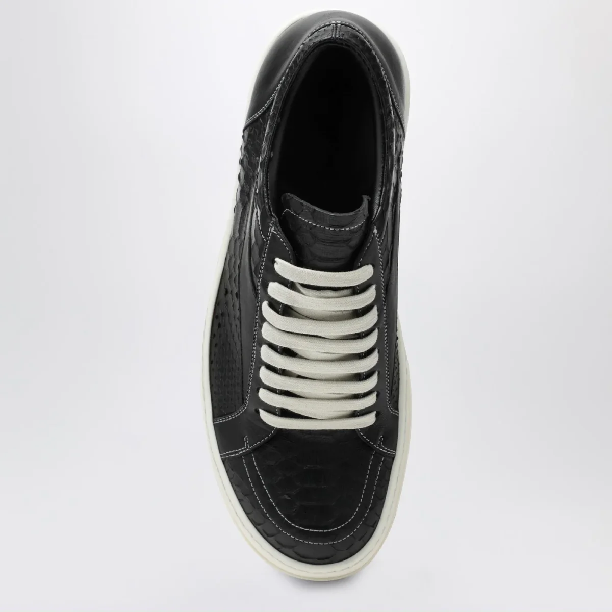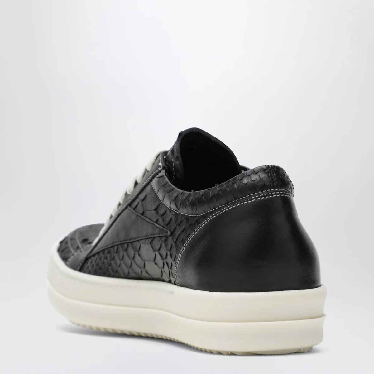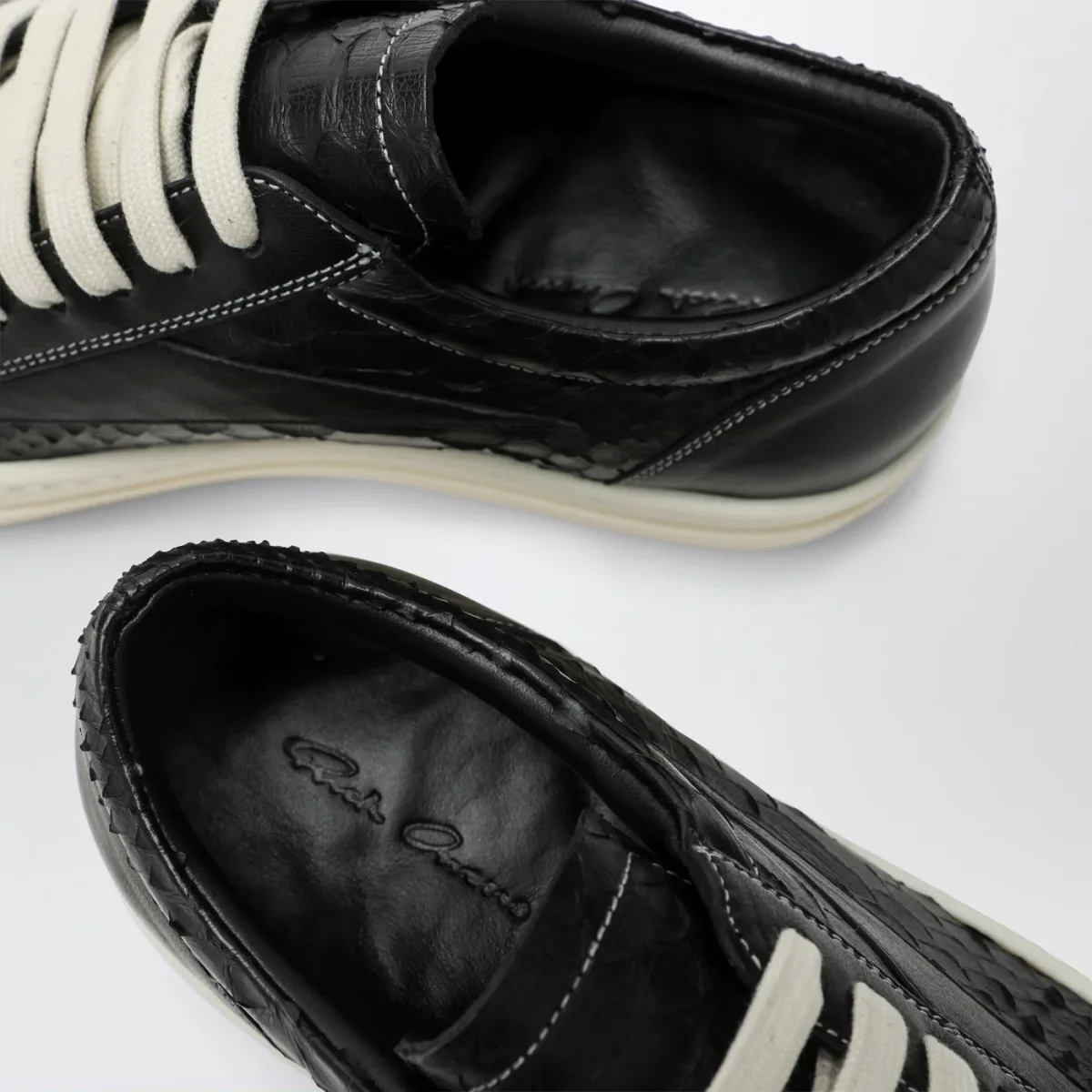 Sneaker di Rick Owens in pelle liscia di agnello e pelle di pitone nera, caratterizzata da punta tonda, chiusura con stringhe e suola in gomma.