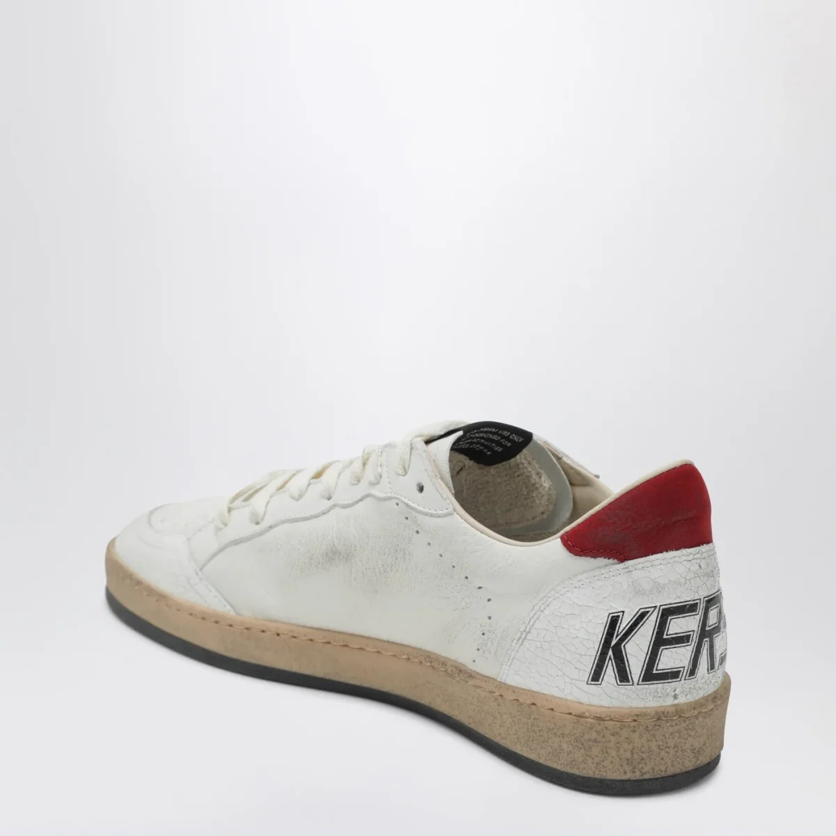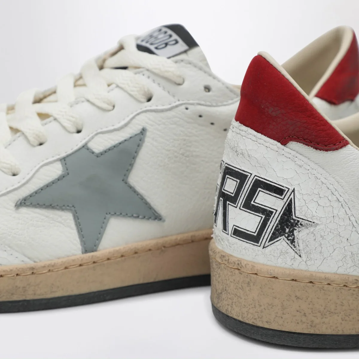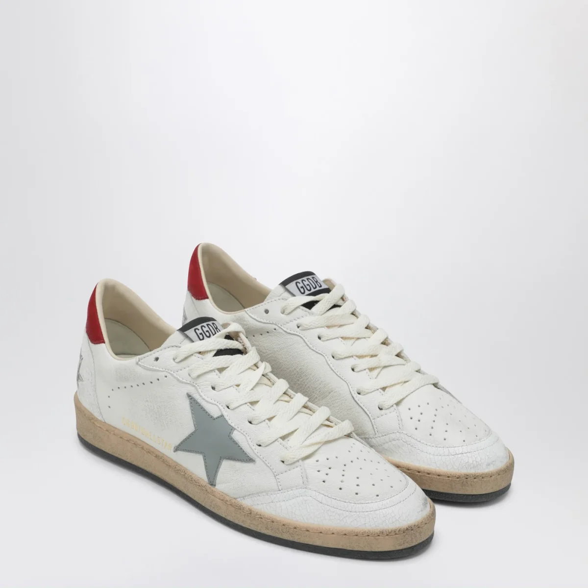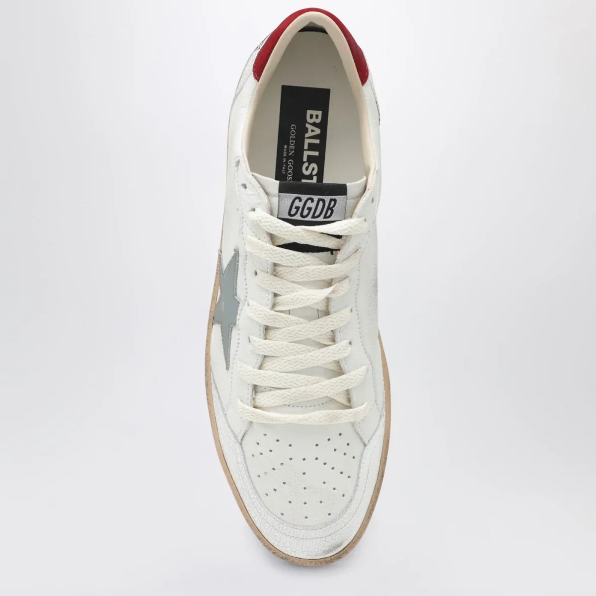 Sneaker bianca di Golden Goose Deluxe Brand in pelle• chiusura con lacci• patch stella laterale in pelle blu argentata• scritta logo laterale• effetto vintage• punta tonda•tallone in pelle rosso con dettaglio stampa logo
