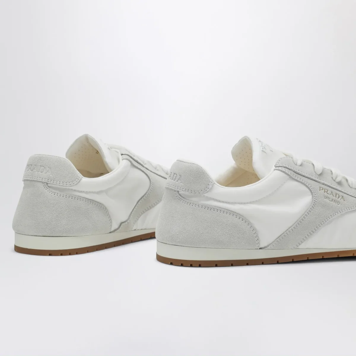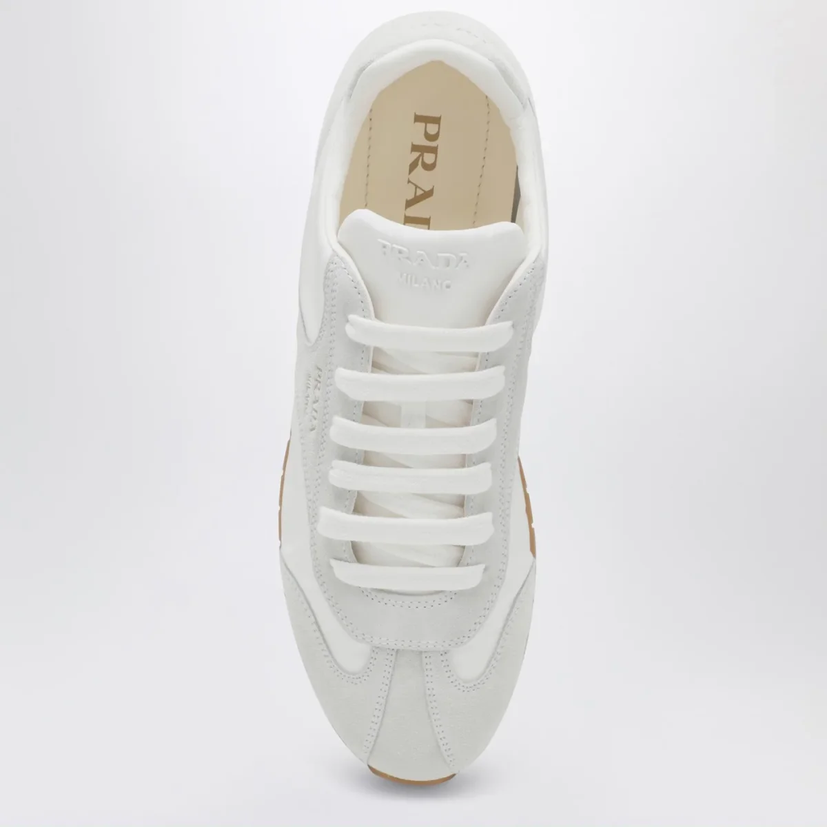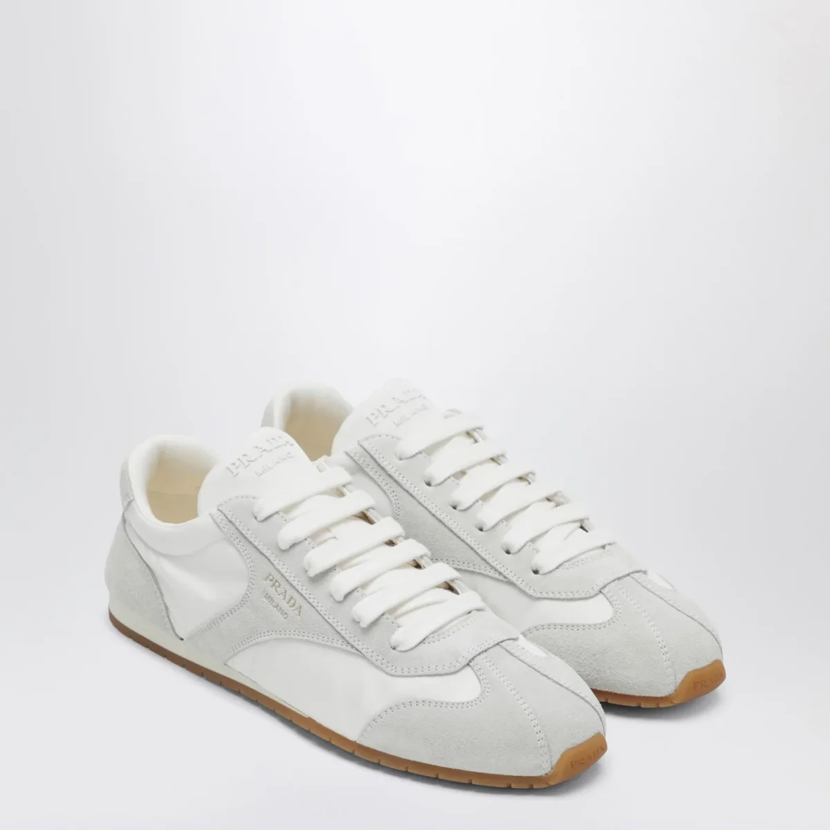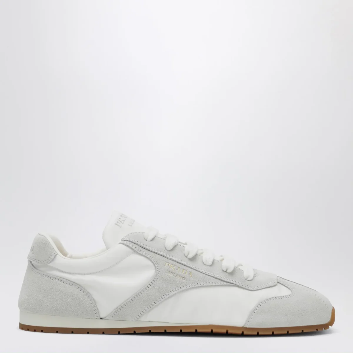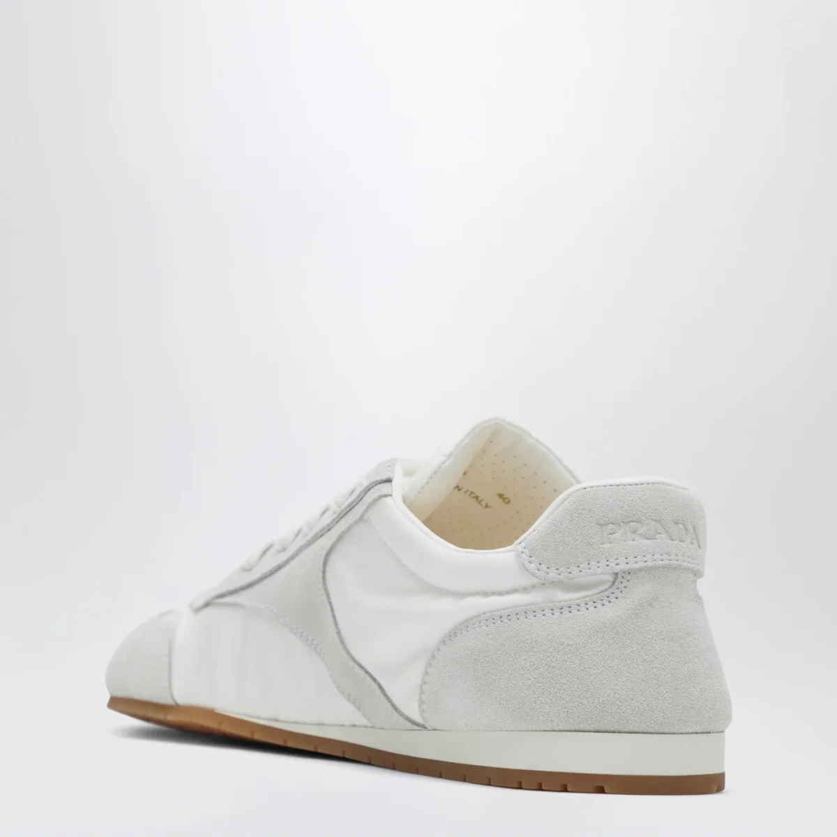 Sneaker di Prada bianca con inserti in suede• punta affusolata• linguetta con logo lettering in rilievo tono su tono• logo lettering serigrafato laterale• chiusura con stringhe• tallone con logo lettering impresso