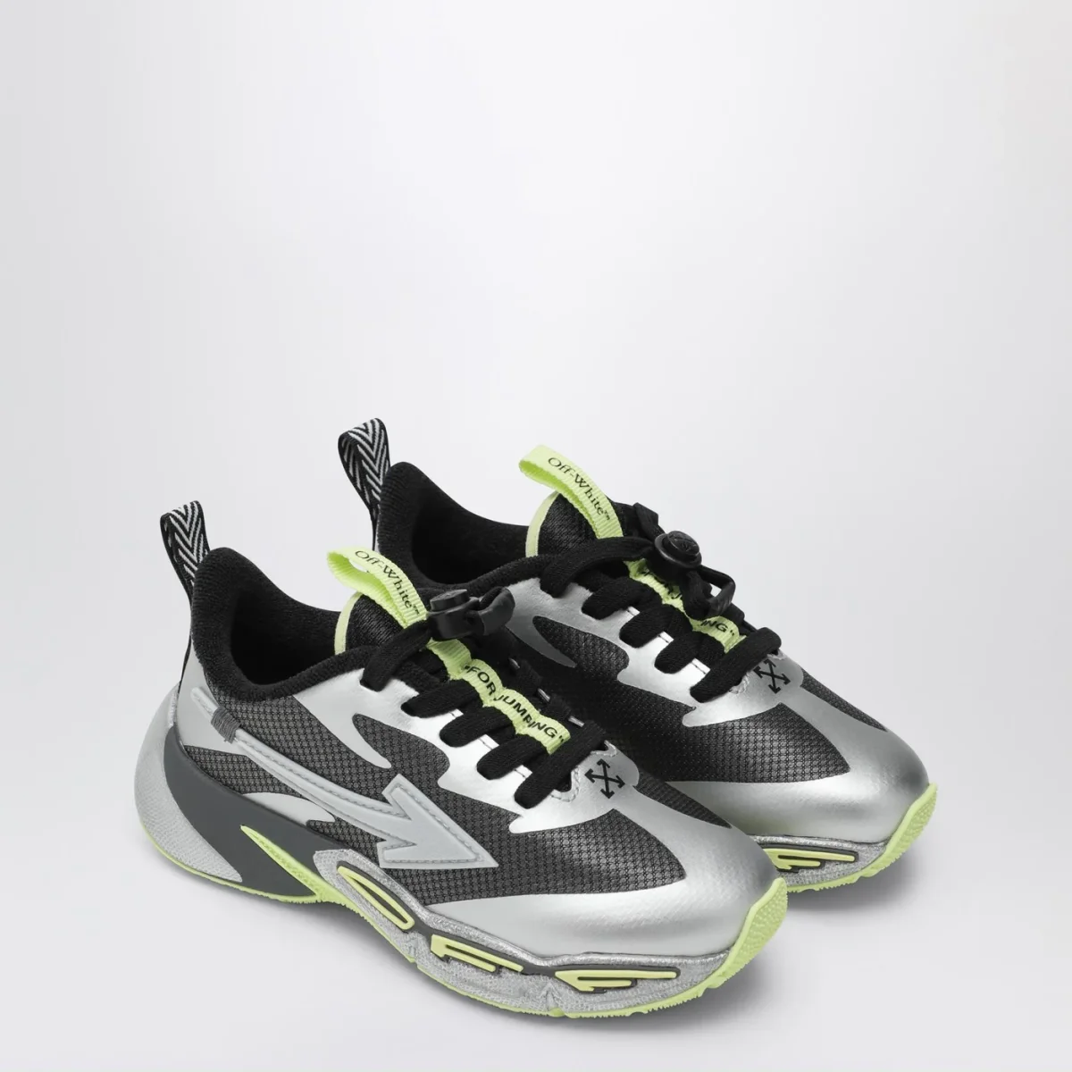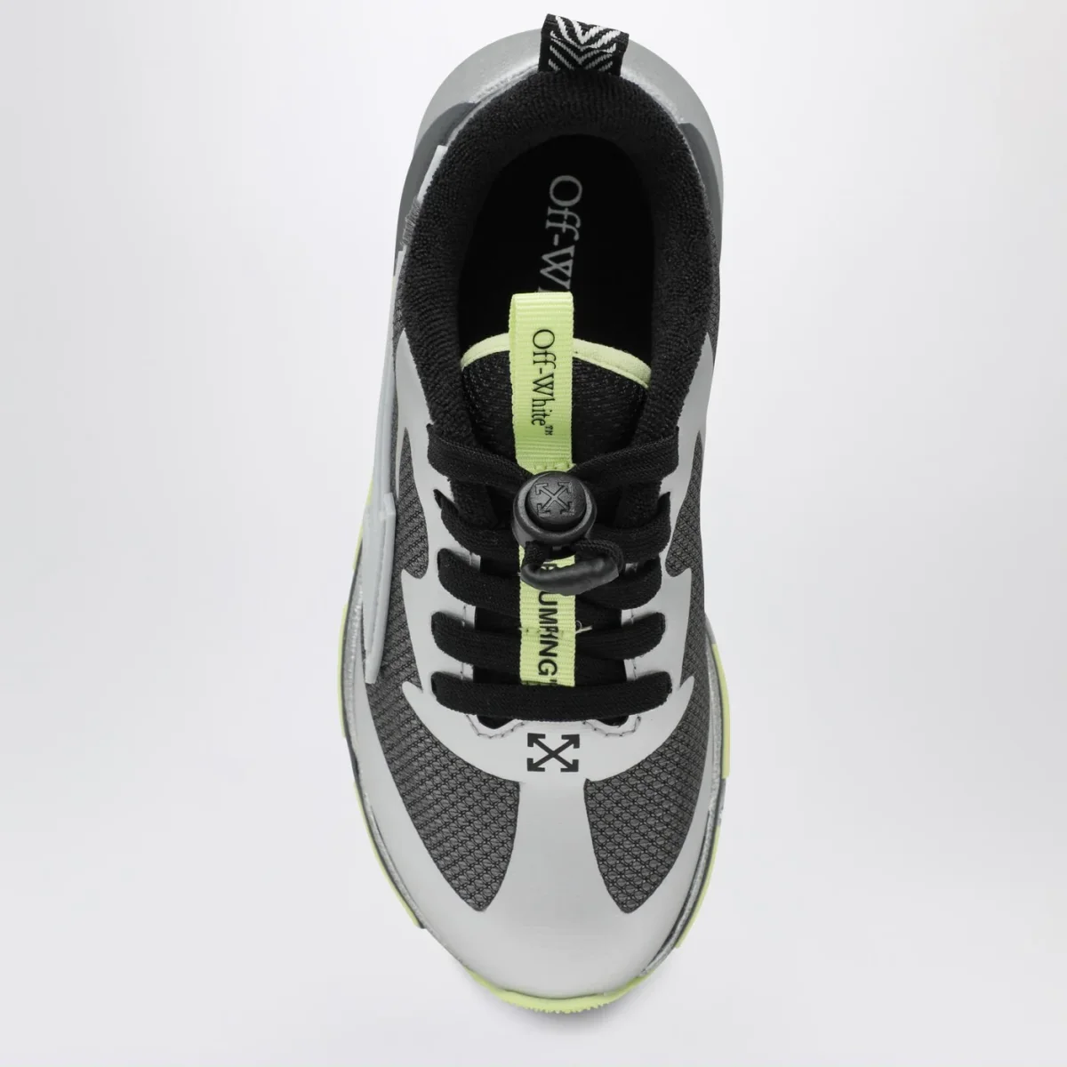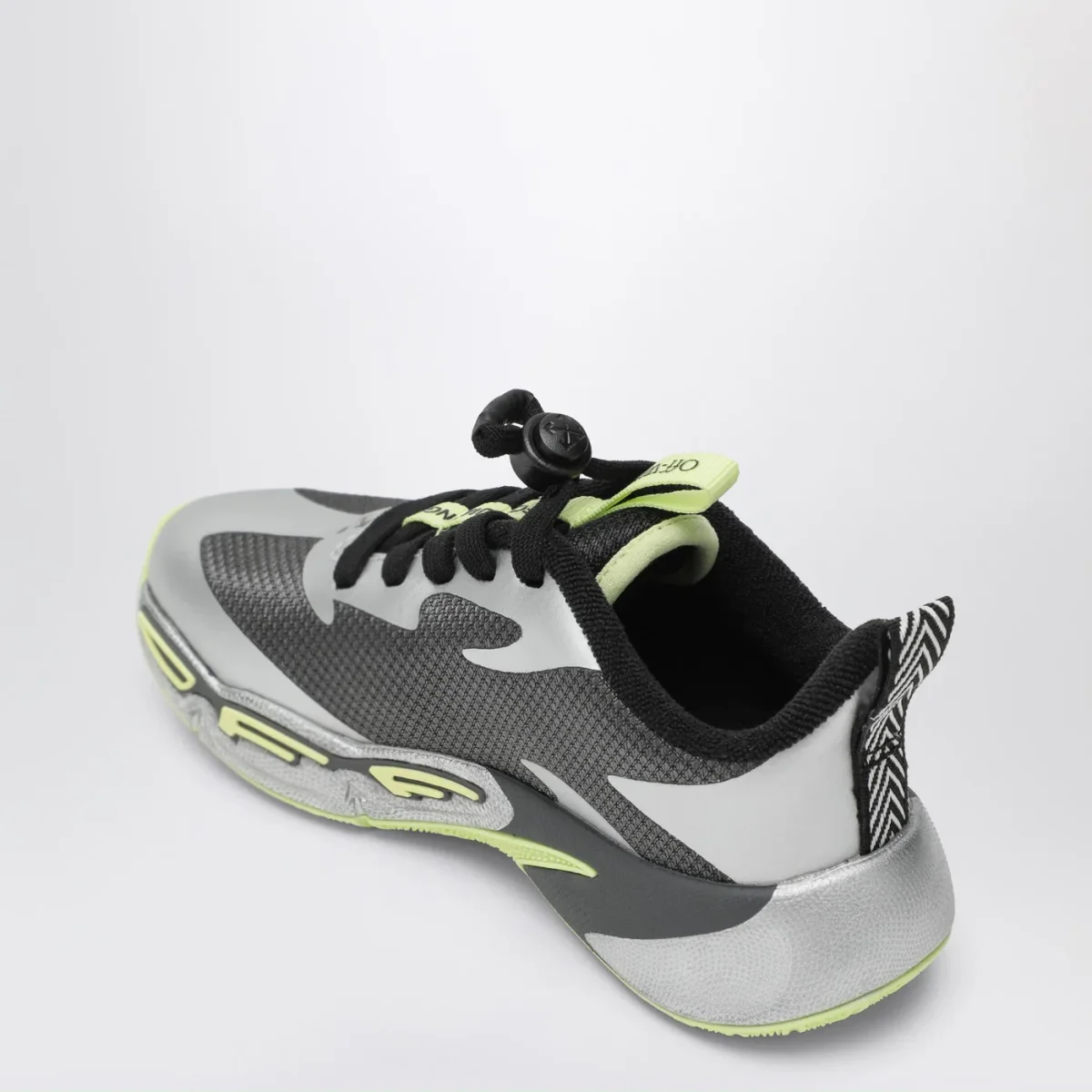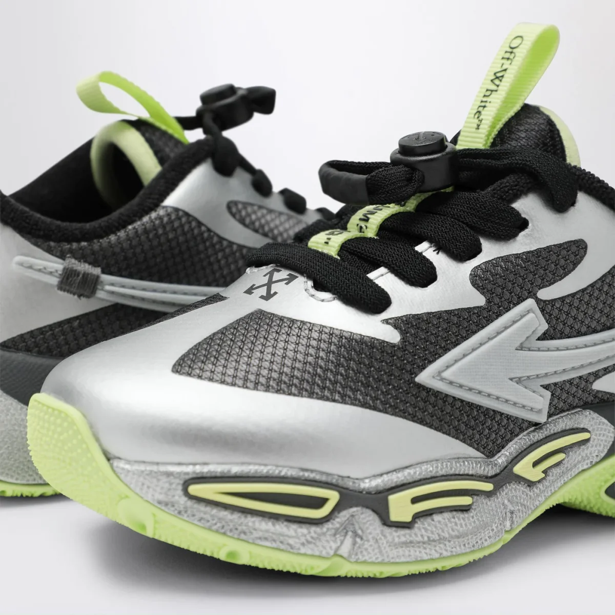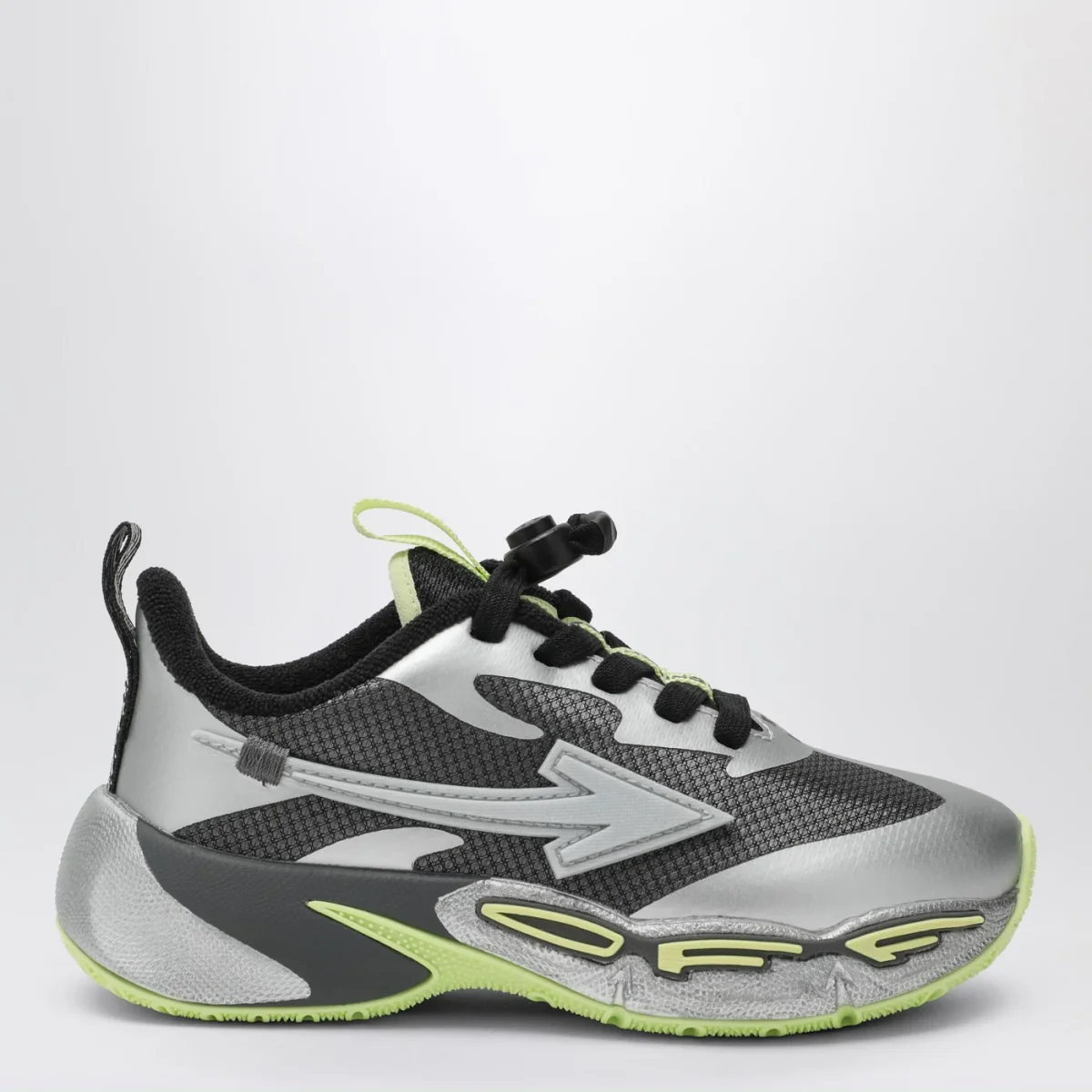 Sneaker di Off-White grigia scura e argento, caratterizzata da chiusura con stringhe regolabili con coulisse, motivo Arrows sui lati e suola in gomma con logo Off.