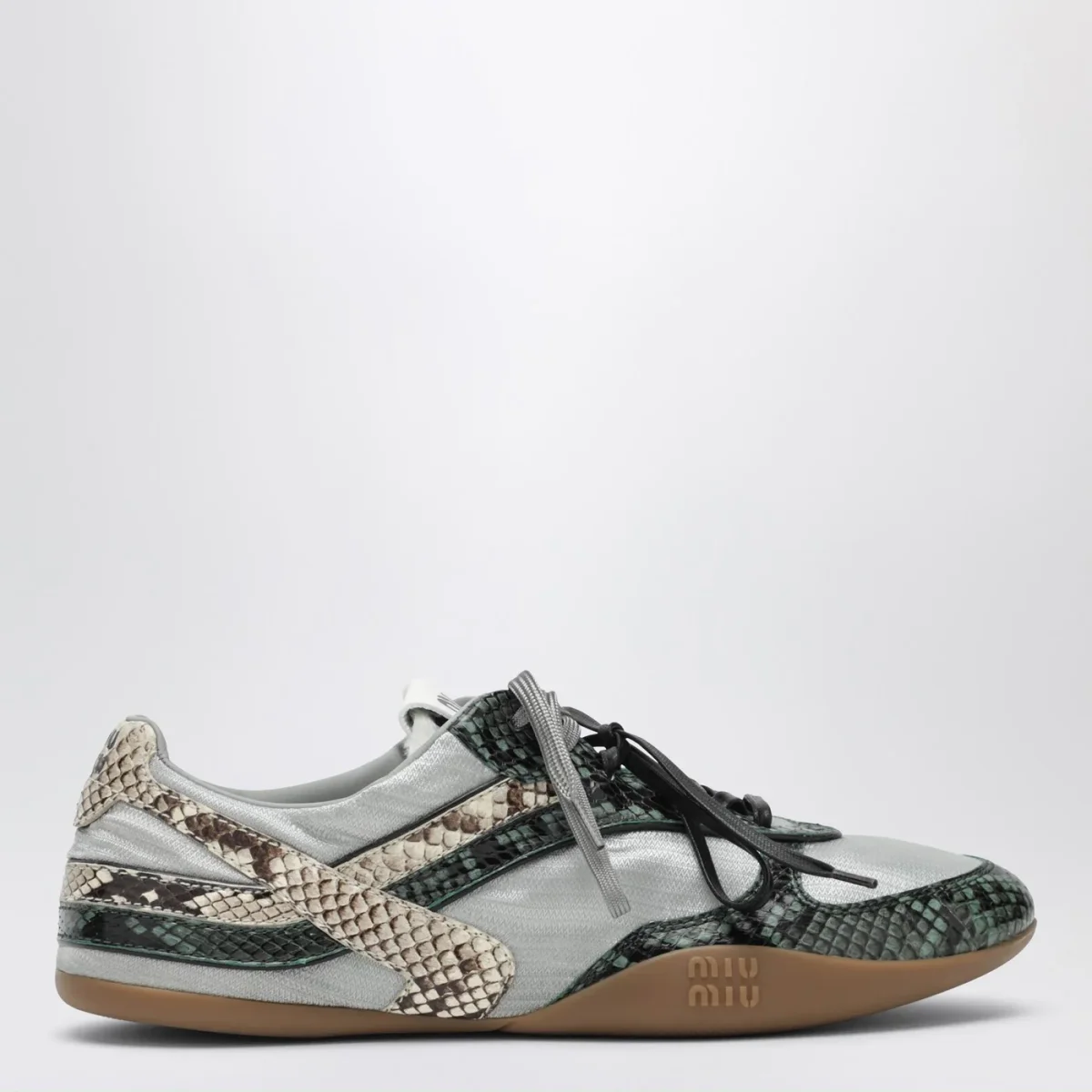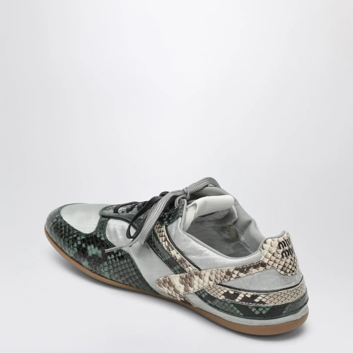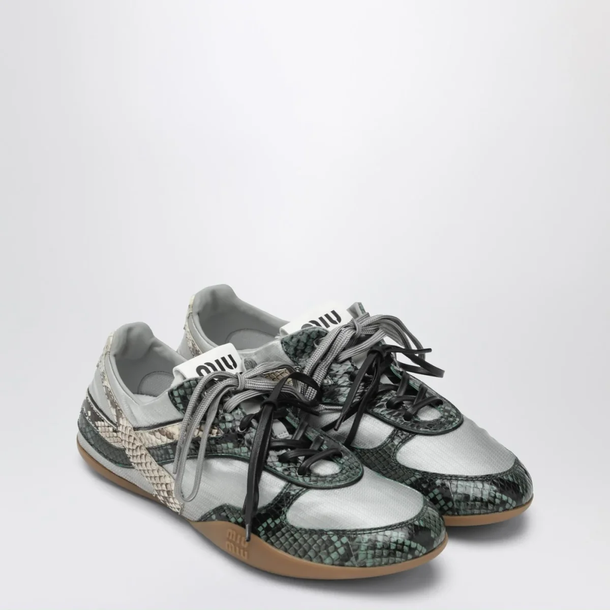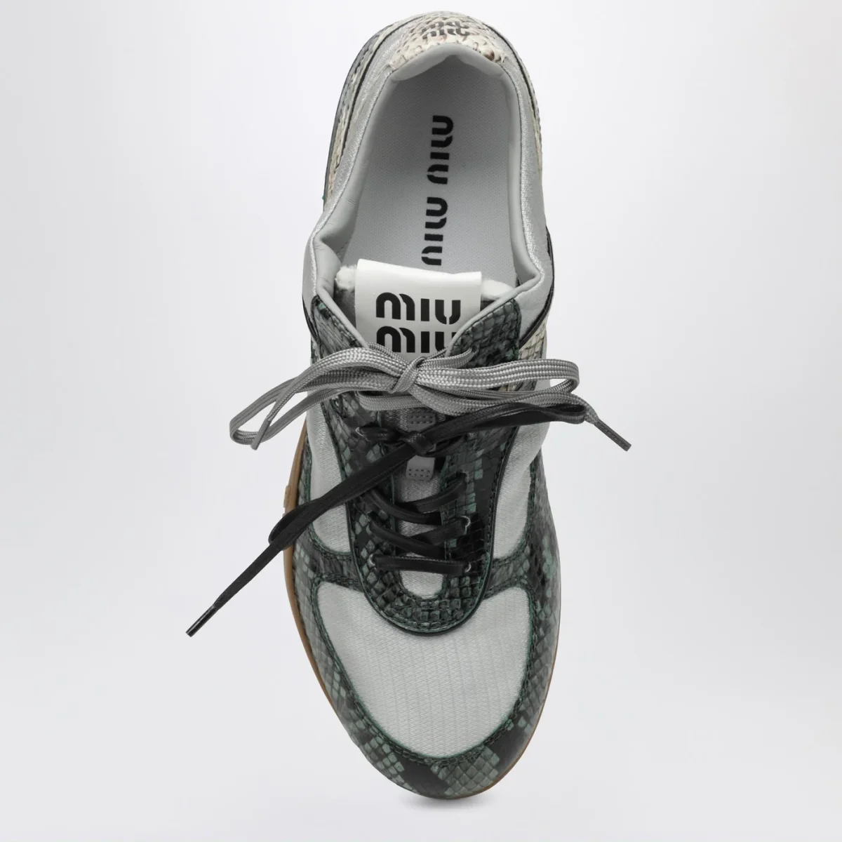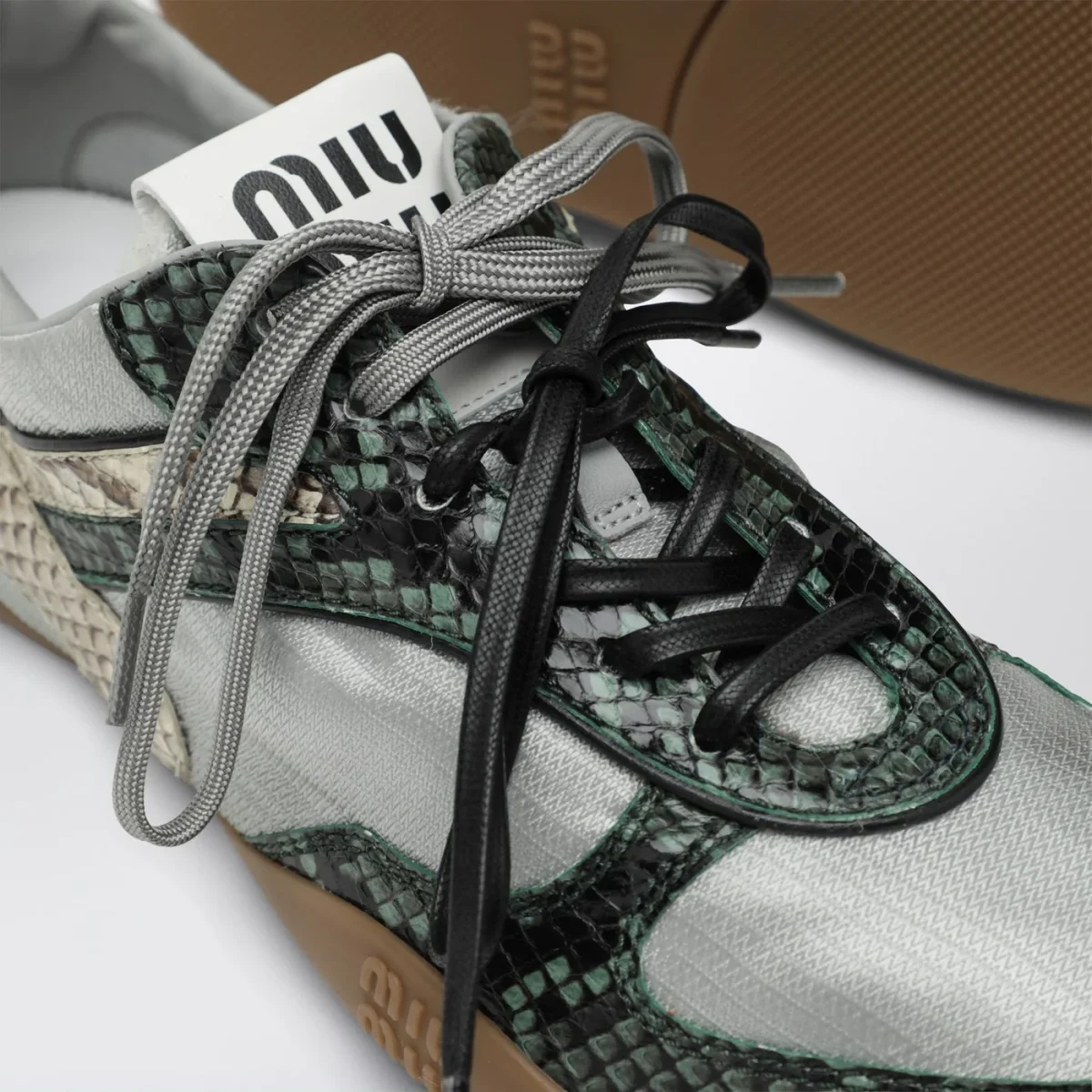 Sneakers di Miu Miu in tessuto tecnico leggero e pelle Ayers con stampa pitone dal design color-block grigia e verde abete, caratterizzata da fodera in tessuto, allacciatura con stringhe, suola in gomma con logo, sottopiede estraibile rivestito in tessuto e logo serigrafato su linguetta.