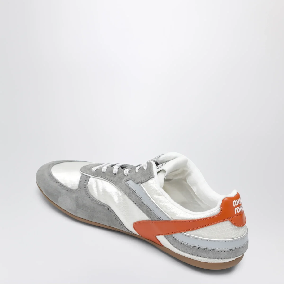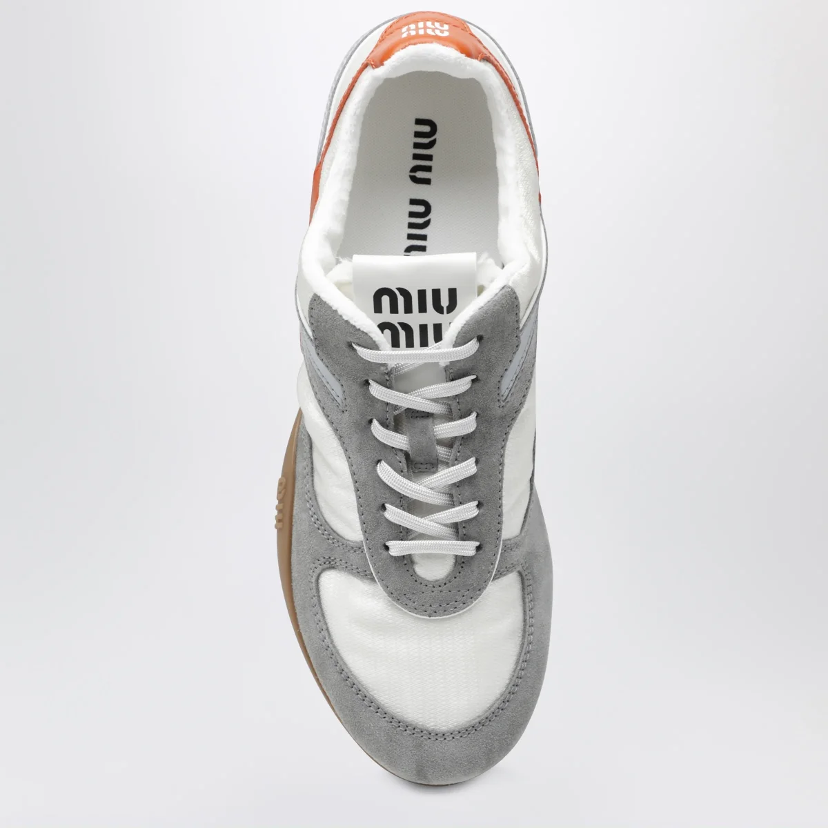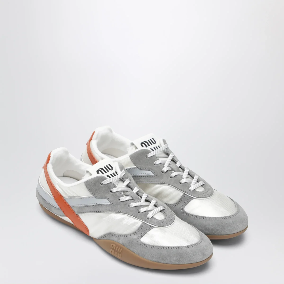 Sneakers di Miu Miu in tessuto tecnico leggero e pelle scamosciata• Colore: Talco/Papaya• Bande laterali a contrasto• Allacciatura con stringhe• Fodera in pelle• Logo serigrafato su linguetta• Suola in gomma