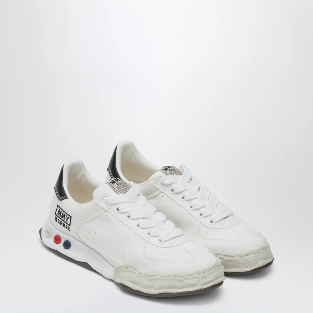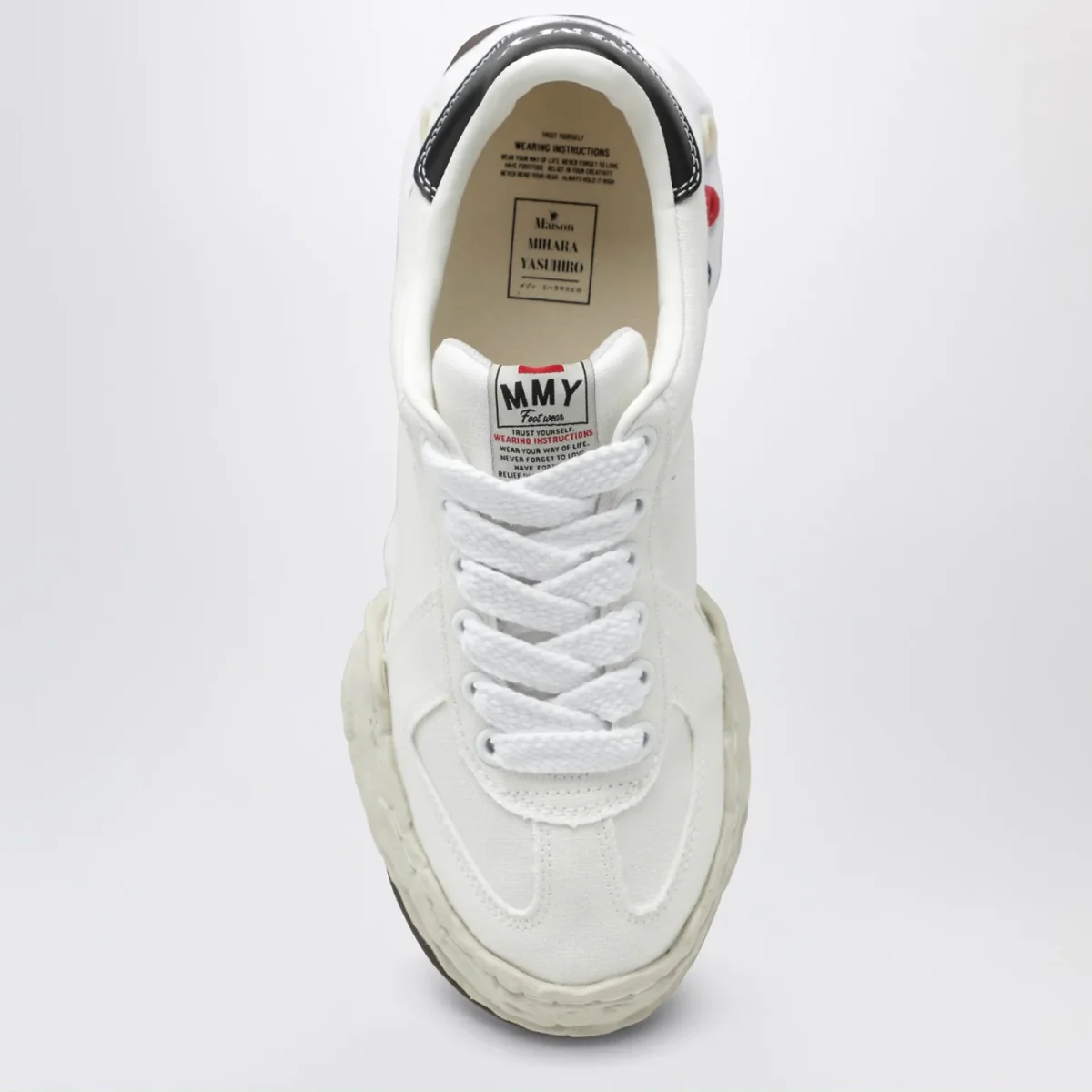 Sneaker di Maison Mihara Yasuhiro caratterizzata da tomaia in tela e gomma bianca, chiusura con lacci, linguetta con patch logo, ricamo logo laterale, tallone in pelle bianca con stampa logo, cuciture a contrasto e suola in gomma.