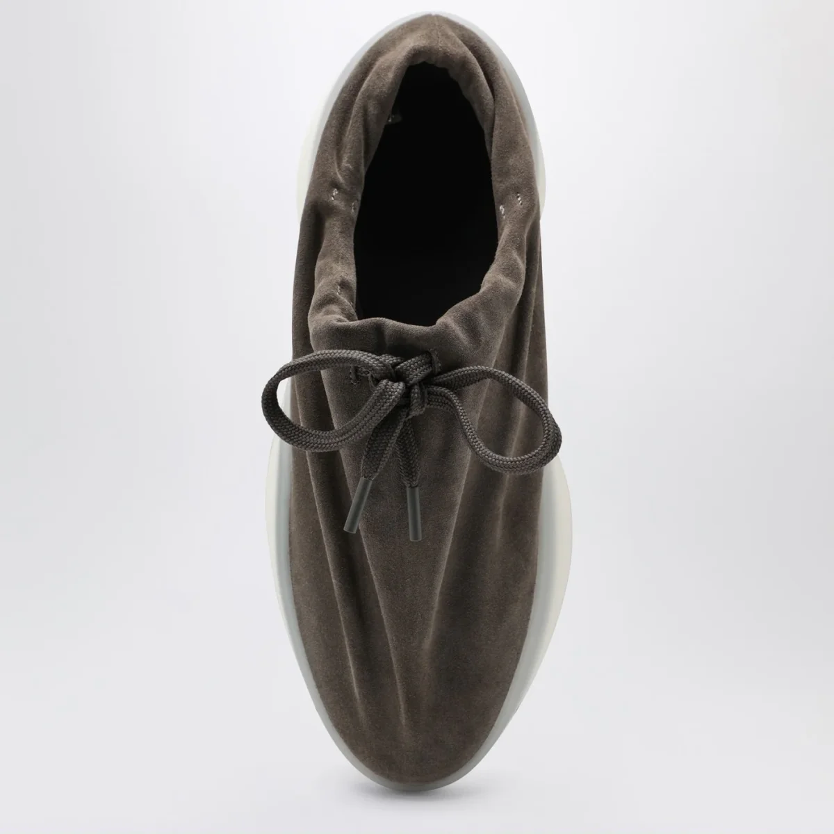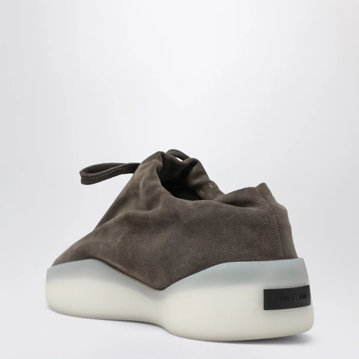Sneaker di Fear of God in pelle scamosciata color taupe, caratterizzata da punta allungata, bordo con chiusura con stringa e suola in gomma con etichetta logo nera sul retro.