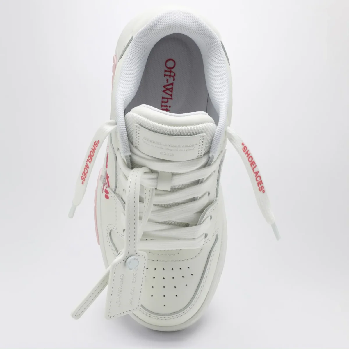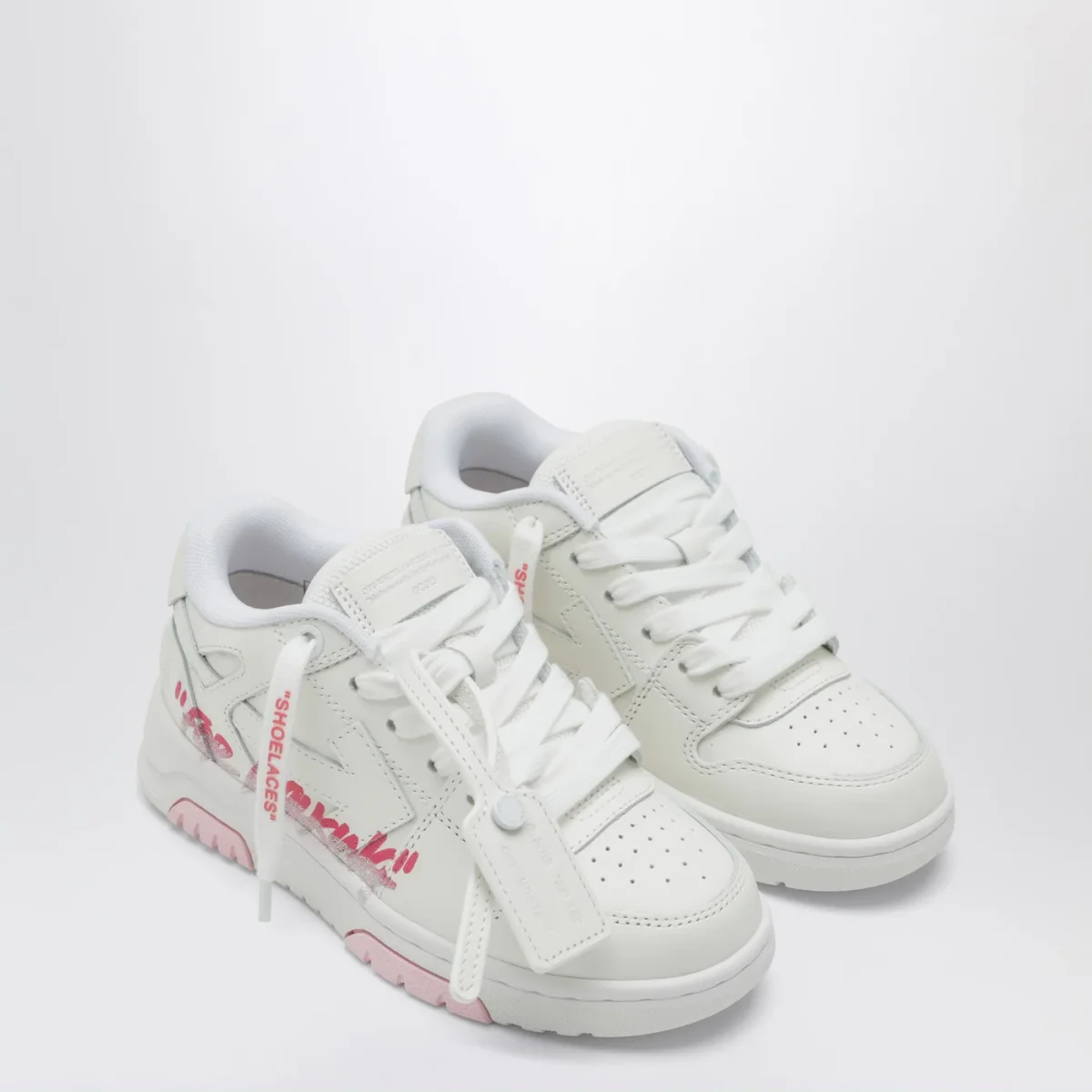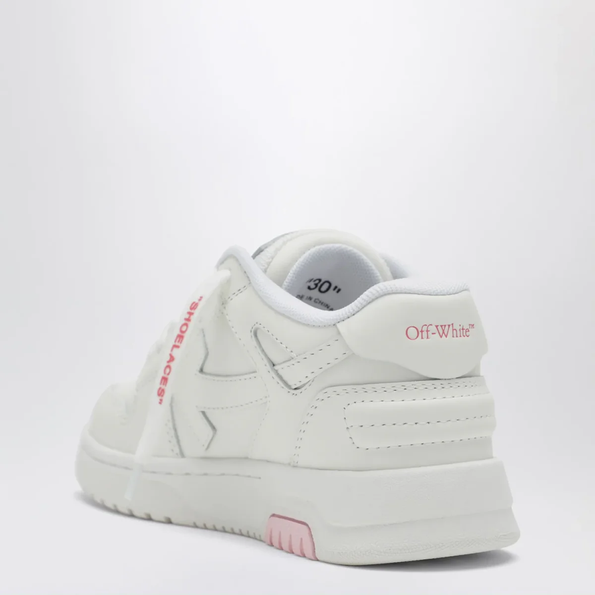 Sneaker di Off-White bianca, caratterizzata da chiusura con stringhe, targhetta con logo Zip Tie, motivo Arrows, punta tonda traforata, tallone con logo lettering, scritta For Walking rosa con glitter a contrasto sul lato e suola in gomma.