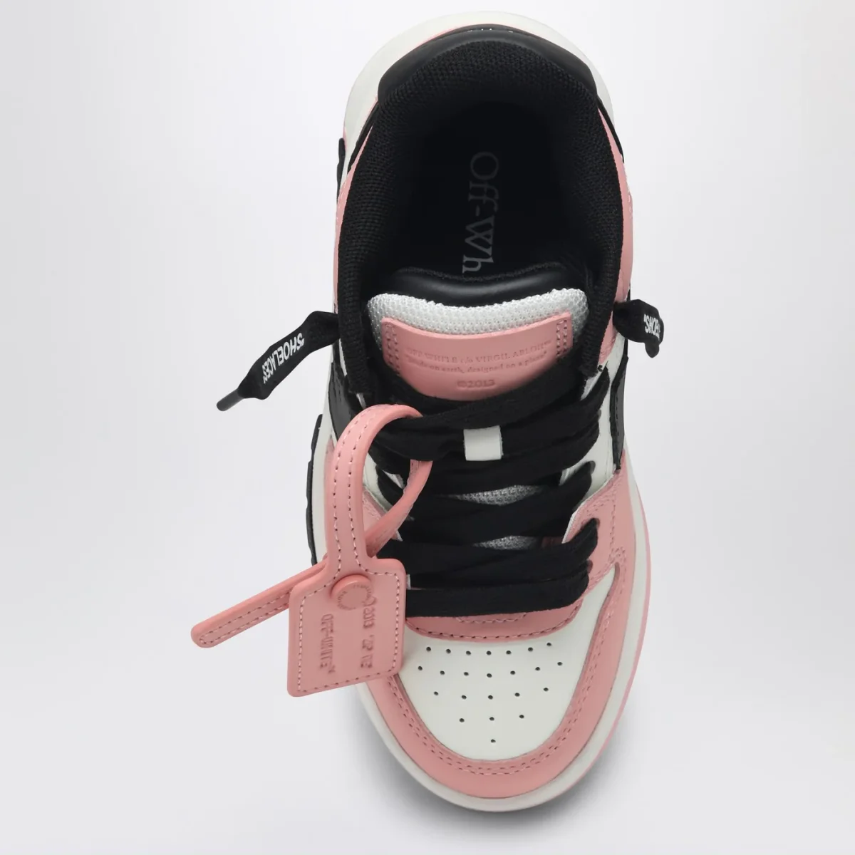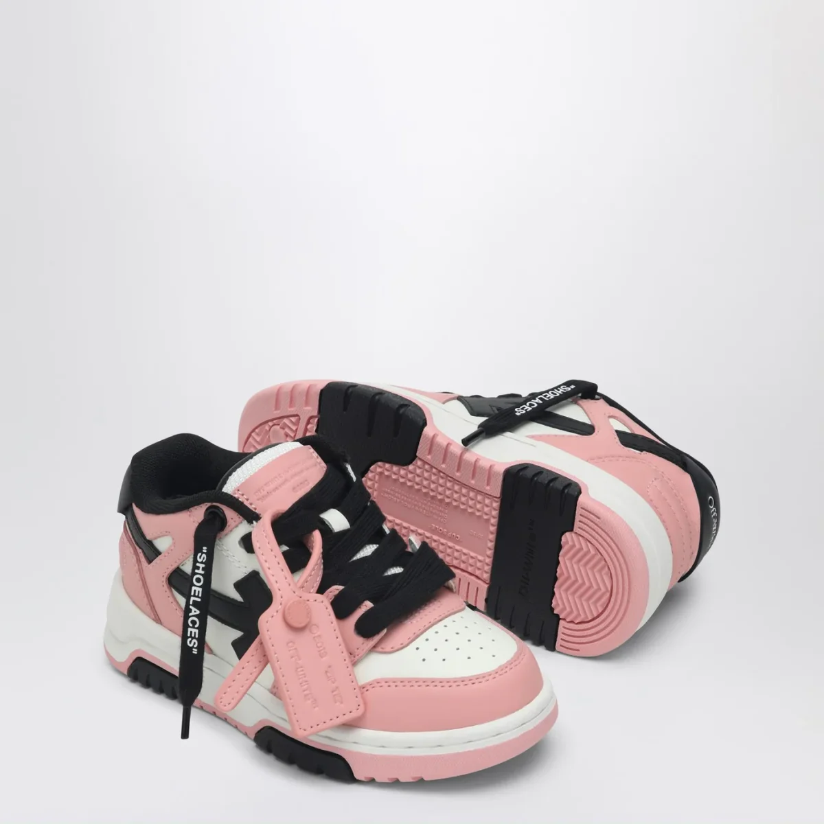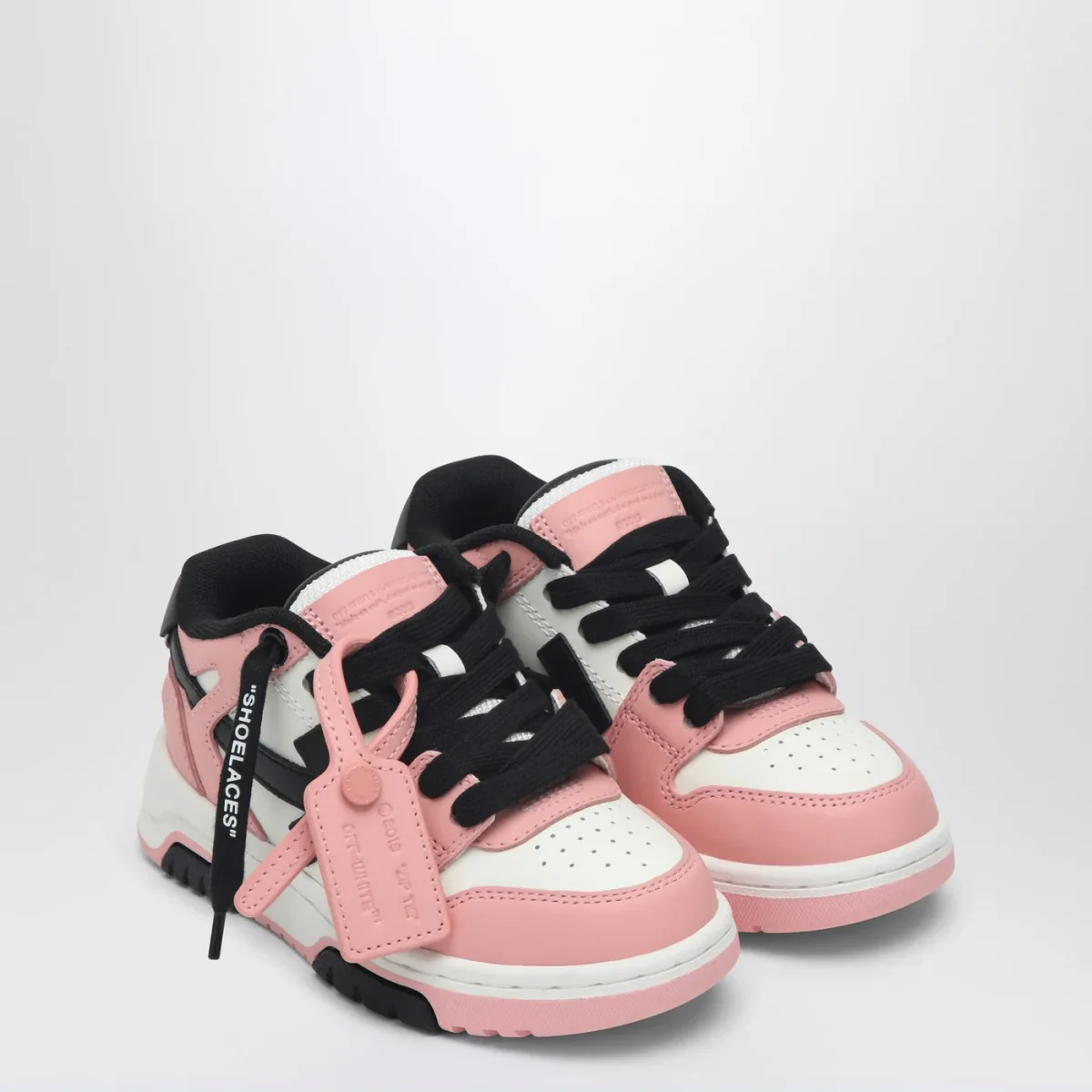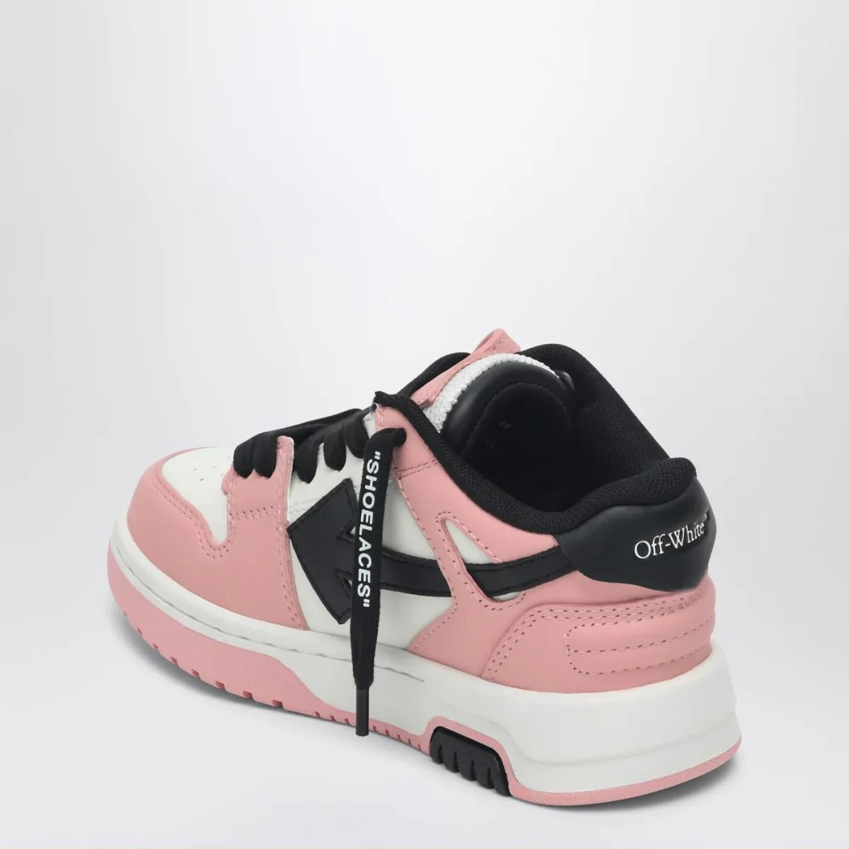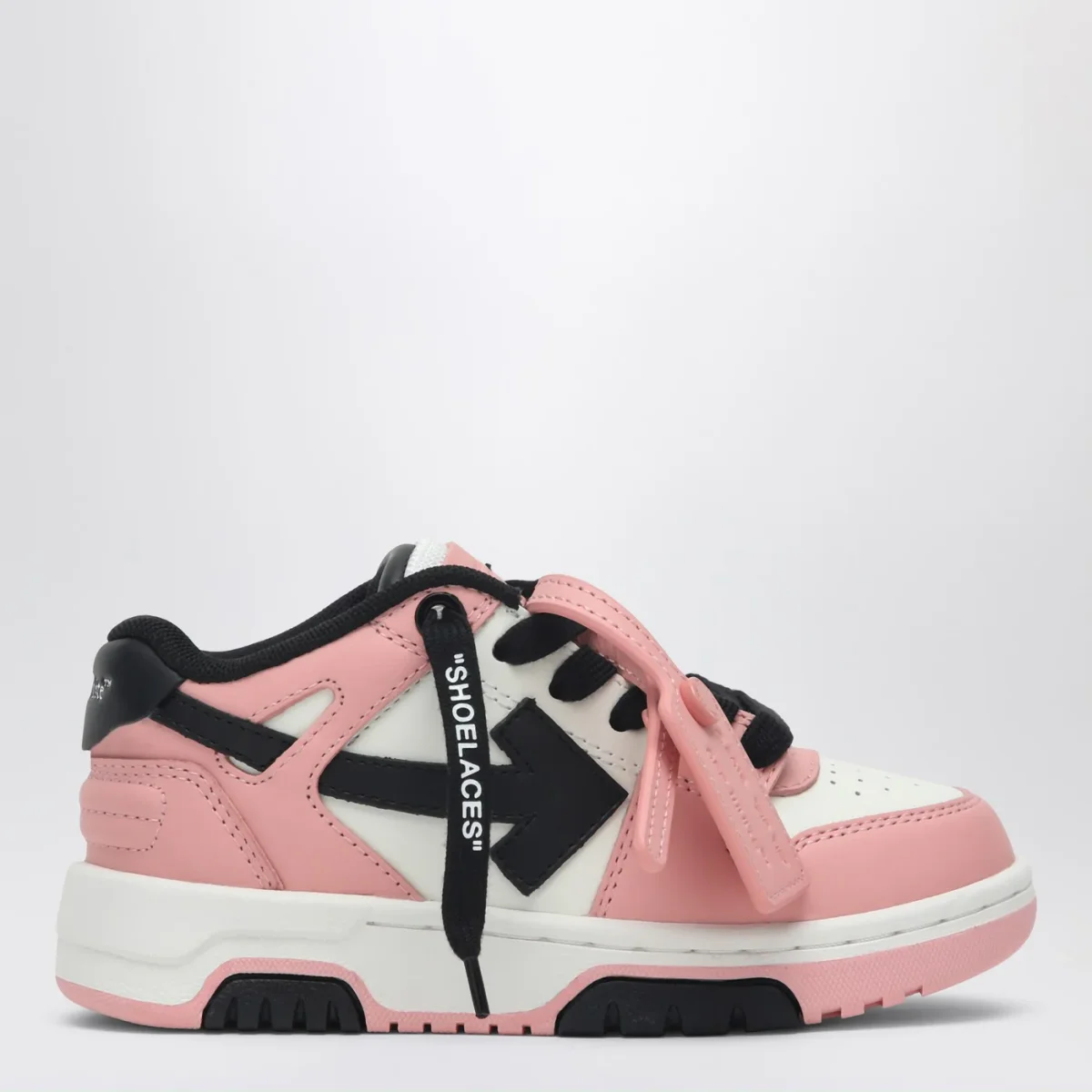 Sneaker bassa di Off-White in pelle rosa, bianca e nera, caratterizzata da chiusura con lacci, targhetta con logo Zip Tie, motivo Arrows, punta tonda traforata, tallone con logo lettering e suola in gomma.