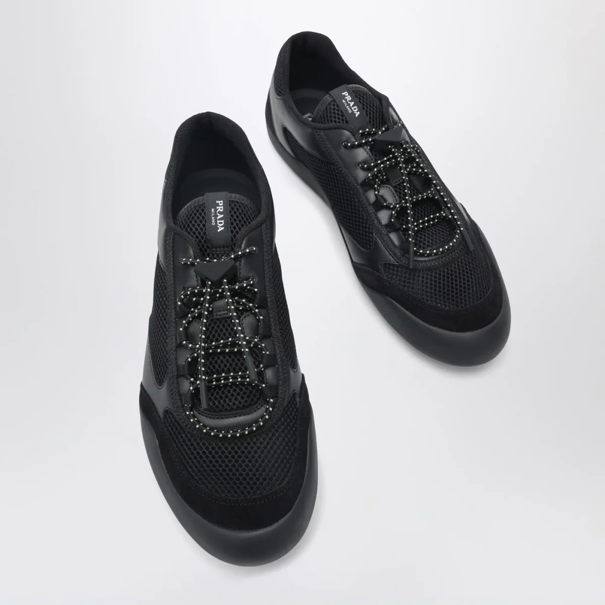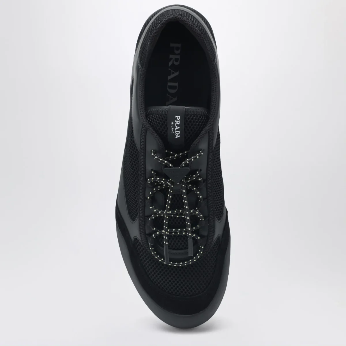 Sneaker di Prada in tessuto a rete con profili in pelle nere• chiusura con stringhe elastiche• linguetta in tessuto con patch con logo lettering• suola in gomma leggera con guscio che sale sulla tomaia• battistrada con linee geometriche