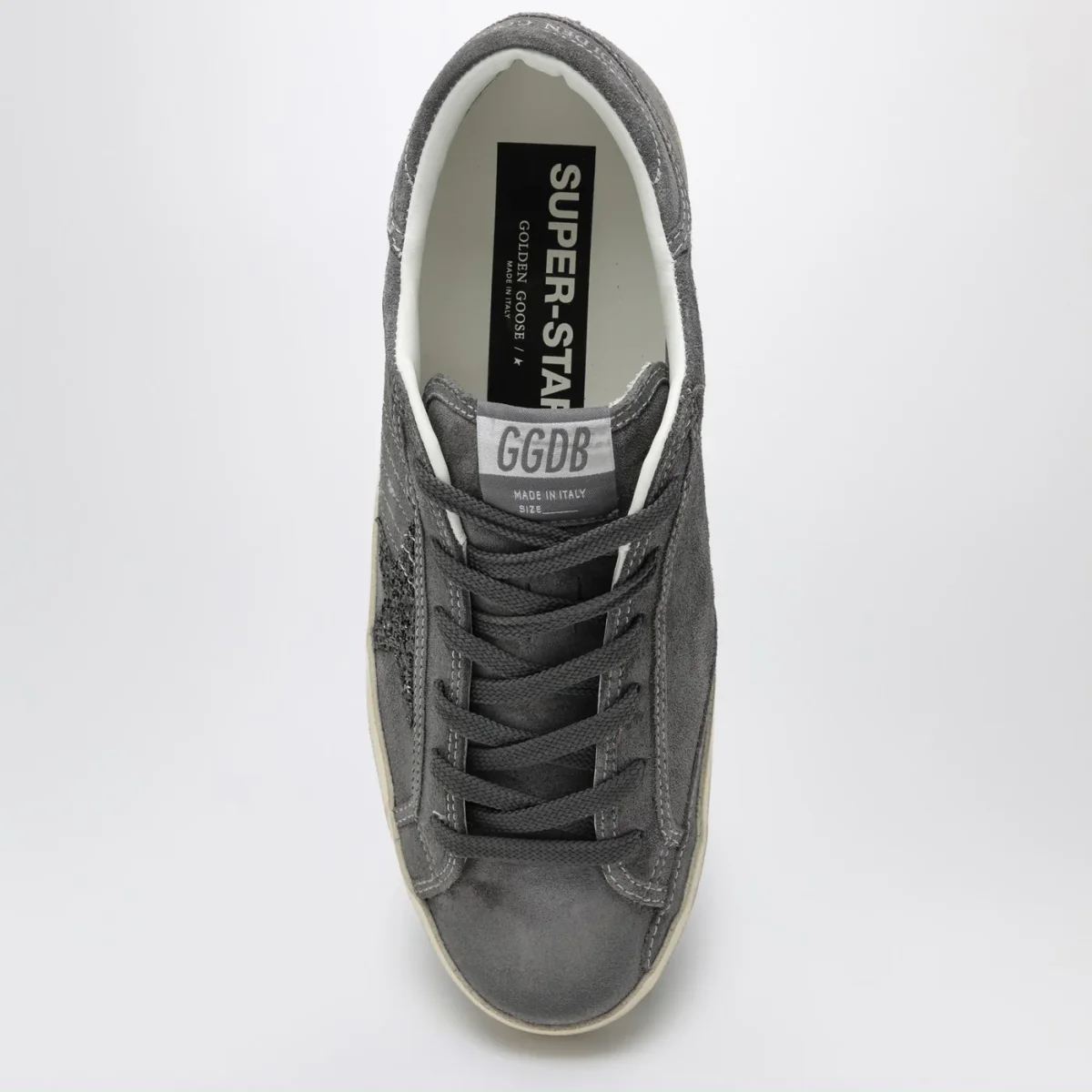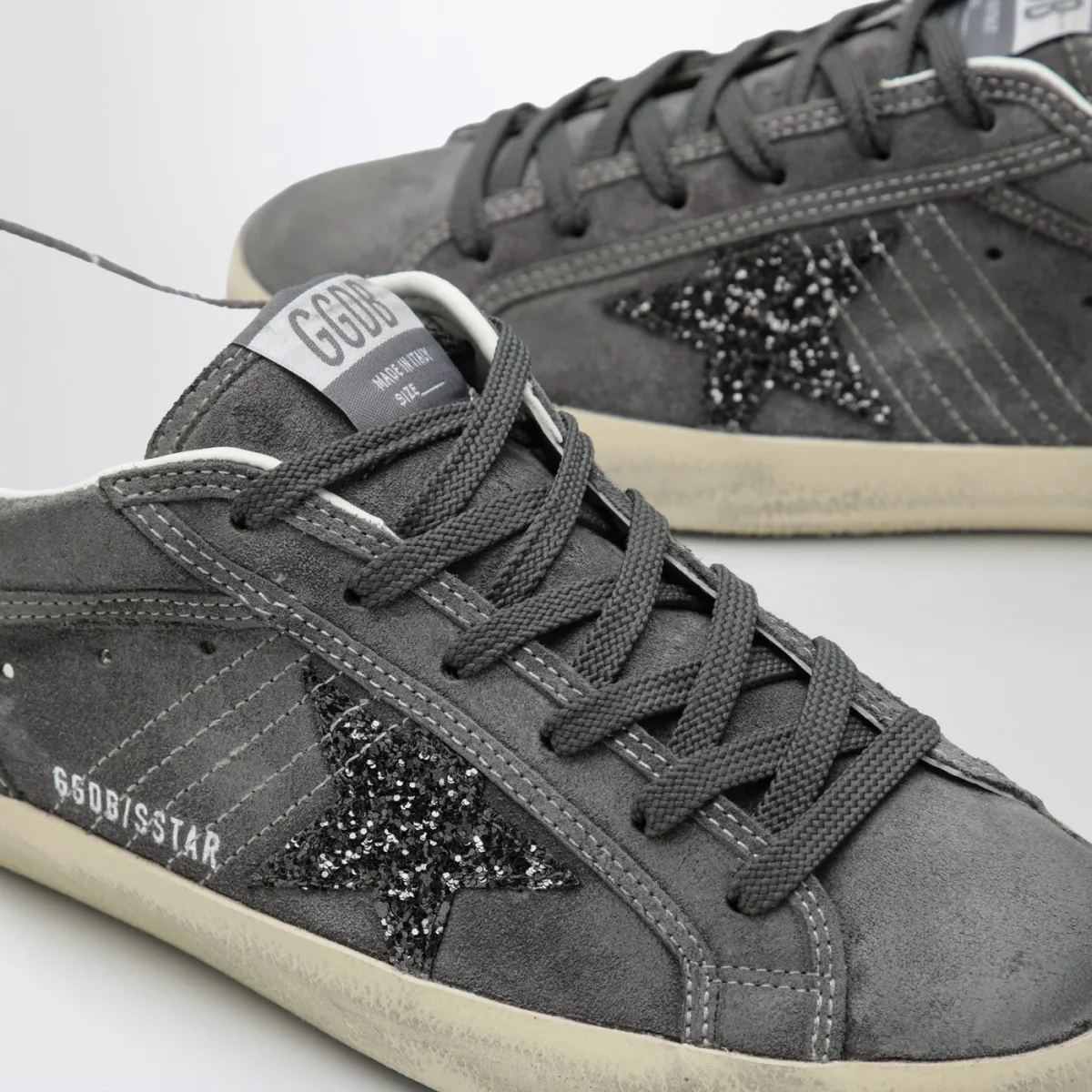 Sneaker di Golden Goose Deluxe Brand in suede grigia antracite• Patch stella laterale in glitter• Chiusura con lacci• Tallone con logo lettering• Suola in gomma• Lavorazione effetto vintage