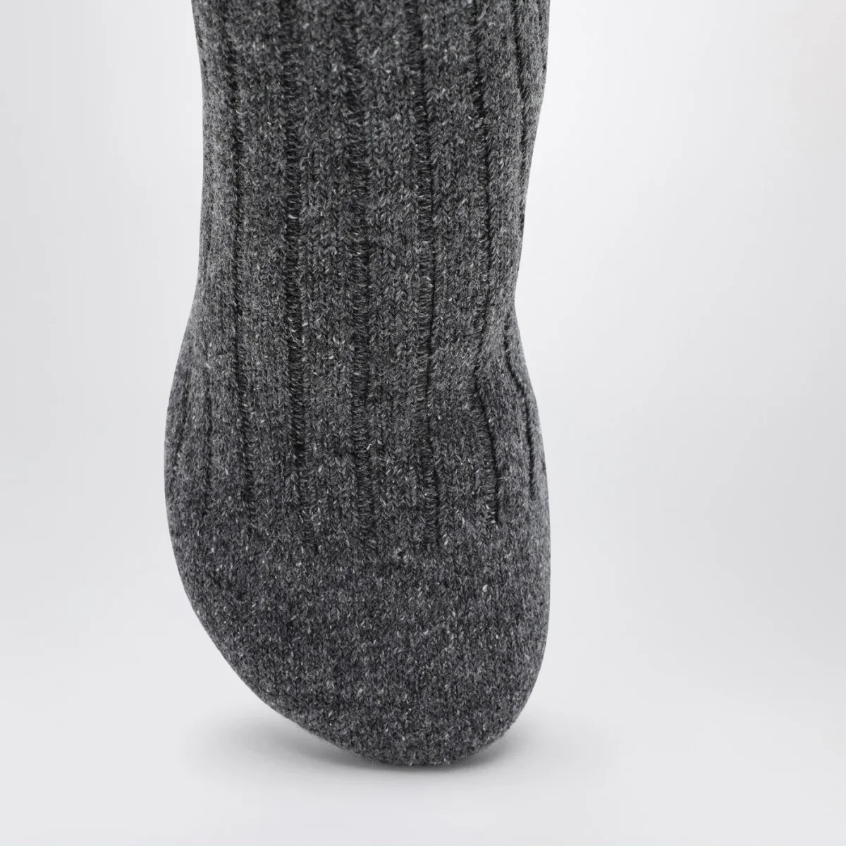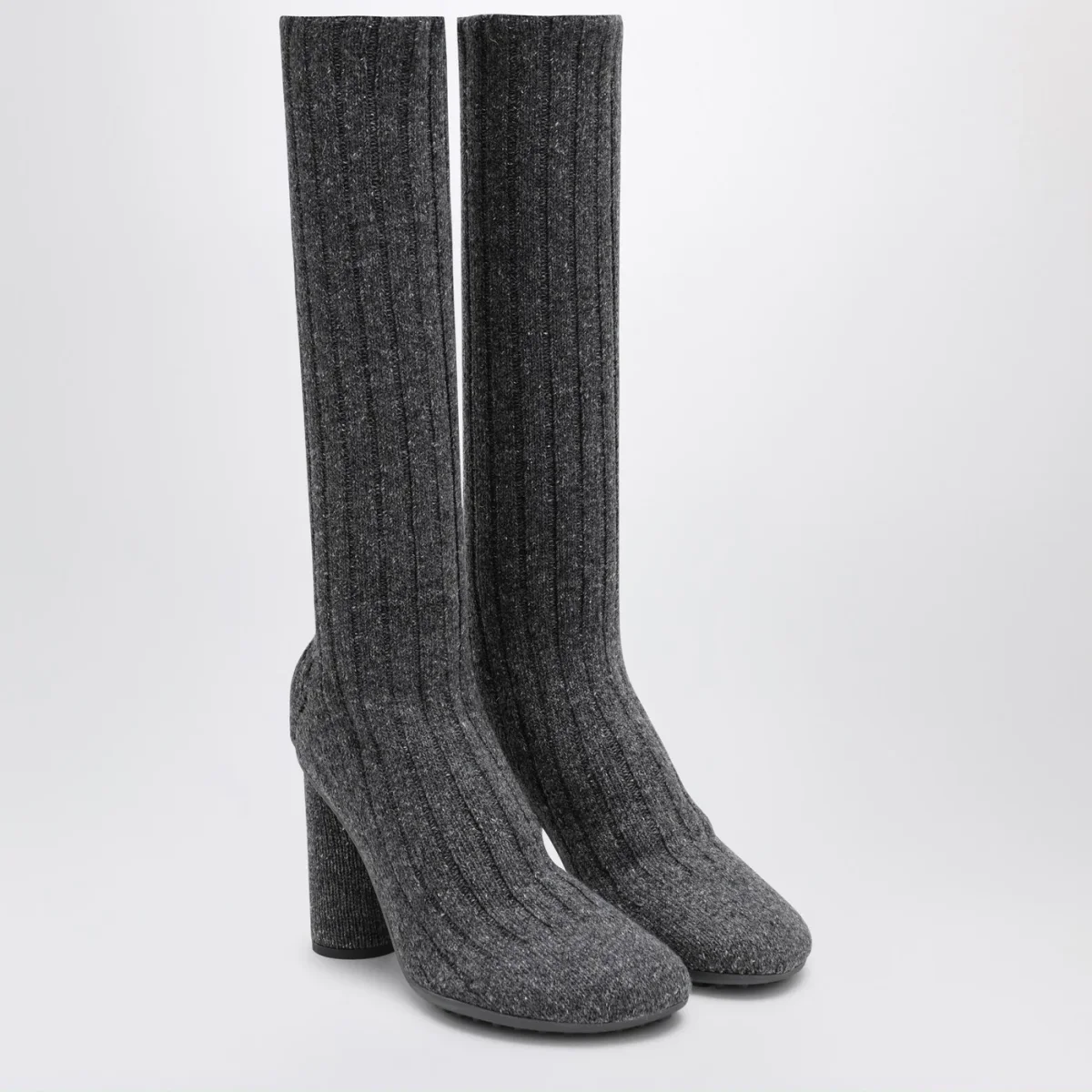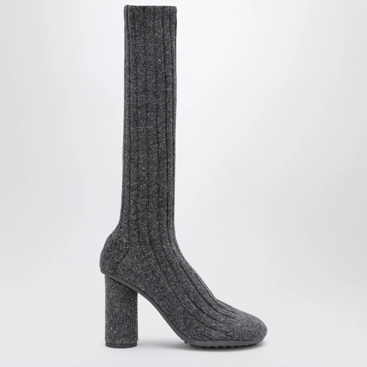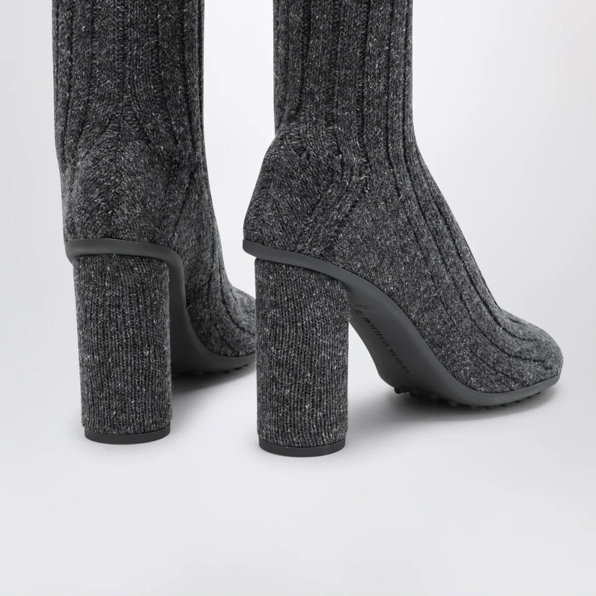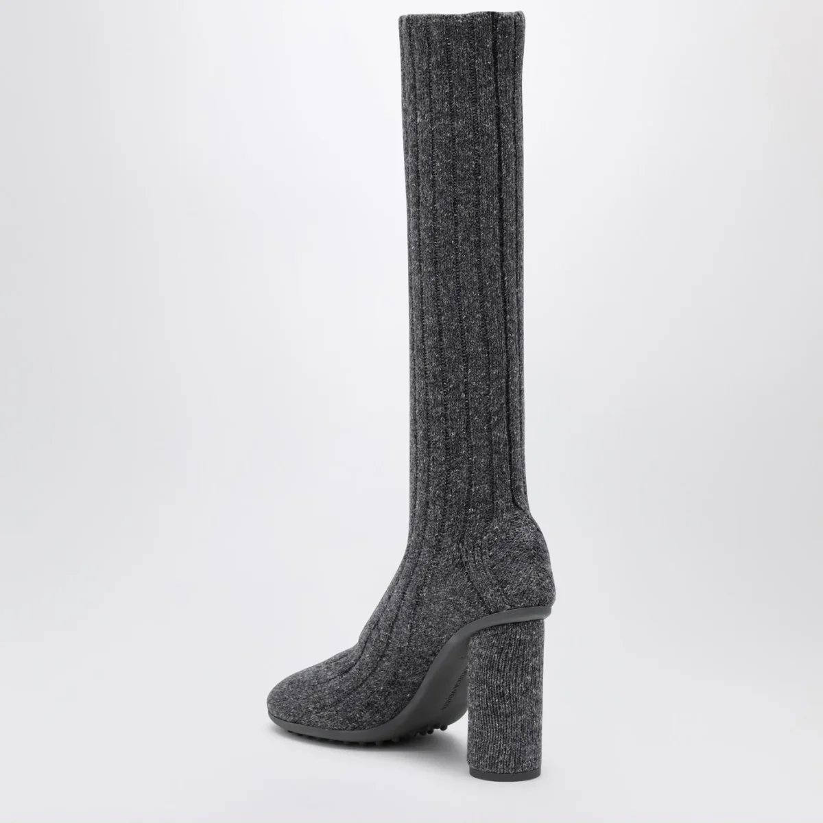 Stivale di Bottega Veneta in misto lana, seta e poliammide riciclata grigio antracite, caratterizzato da design a maglia effetto calza, punta tonda, tacco alto e suola in gomma.