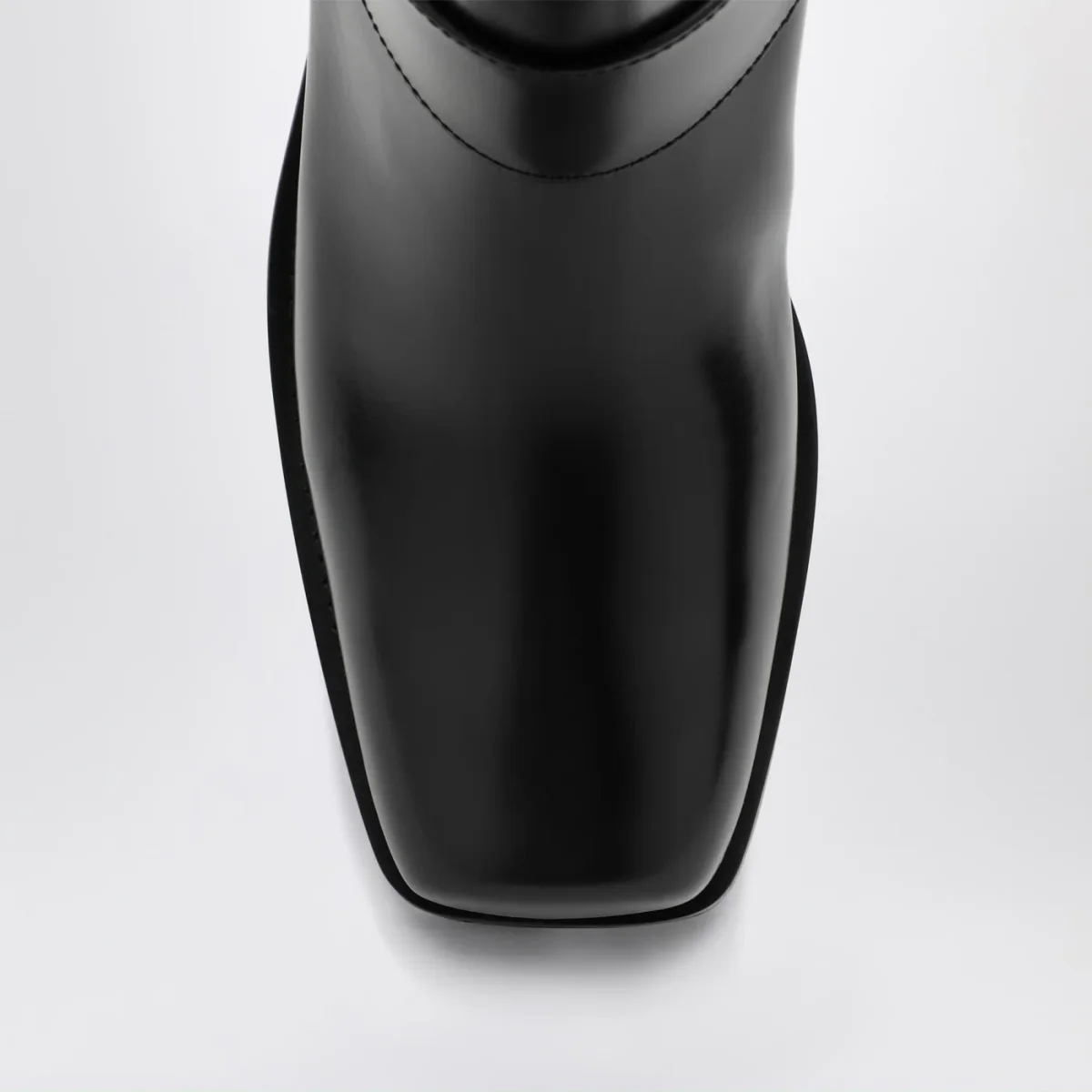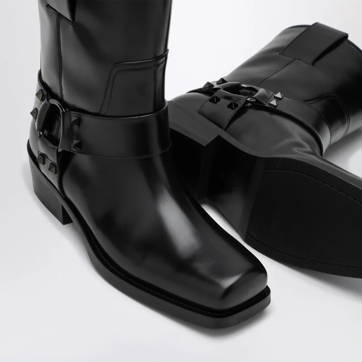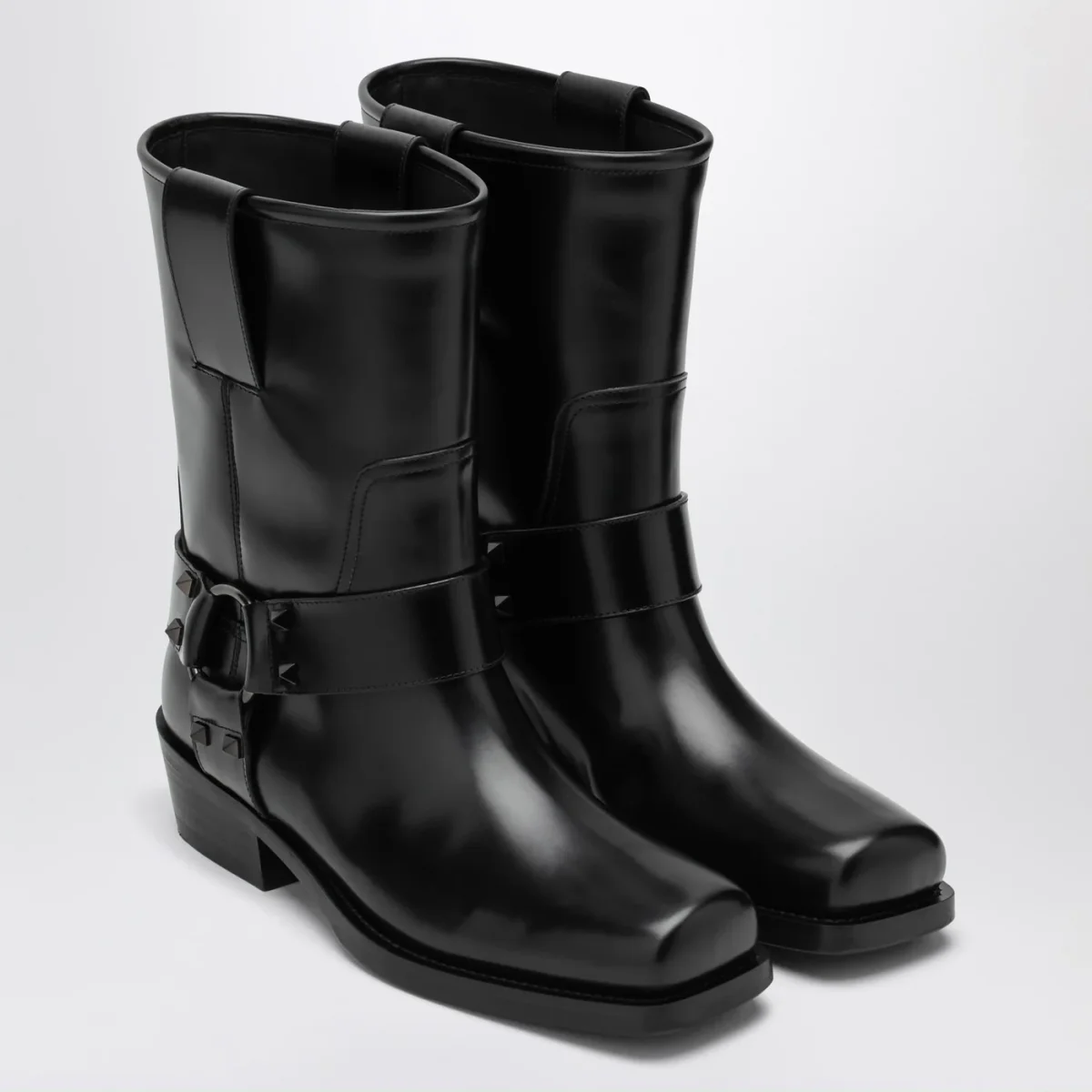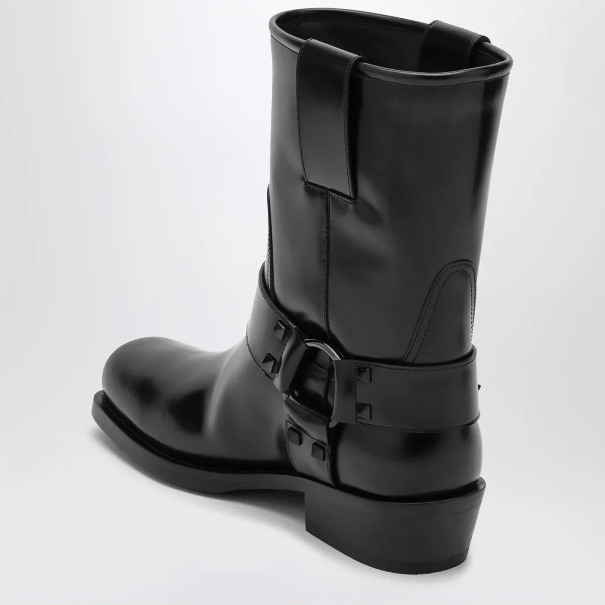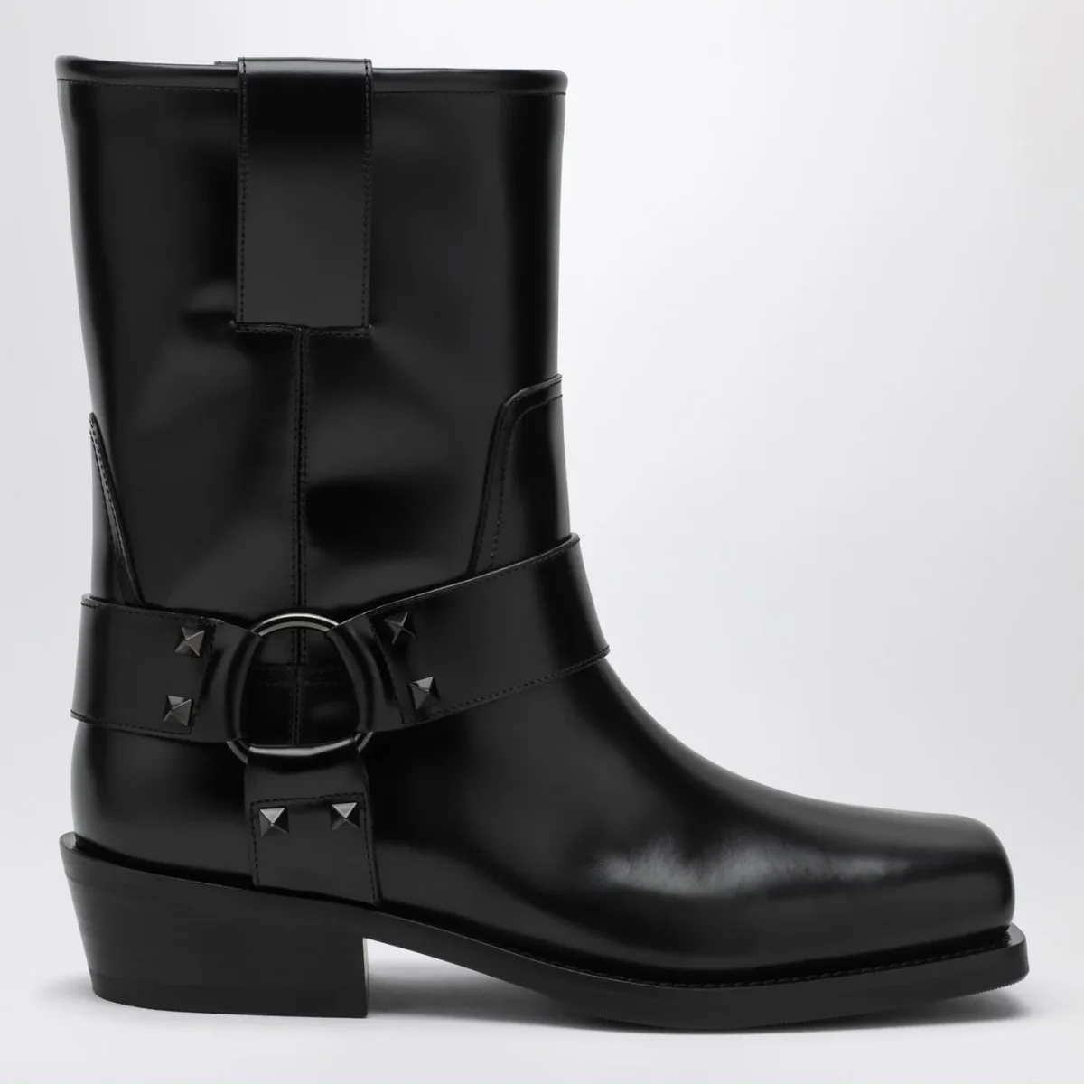 Stivale basso di Valentino Garavani in pelle di vitello caratterizzato da cinturino con accessorio e borchie tono su tono, punta squadrata e suola in gomma.