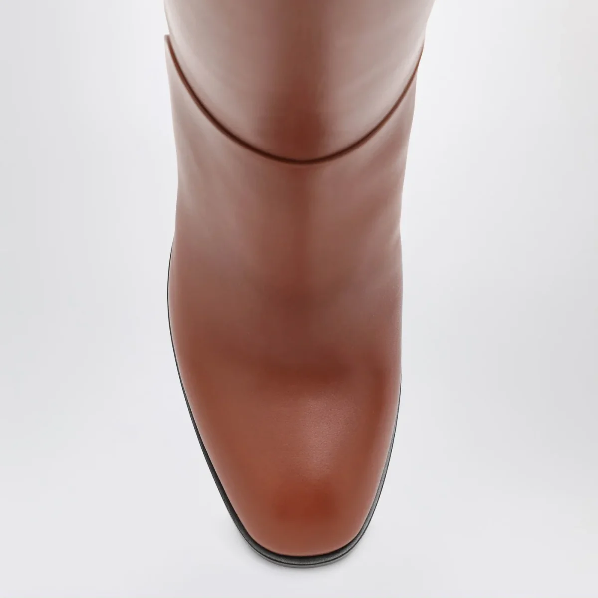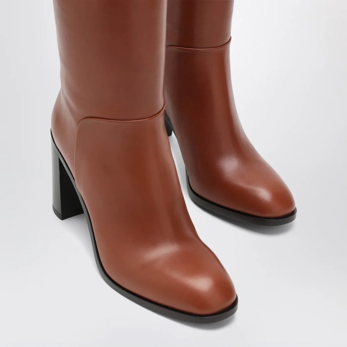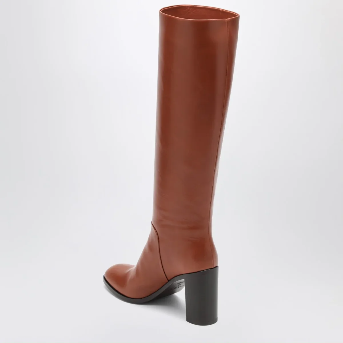 Stivale di Sartore in pelle color marrone bruciato caratterizzato da gambale alto, punta a mandorla, tacco spesso e suola in cuoio.