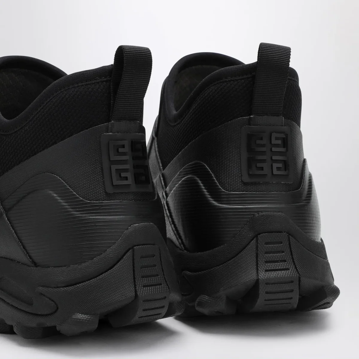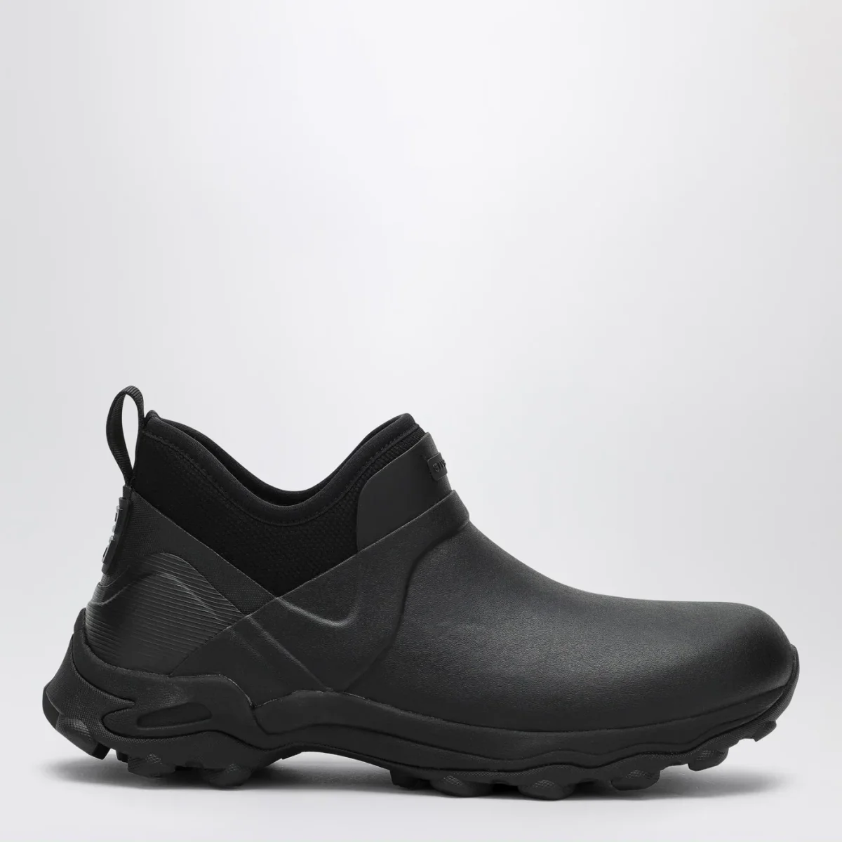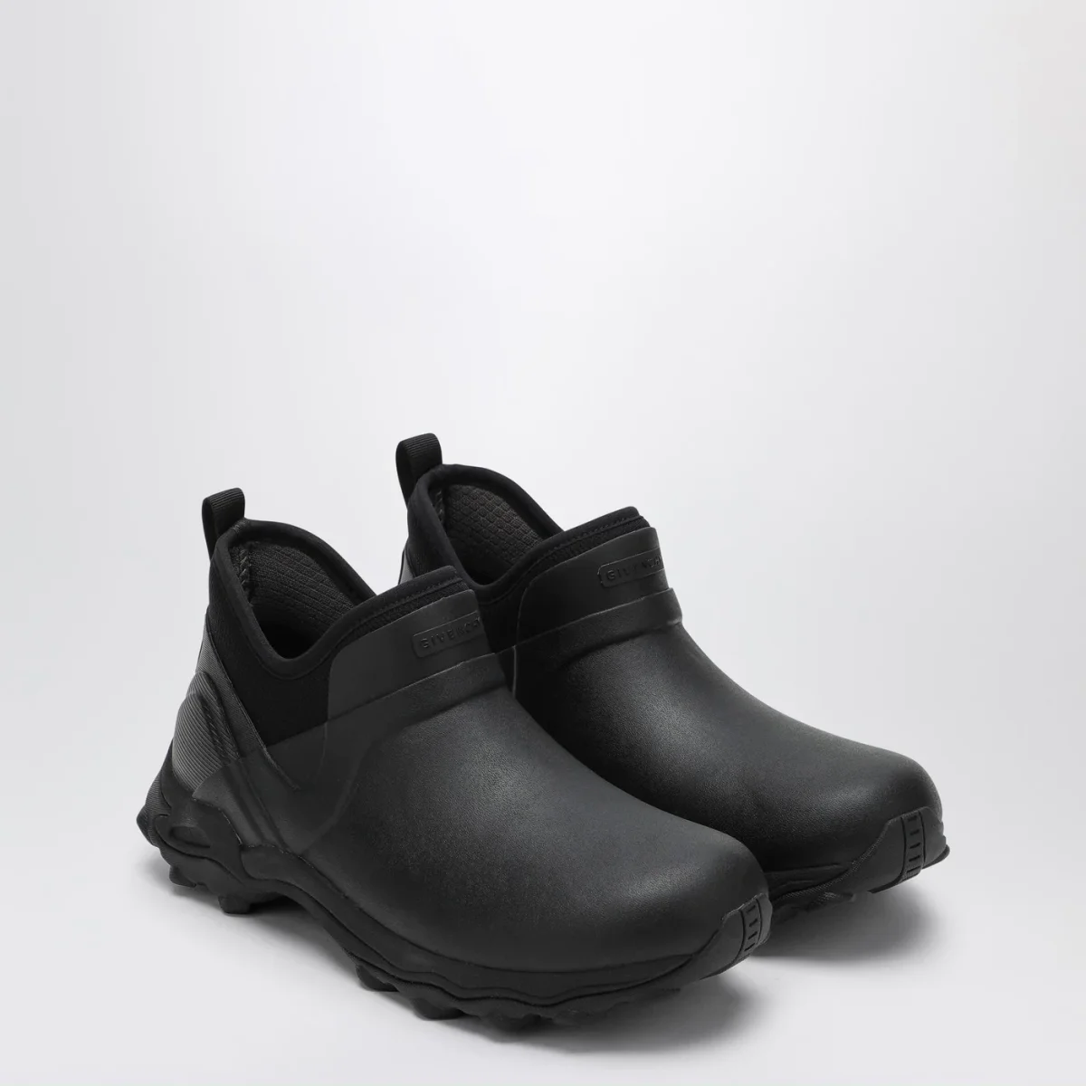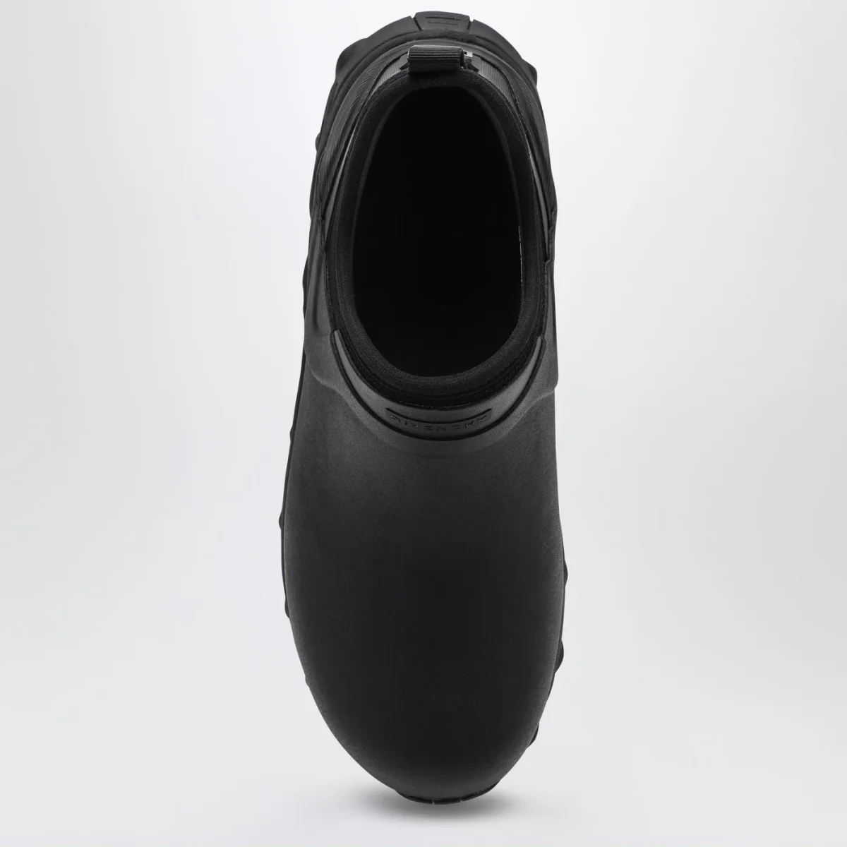 Stivale basso di Givenchy in gomma e neoprene nero, caratterizzato da punta tonda, logo lettering sul davanti, logo 4G sul retro, linguetta posteriore e suola in gomma.