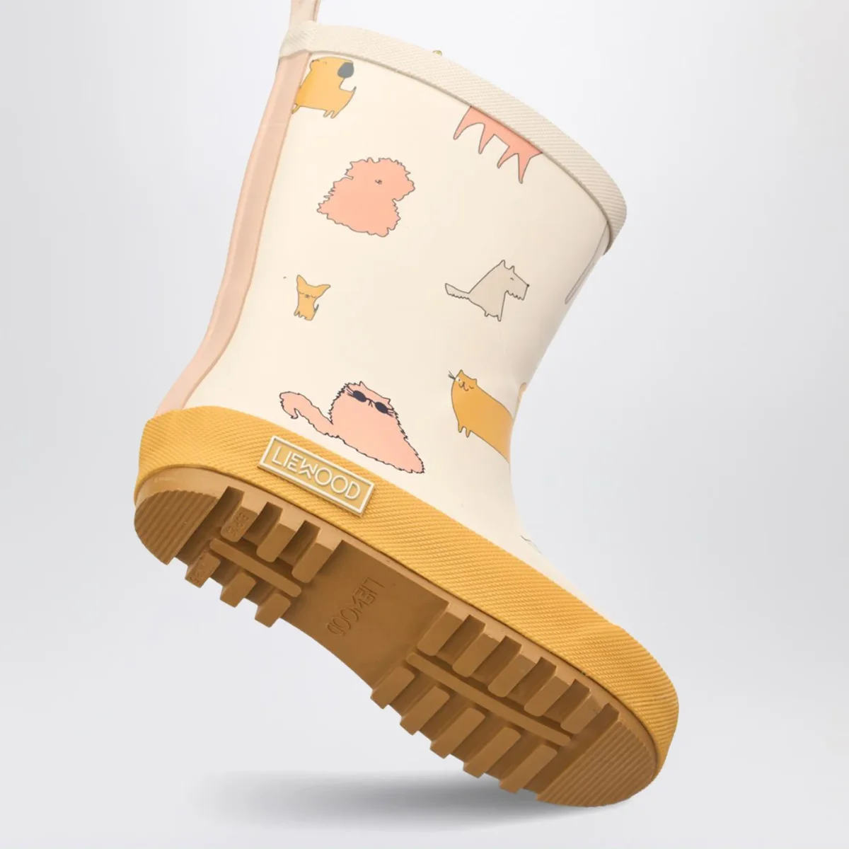 Stivale da pioggia termico alto di Liewood in gomma impermeabile con cani e gatti all over, caratterizzato da punta tonda, fodera in pile, tirante sul retro e suola in gomma antiscivolo con patch con logo lettering sul lato.