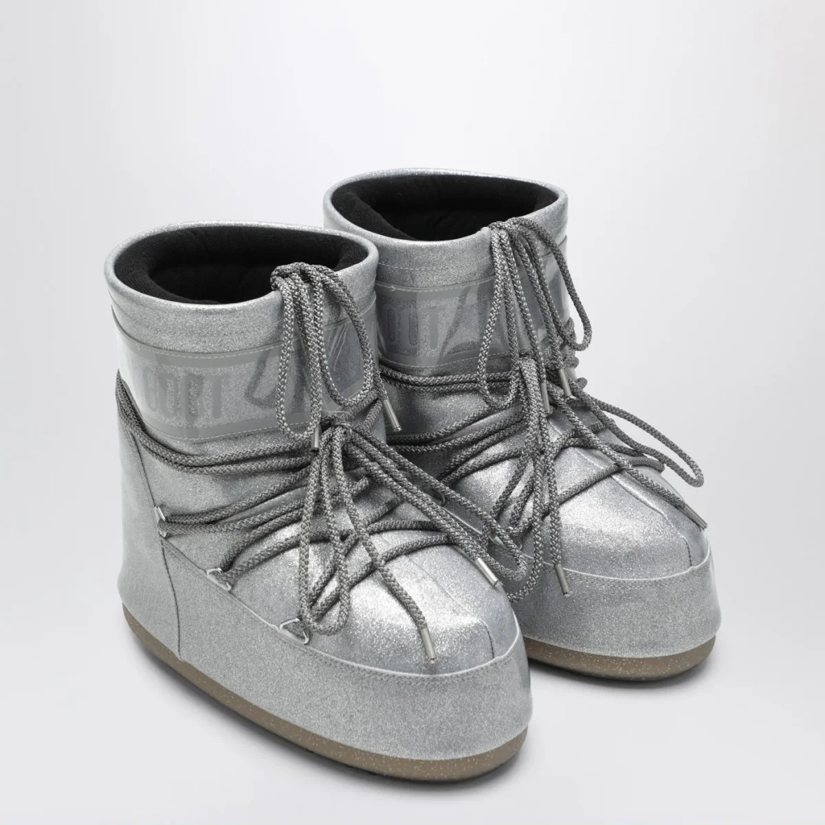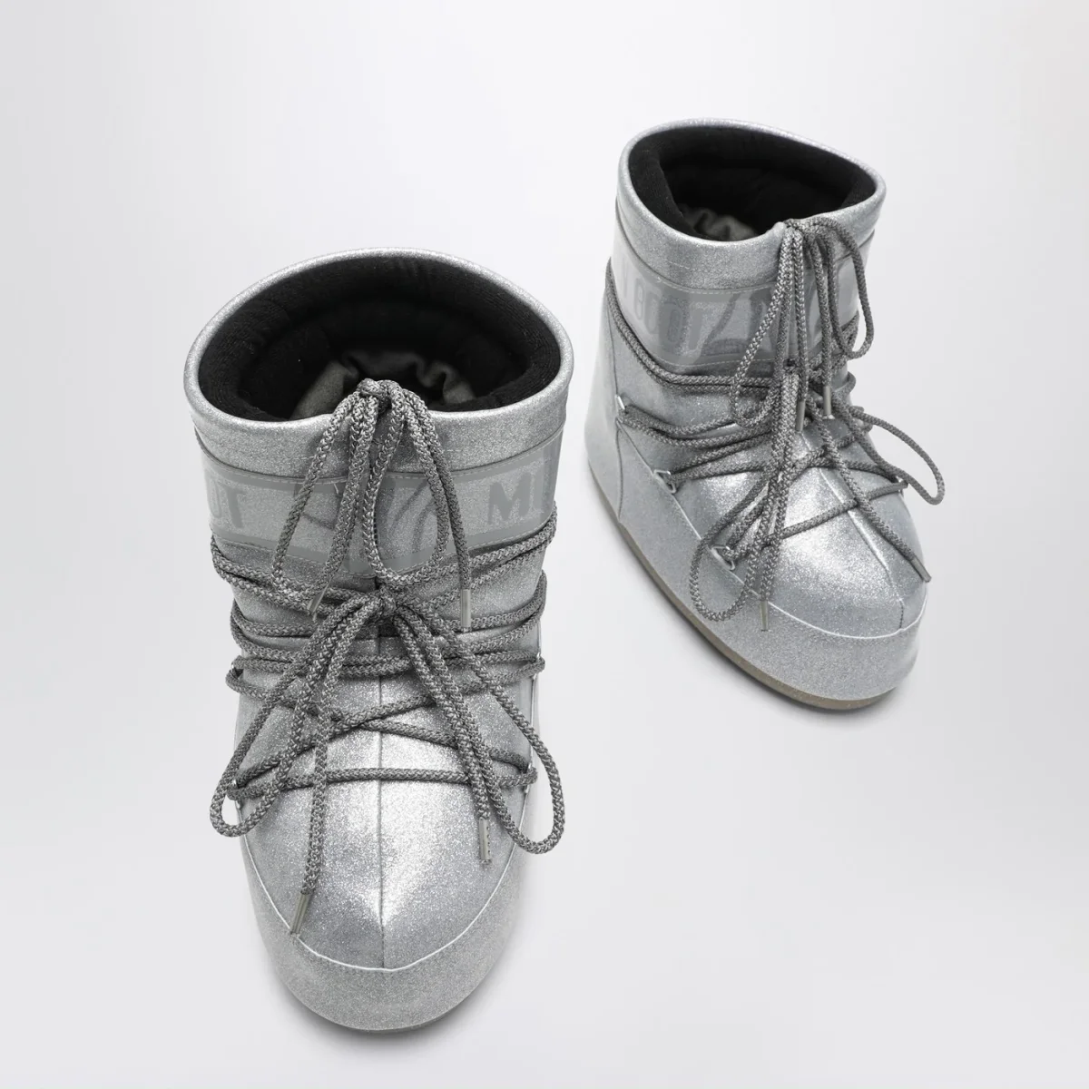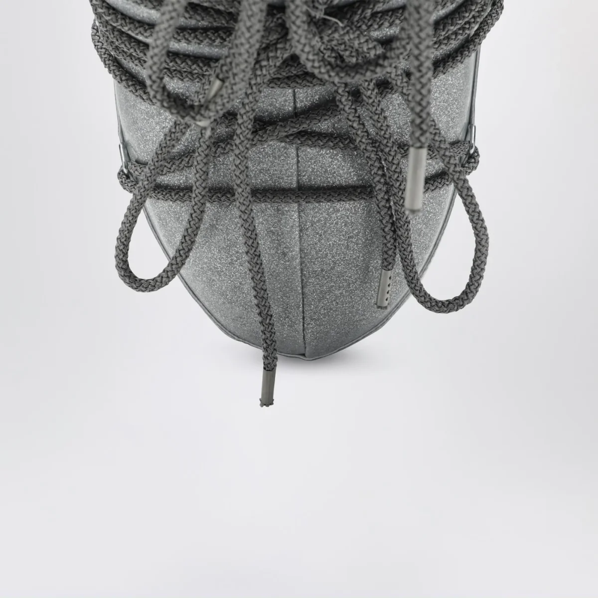 Stivale di Moon Boot in nylon argento con glitter, caratterizzato da interno imbottito, design genderless ambidestro, fascia con logo, tallone e finiture con logo, occhielli in metallo color argento, lacci tubolari a incrocio, coulisse regolabile, intersuola in gomma termoplastica e battistrada in gomma termoplastica antiscivolo.