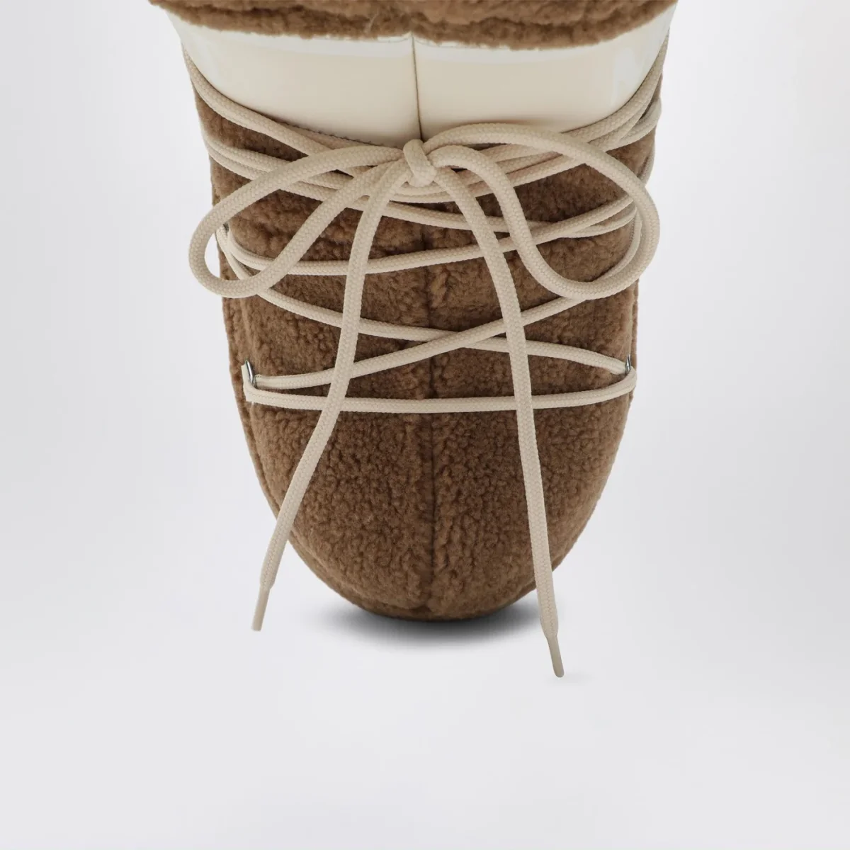Stivale di Moon Boot in tessuto teddy color cammello, caratterizzato da interno imbottito, design genderless ambidestro, fascia con logo, tallone e finiture con logo, occhielli in metallo color argento, lacci tubolari a incrocio bicolori, coulisse regolabile, intersuola in gomma termoplastica e battistrada in gomma termoplastica antiscivolo.