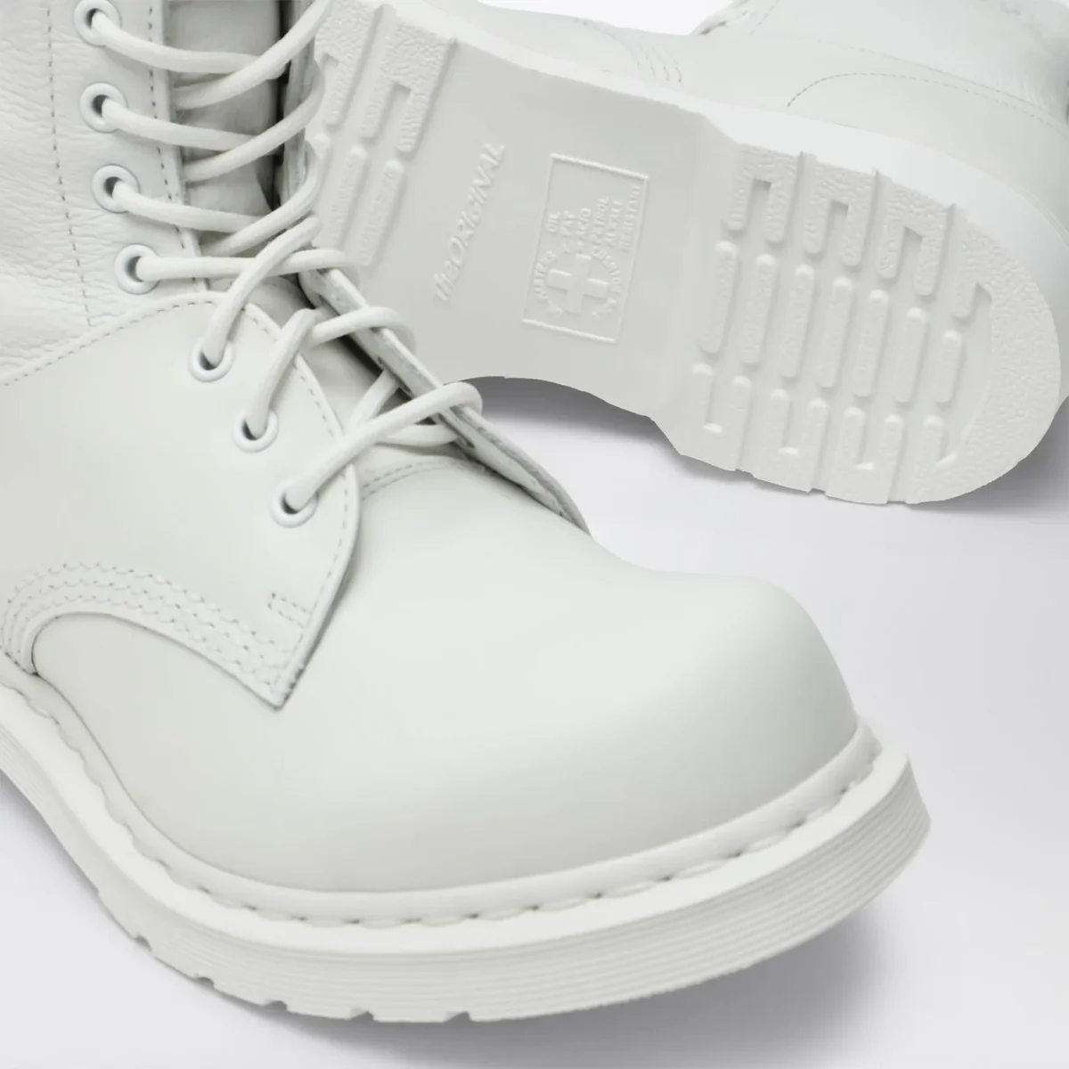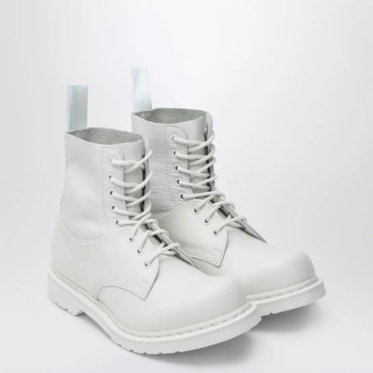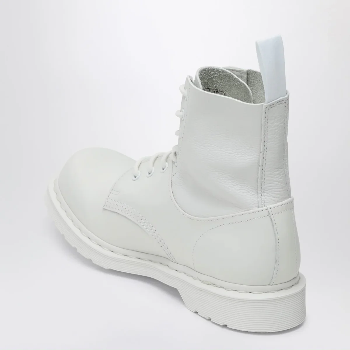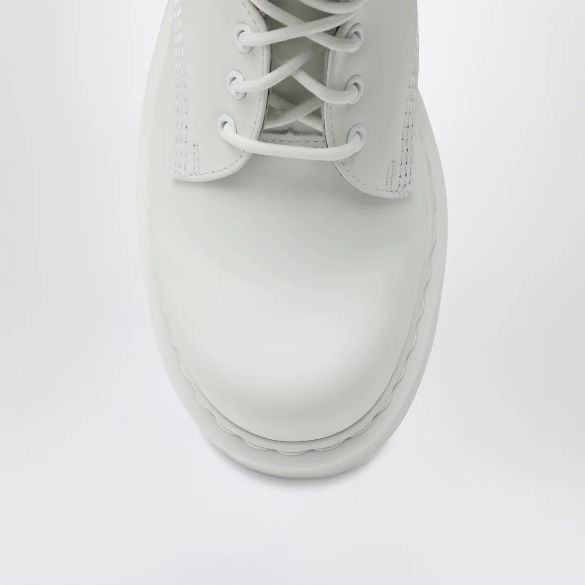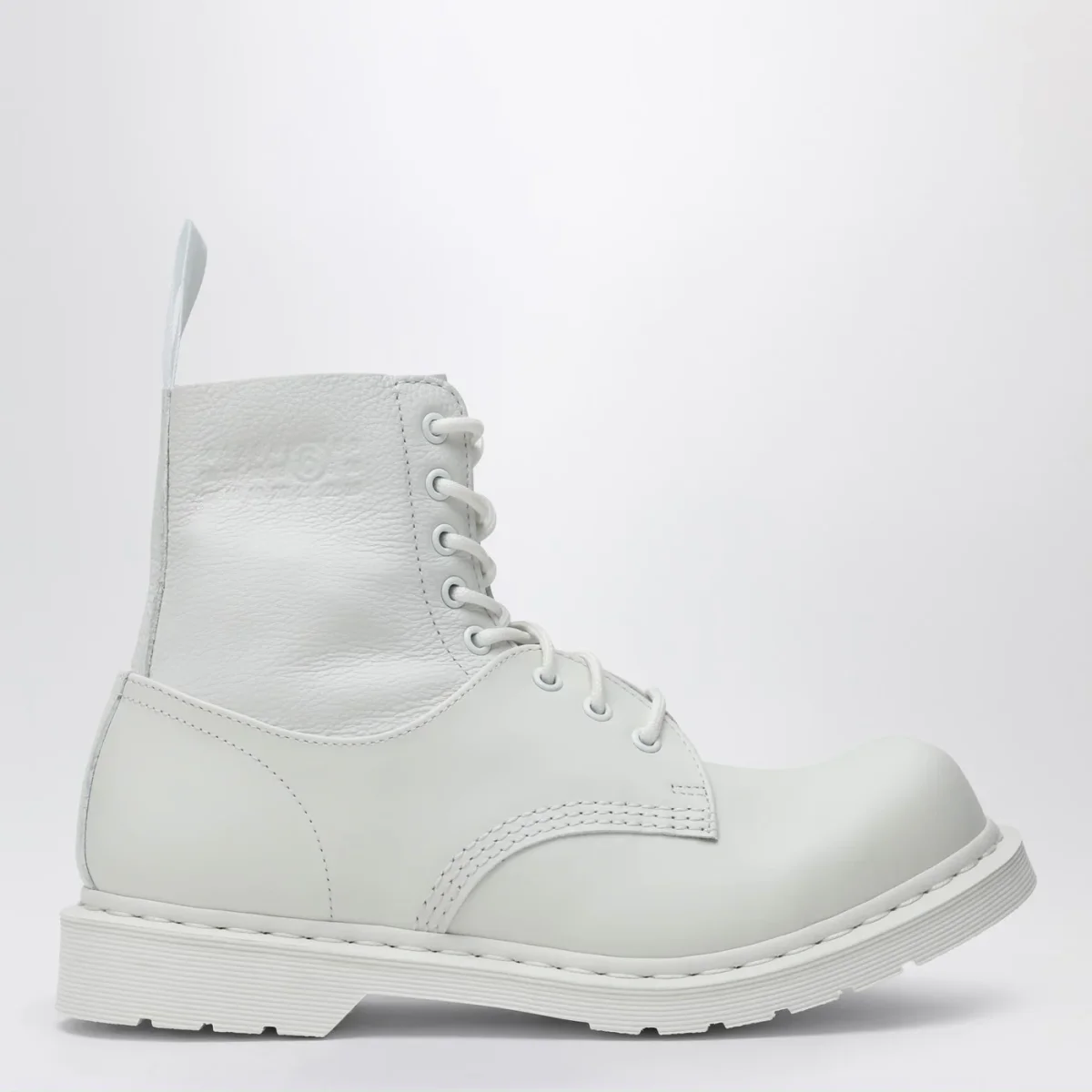 Stivale stringato di MM6 Maison Margiela realizzato in collaborazione con Dr. Martens in pelle bianco, caratterizzato da punta tonda, cuciture tono su tono, chiusura con stringhe, tirante posteriore, logo Numeric Signature sul lato e suola in gomma.