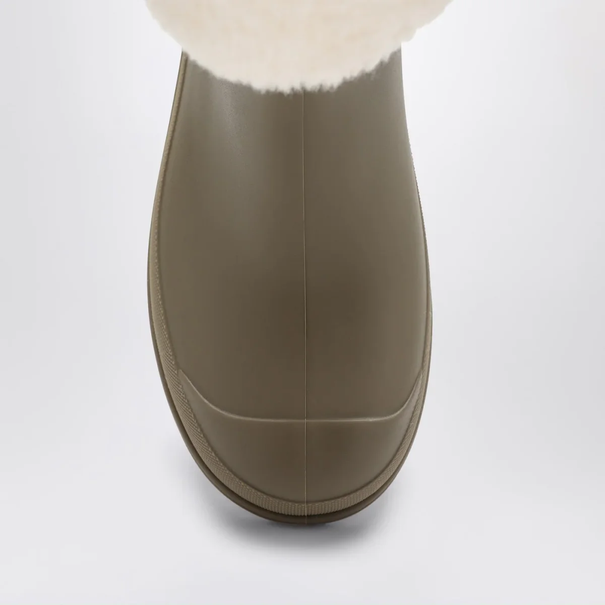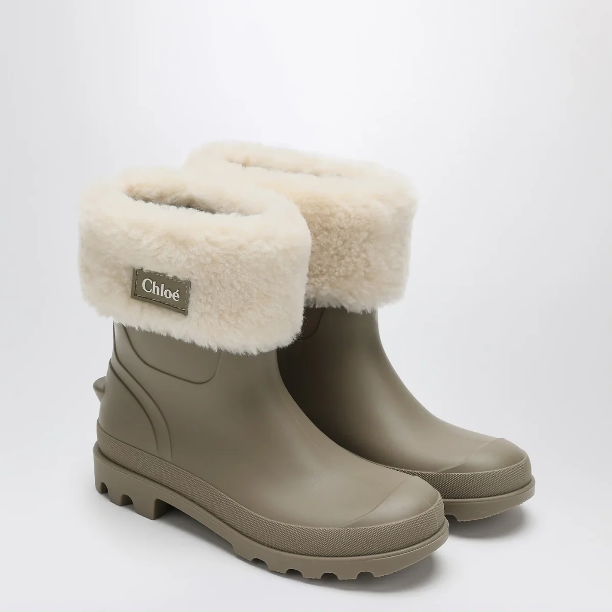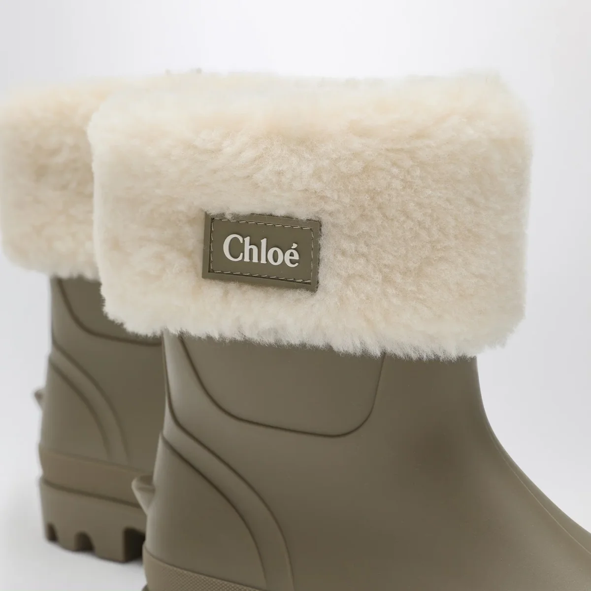 Stivale di Chloé in gomma verde vetiver, caratterizzato da punta tonda, risvolto a contrasto in shearling con patch con logo lettering e suola dentellata.