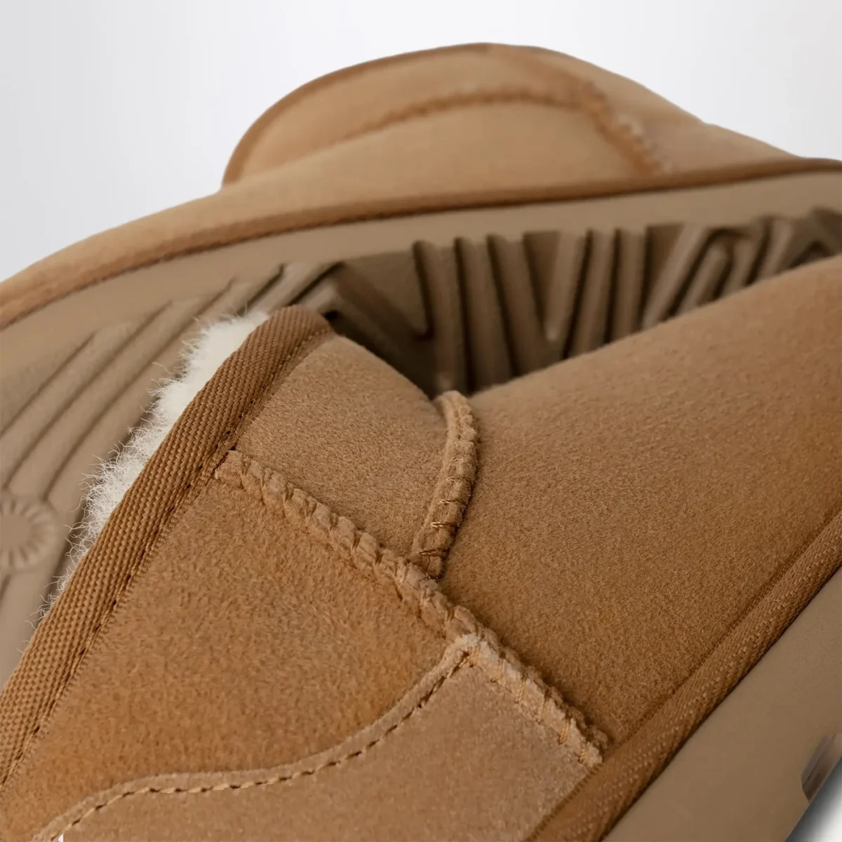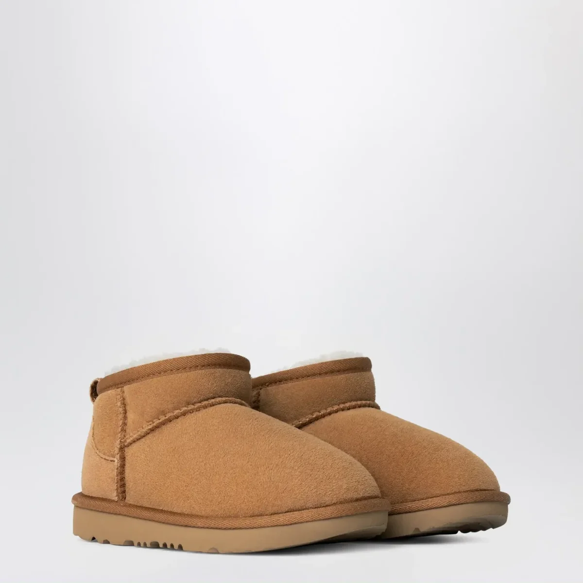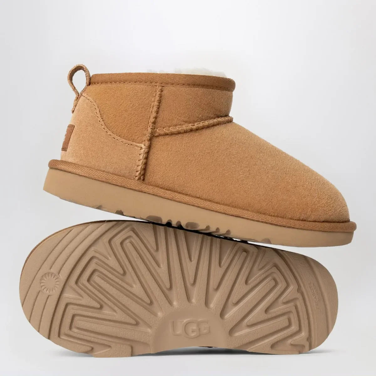 Stivaletti bassi di UGG in pelle scamosciata color castagna, caratterizzati da tomaia in montone rovesciato, punta tonda, bordo in nylon, patch con logo lettering posteriore, tirante sul retro e suola Treadlite by UGG.