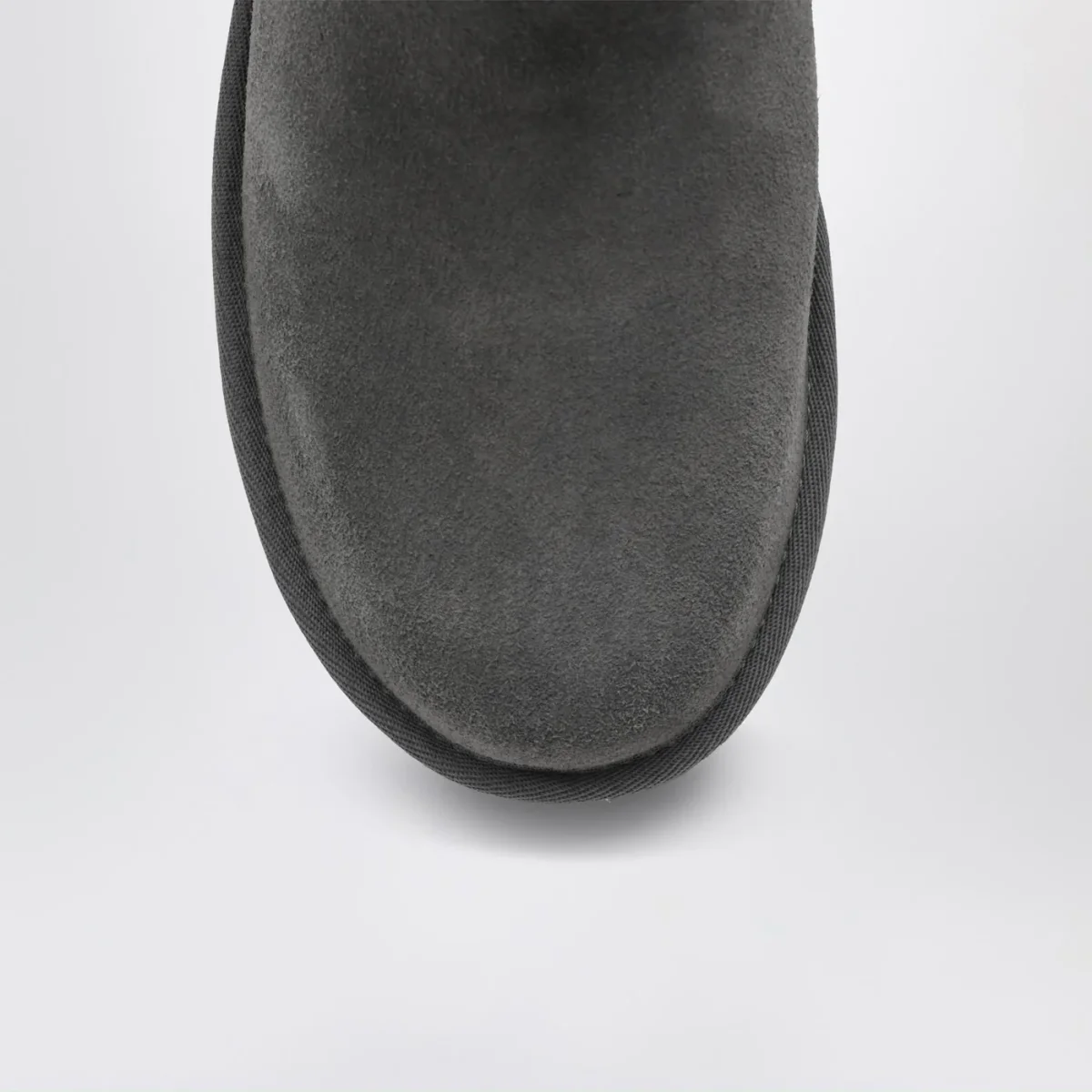 Stivaletti di UGG in montone rovesciato e pelle scamosciata grigi, caratterizzati da punta tonda, tirante posteriore, cuciture overlock, patch in suede posteriore con logo lettering e suola platform in gomma.