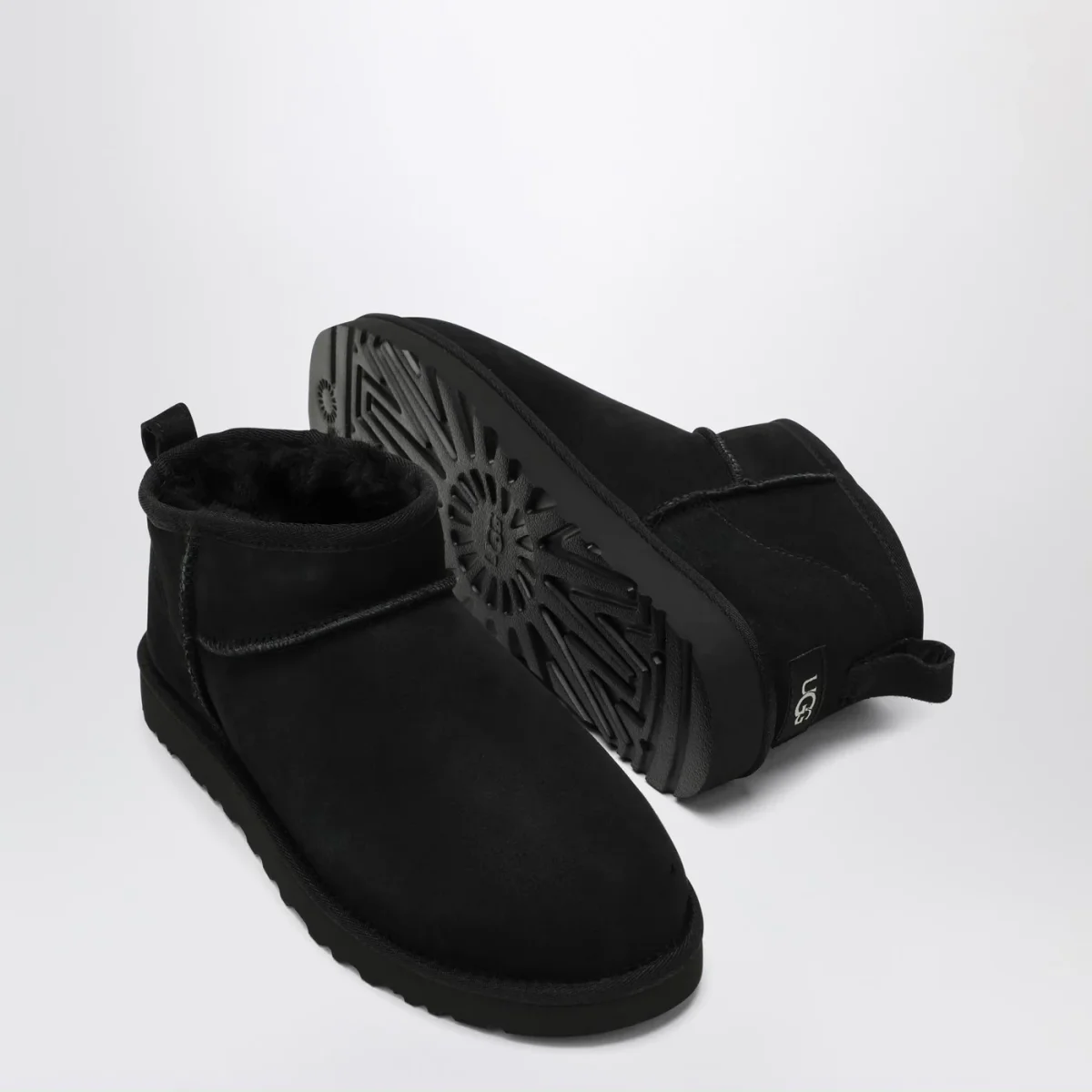 Stivaletti di UGG in montone rovesciato e pelle scamosciata neri, caratterizzati da punta tonda, tirante posteriore, contrafforte del tallone in camoscio, suola interna in schiuma, patch posteriore con logo lettering, bordo in tessuto e suola in gomma.