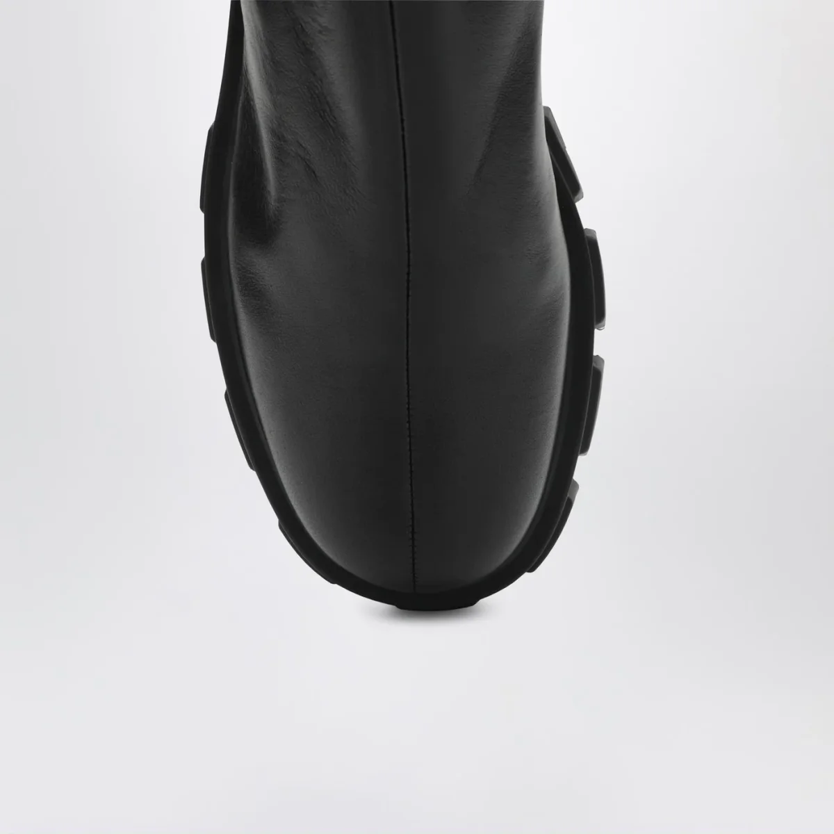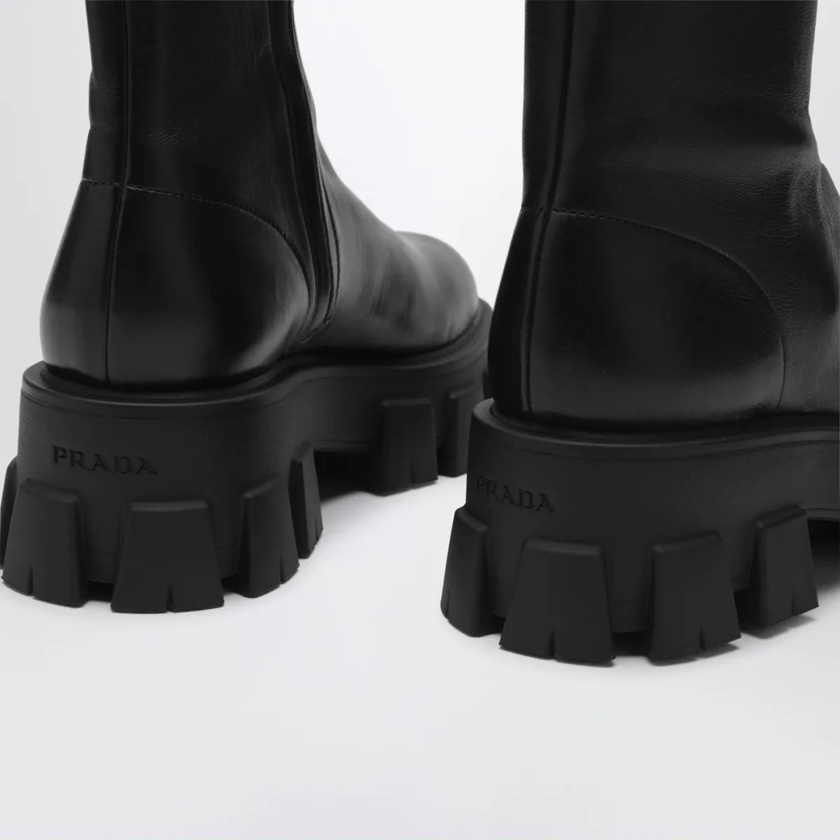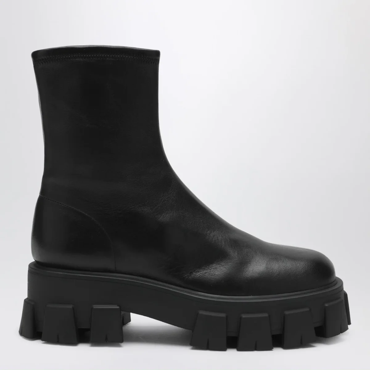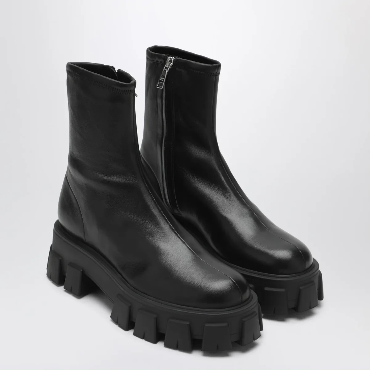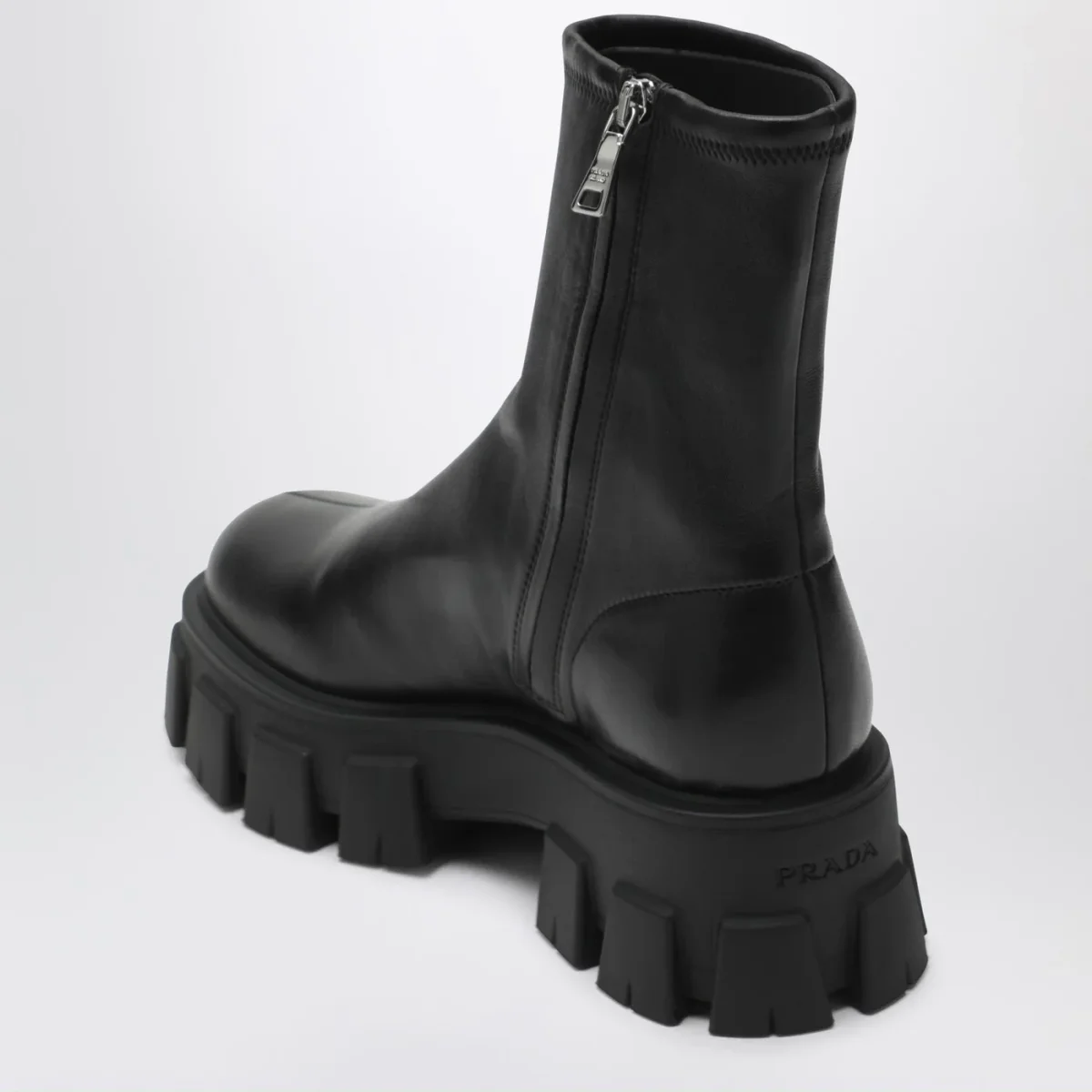 Stivaletti di Prada in nappa stretch neri, caratterizzati da suola in gomma monoblocco con battistrada a tasselli Monolith, fodera in pelle, chiusura con zip laterale, punta tonda e sottopiede estraibile rivestito pelle.
