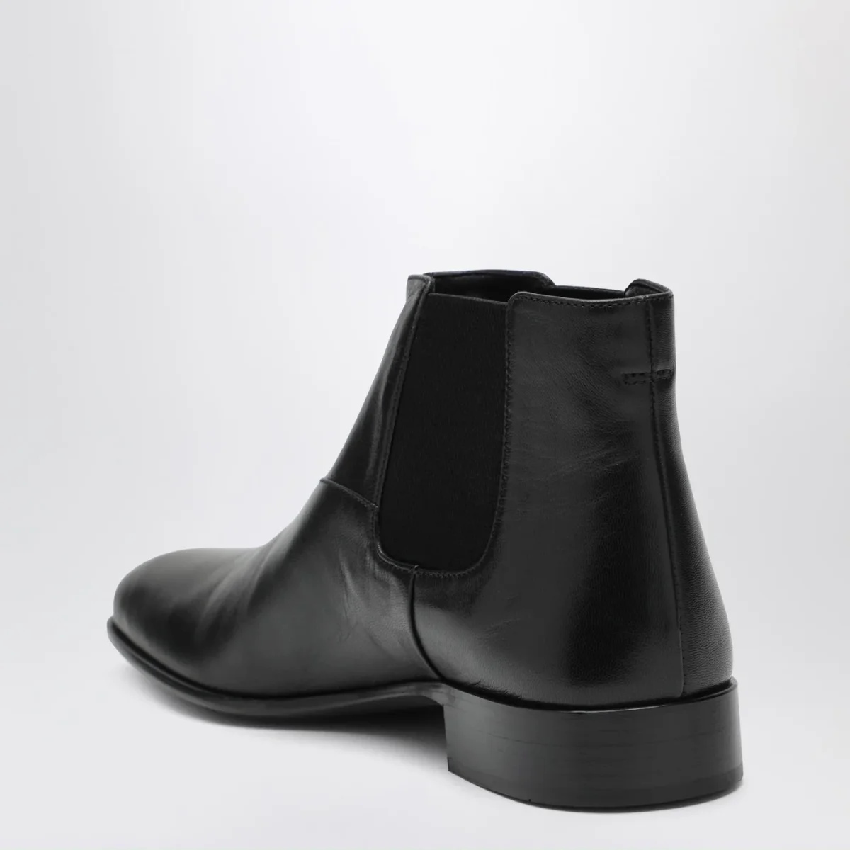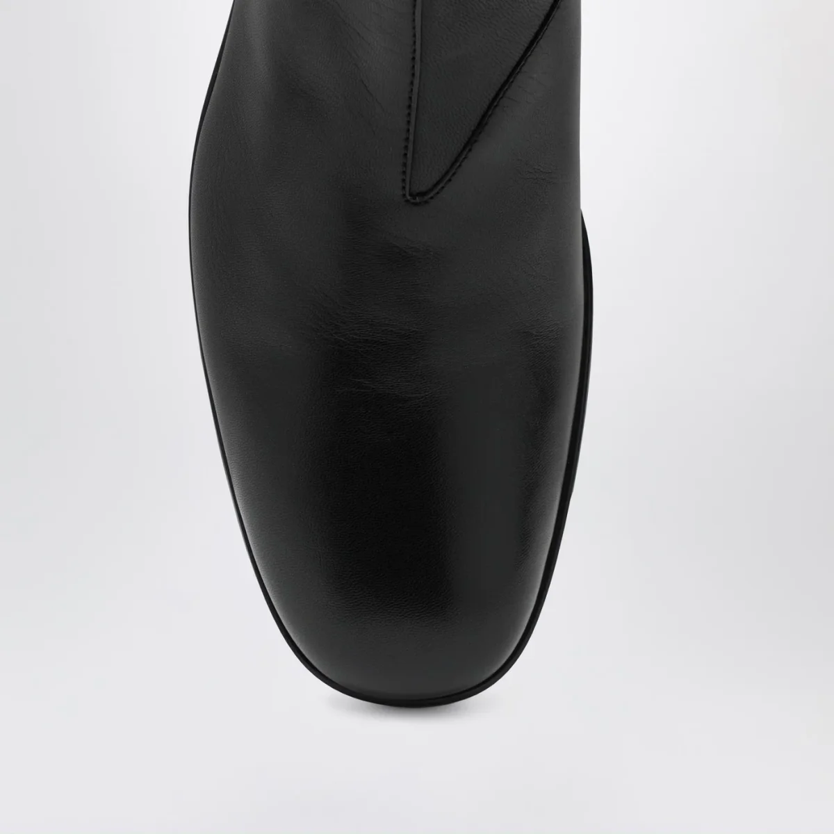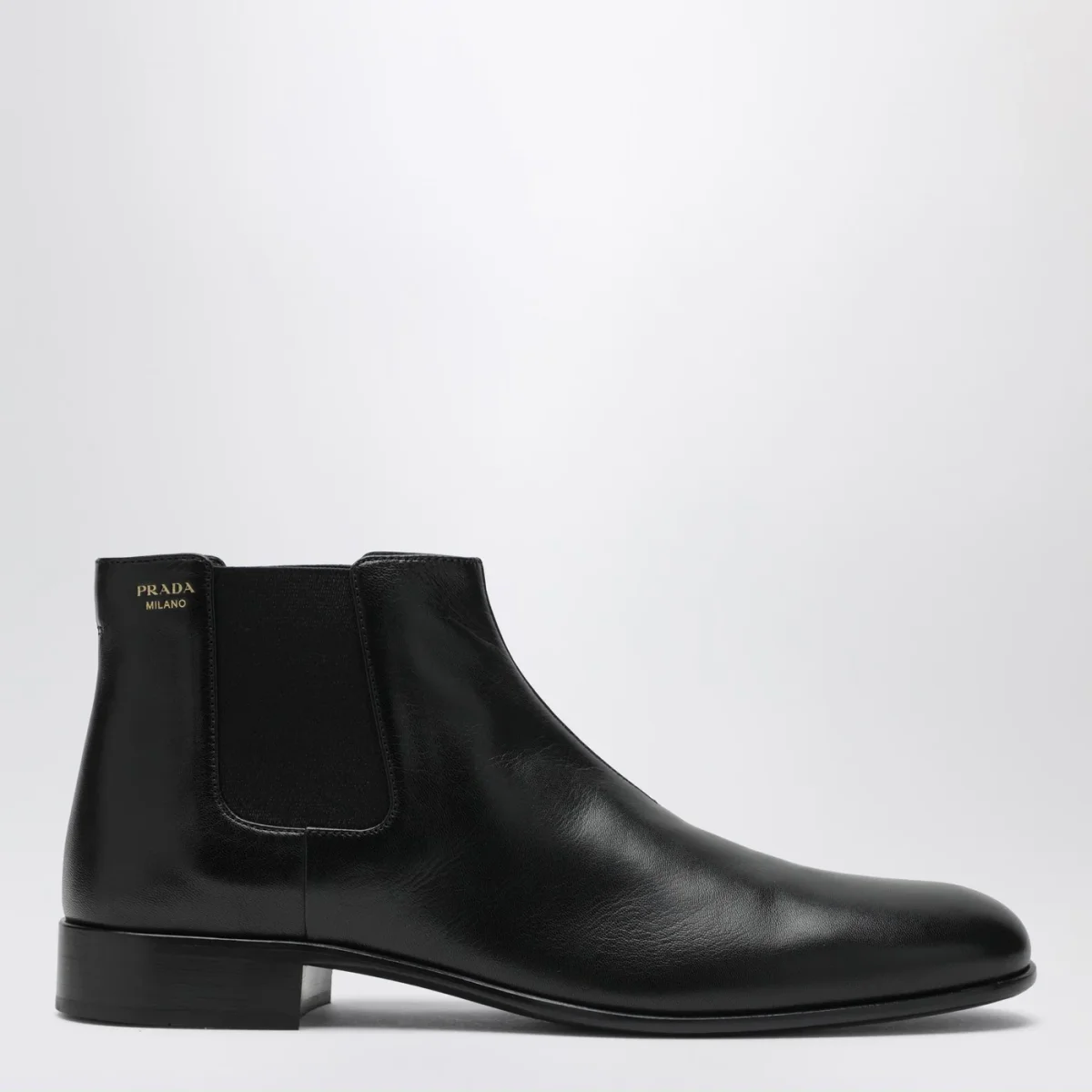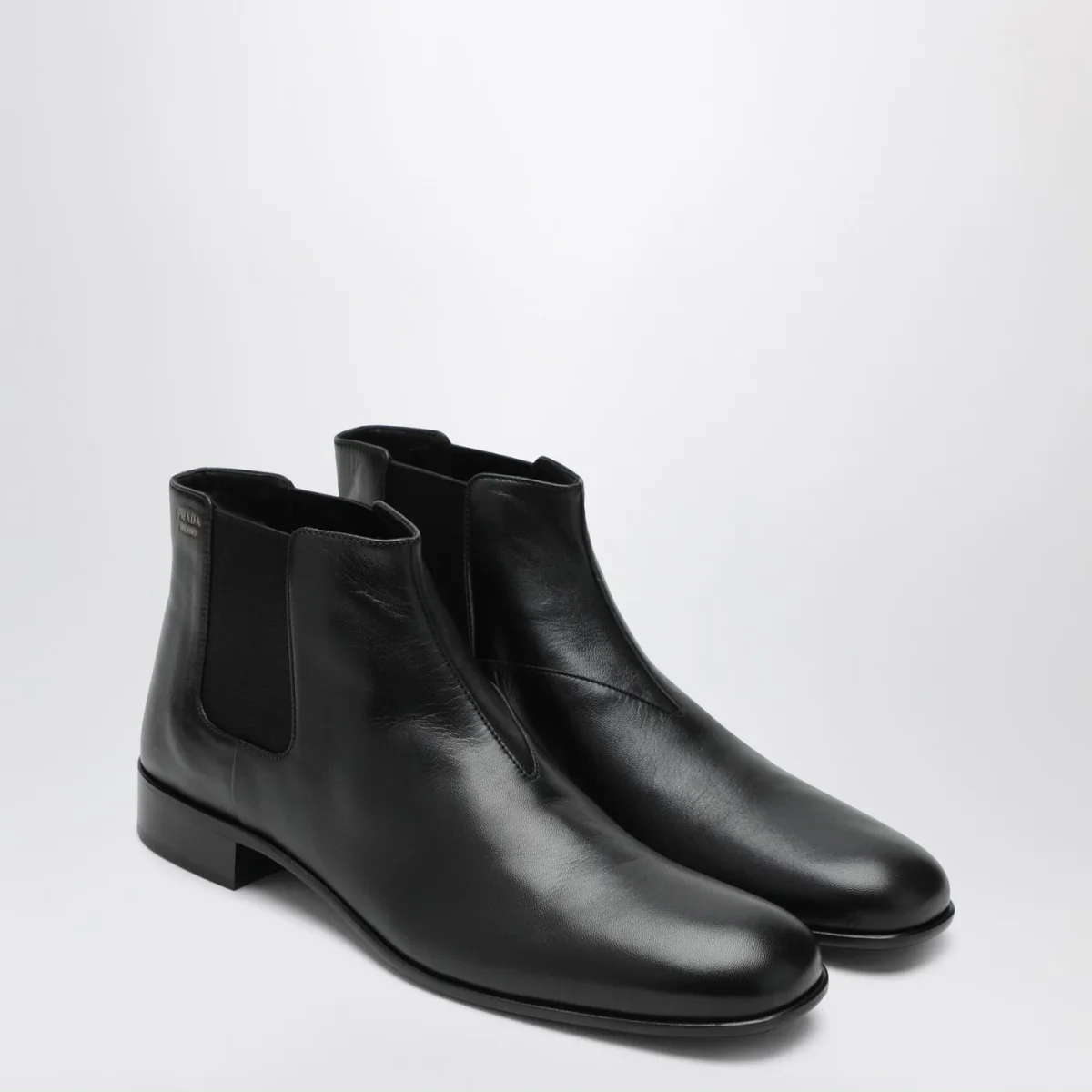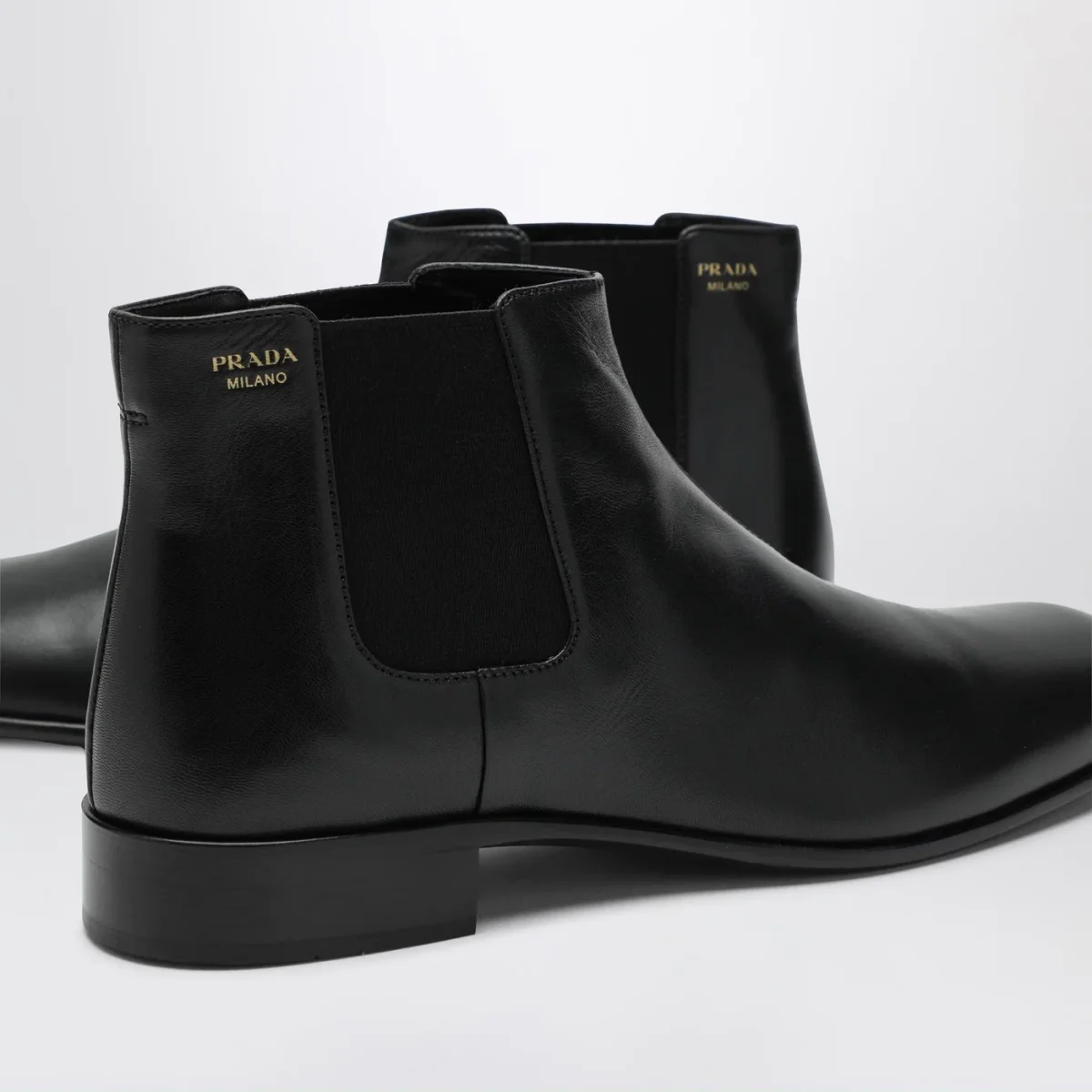 Stivaletti di Prada in pelle neri• tomaia con elastico laterale• tirante posteriore• fodera in pelle• logo lettering serigrafato a contrasto laterale• suola in cuoio• gomma monoblocco con logo a fuoco