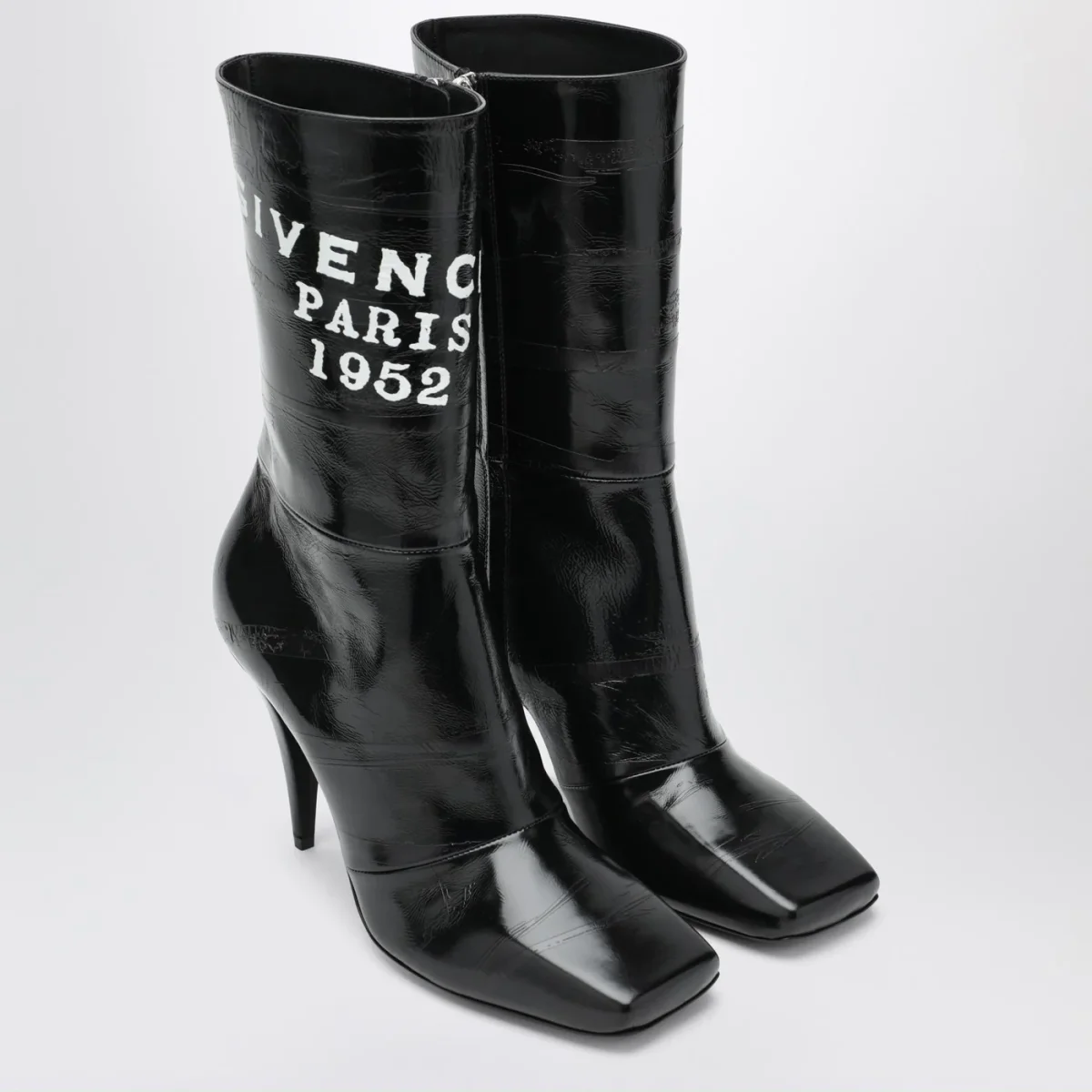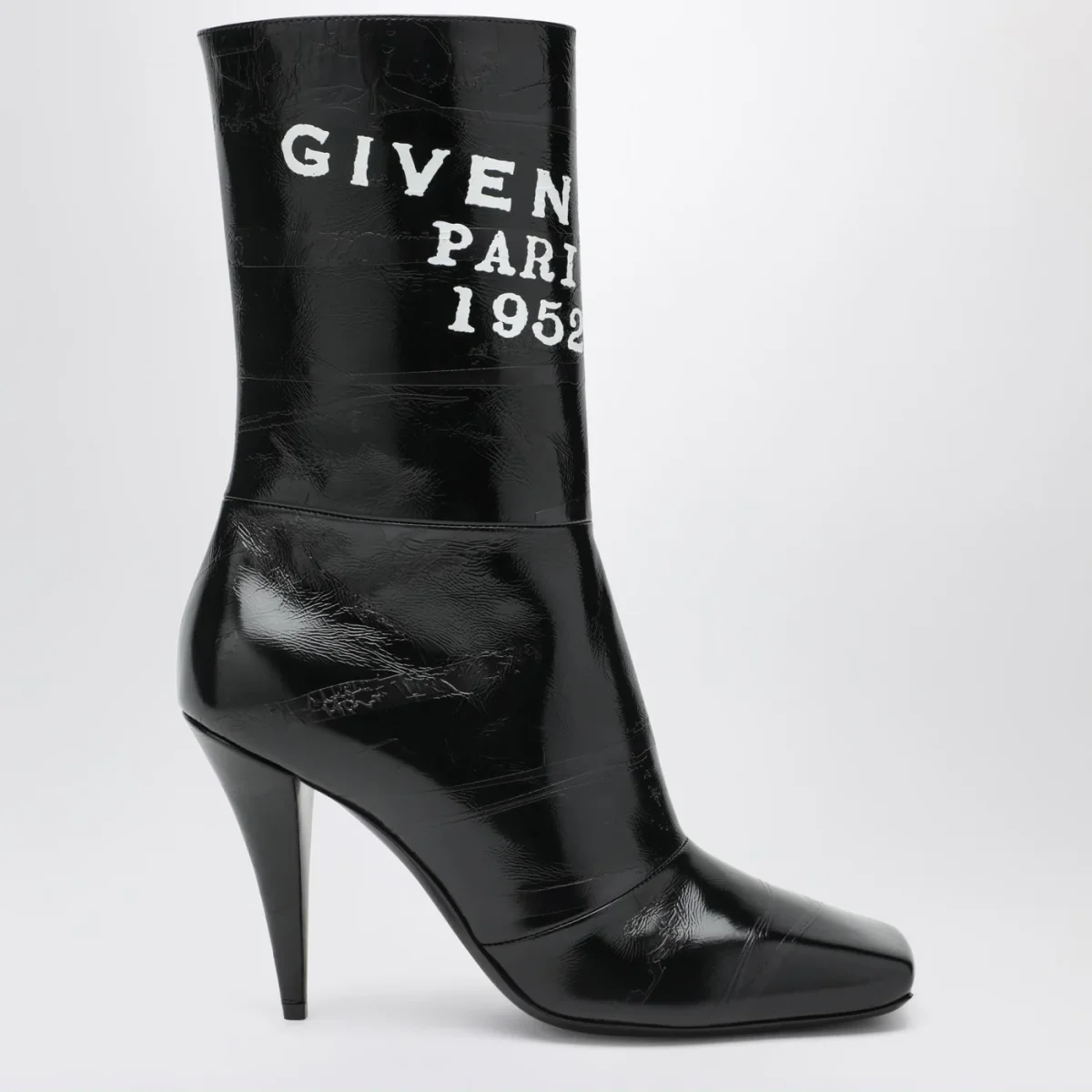 Stivaletti di Givenchy in pelle di vitello lucida neri, caratterizzati da logo lettering Tape stampato sulla parte superiore della scarpa destra. Punta quadrata. Tacco conico curvo. Chiusura con zip e tiralampo con firma GIVENCHY goffrata all’interno del piede. Altezza tacco: 9,5 cm. Modello confortevole.