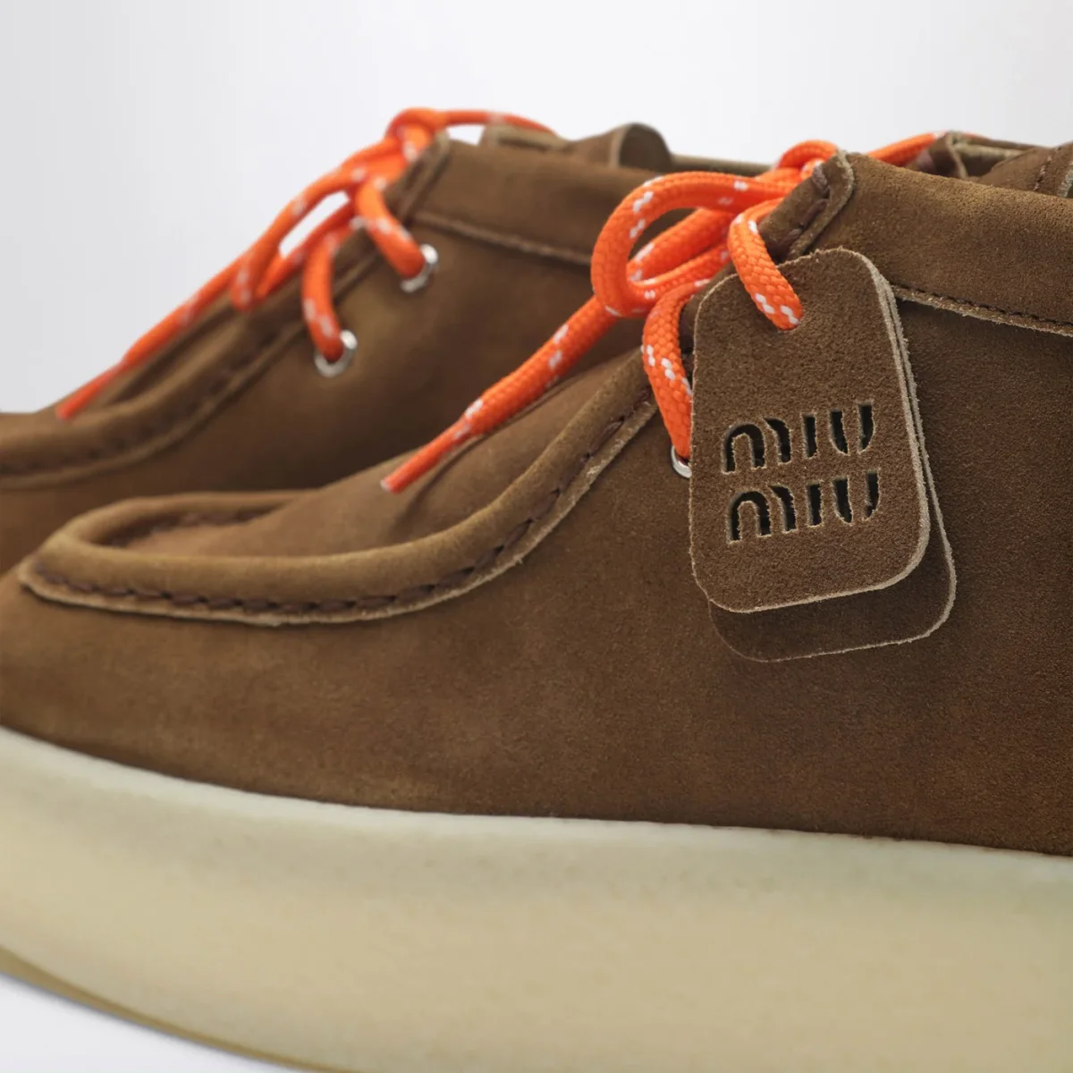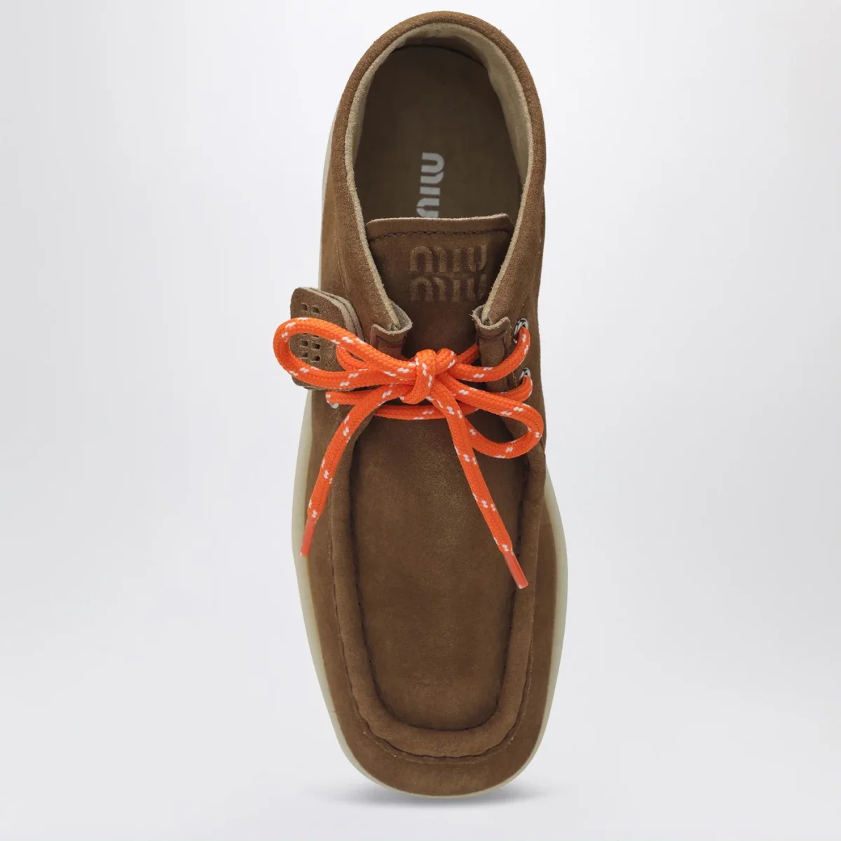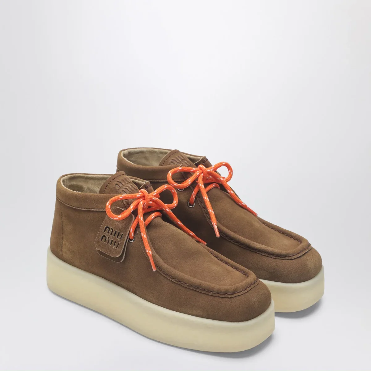 Stivaletti di Miu Miu in pelle scamosciata color cannella, caratterizzata da lacci arancione, etichetta con logo, logo impresso sulla linguetta, suola platform e suola in gomma.