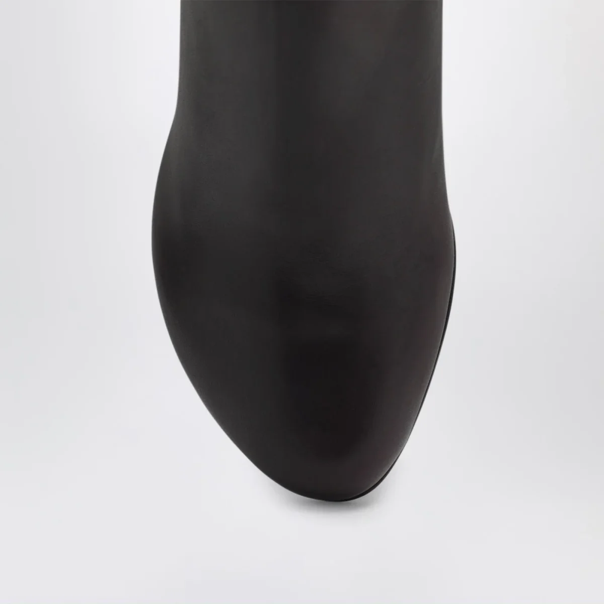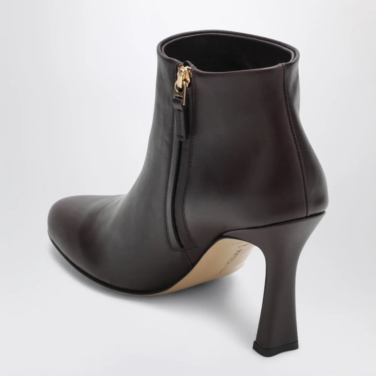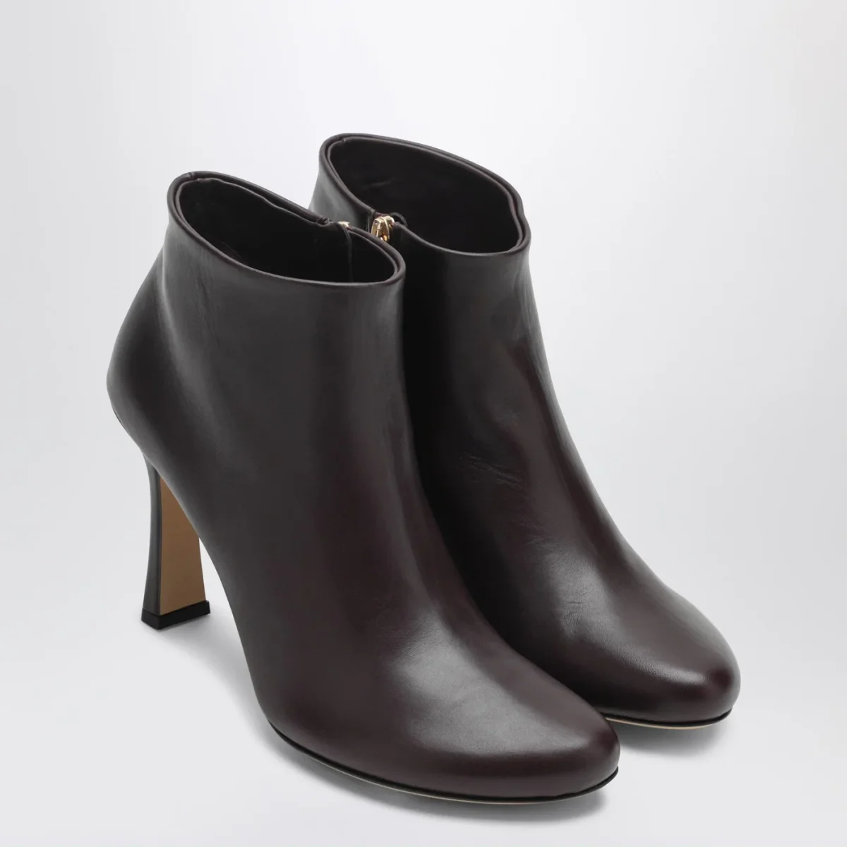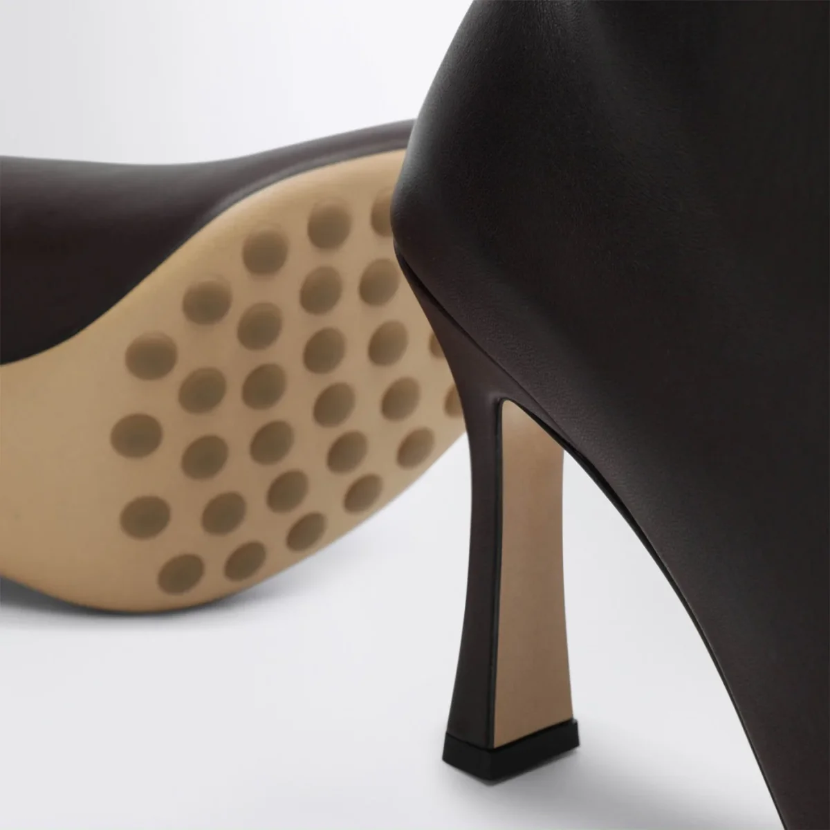 Stivaletto di Bottega Veneta in pelle color Barolo scuro, caratterizzata da punta a mandorla, chiusura laterale con zip, tacco alto spesso e suola in pelle e gomma iniettata.